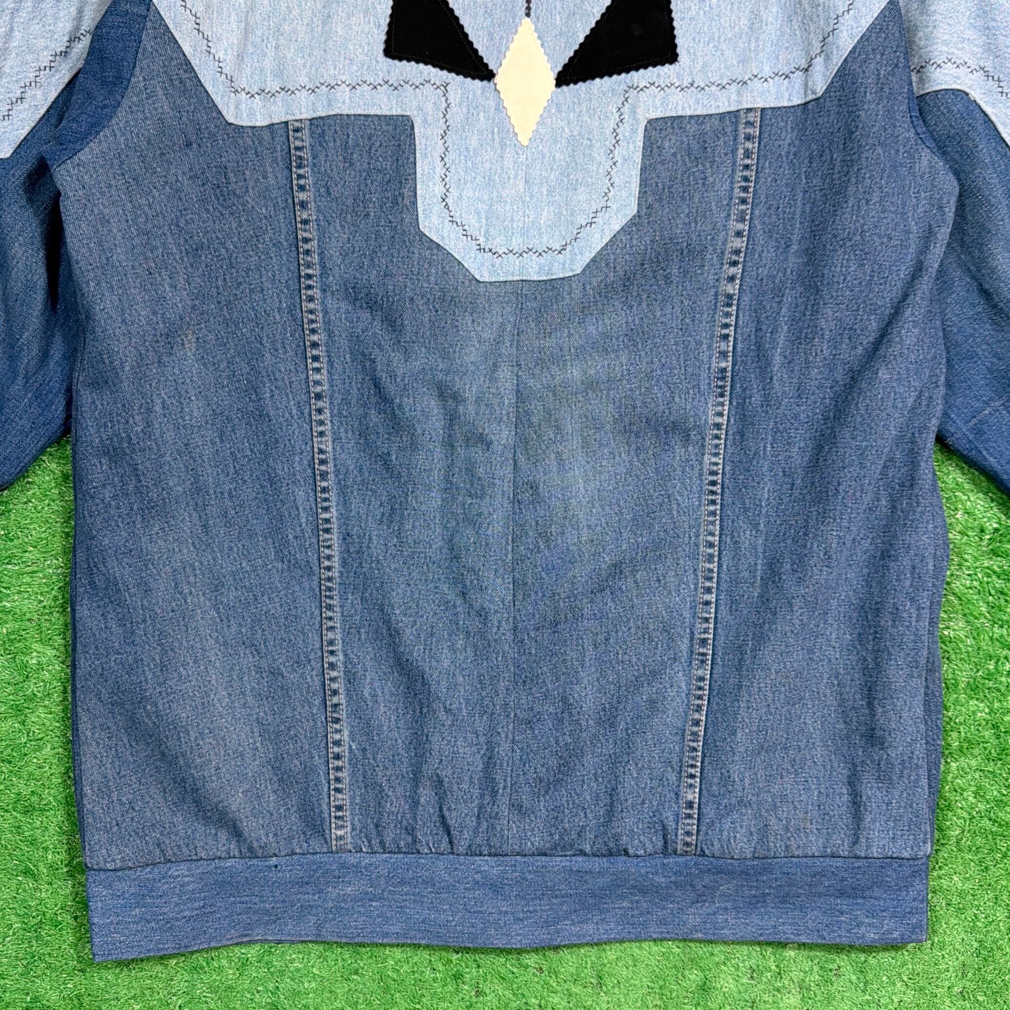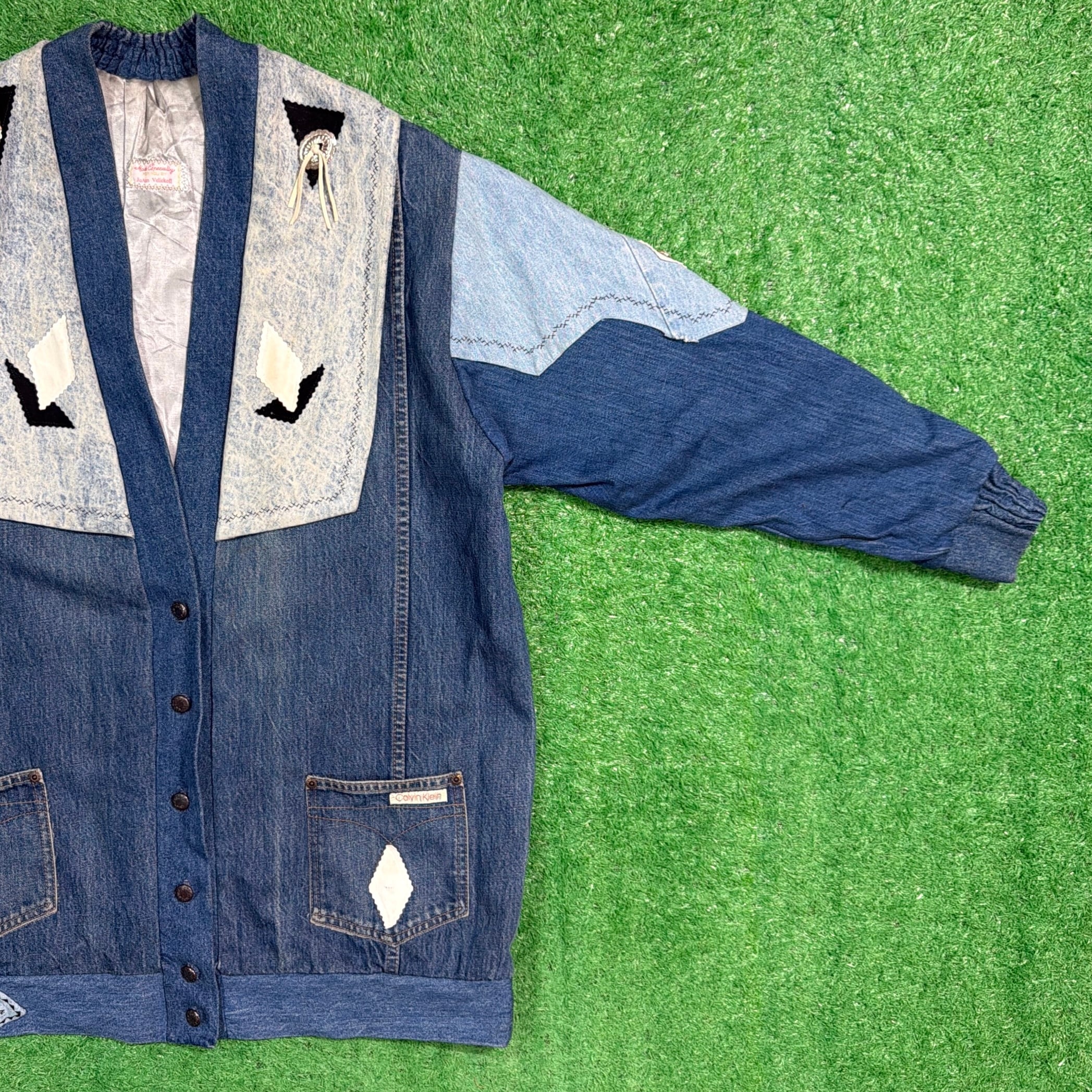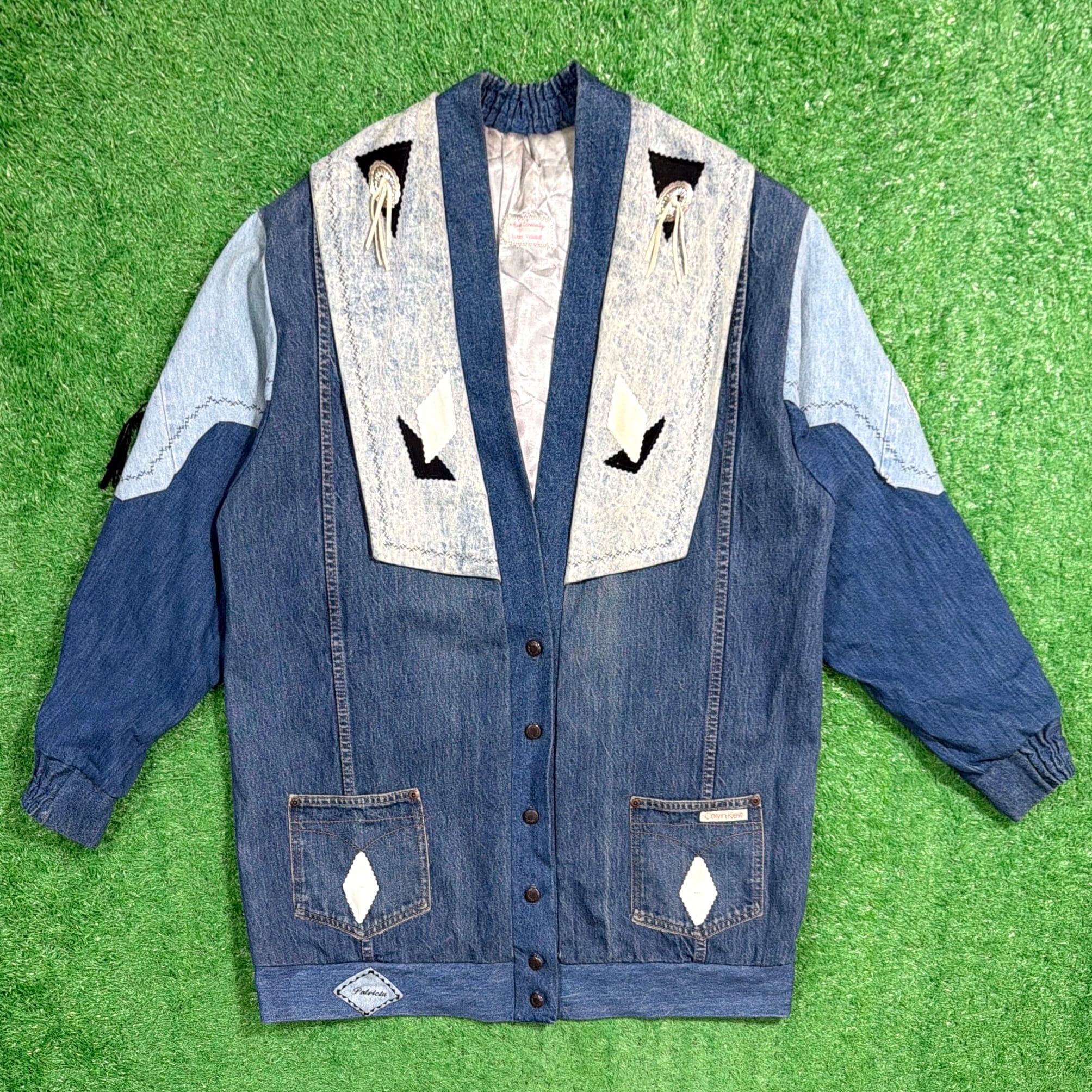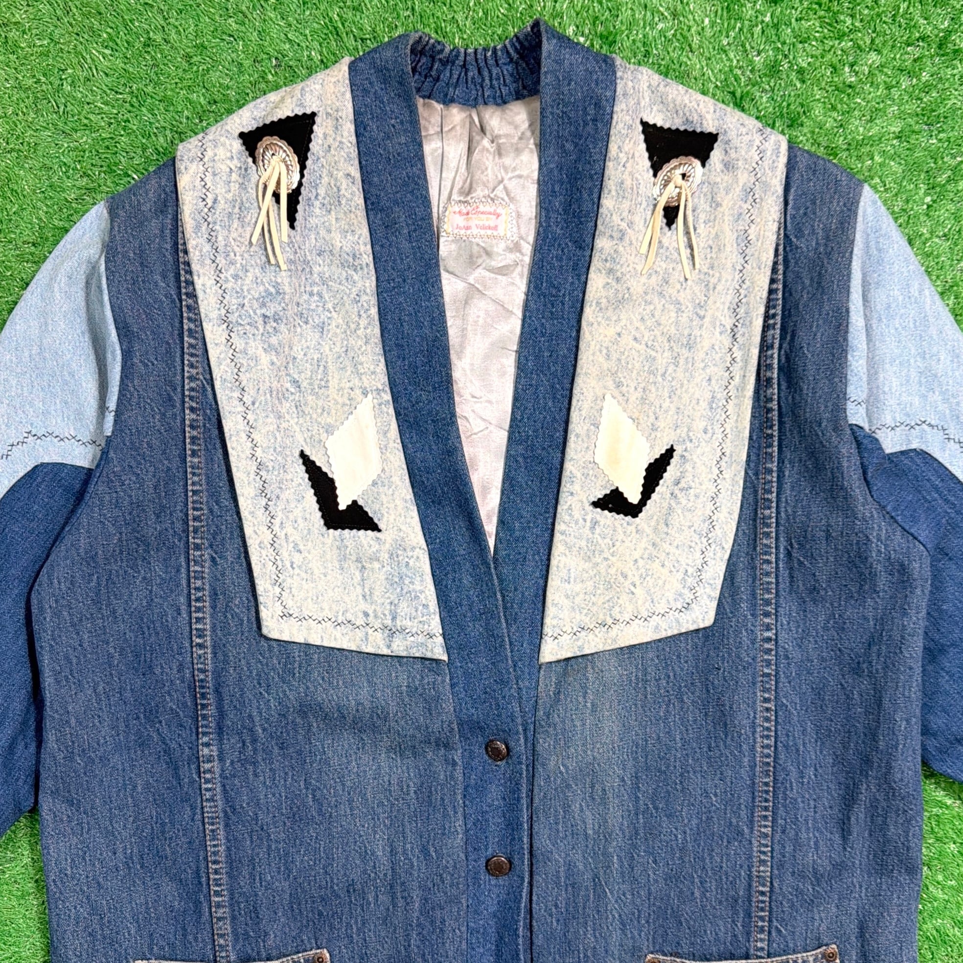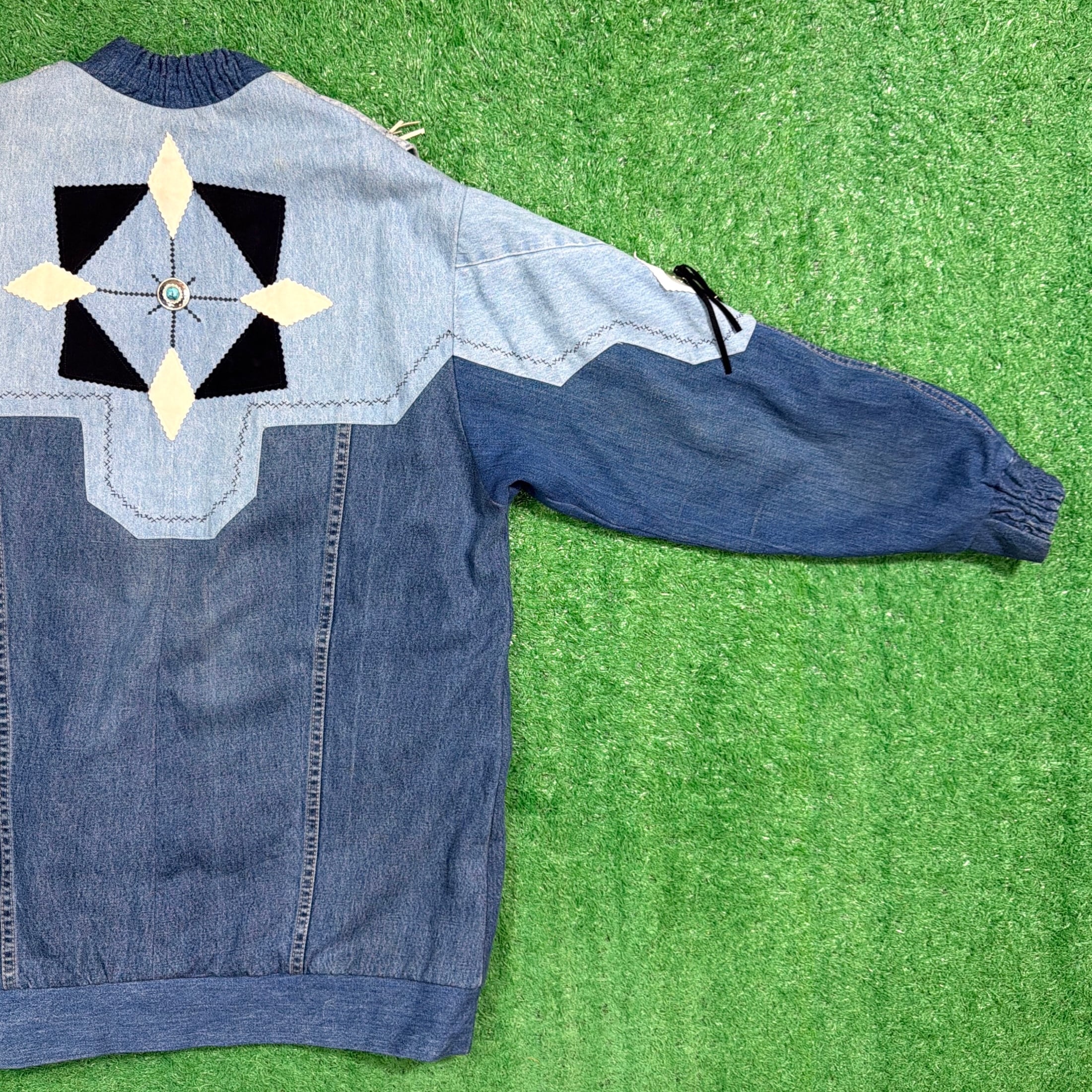 【Unisex】 コンチョ付き ネイティブ デザイン リメイク デニムジャケット / 古着 羽織 カーディガン デニム ジャケット ケミカルウォッシュ メンズ レディース 1101