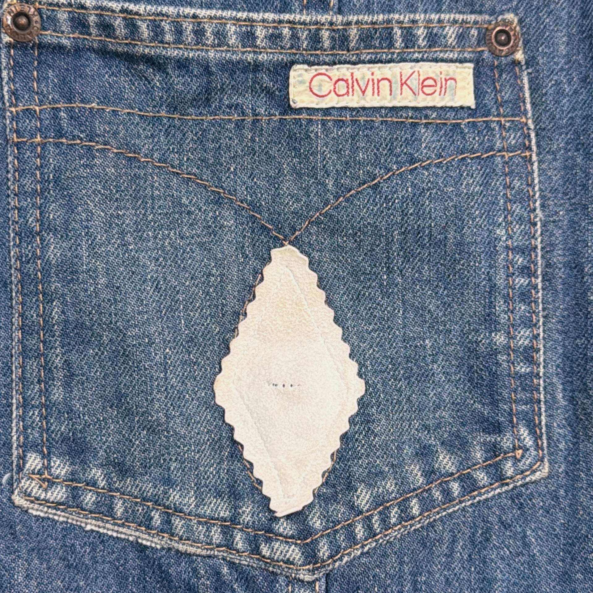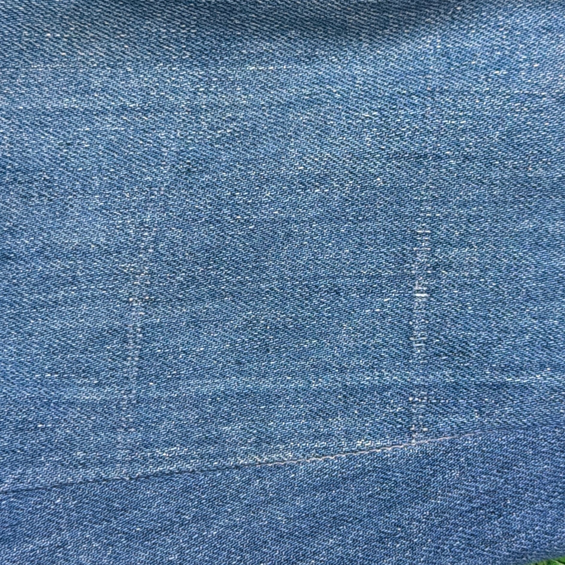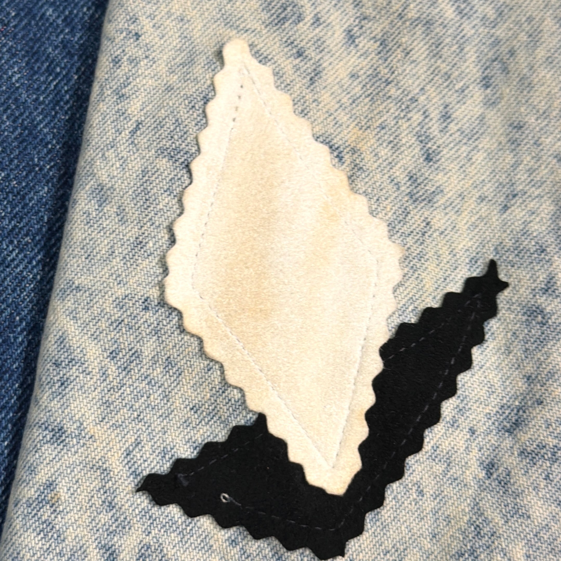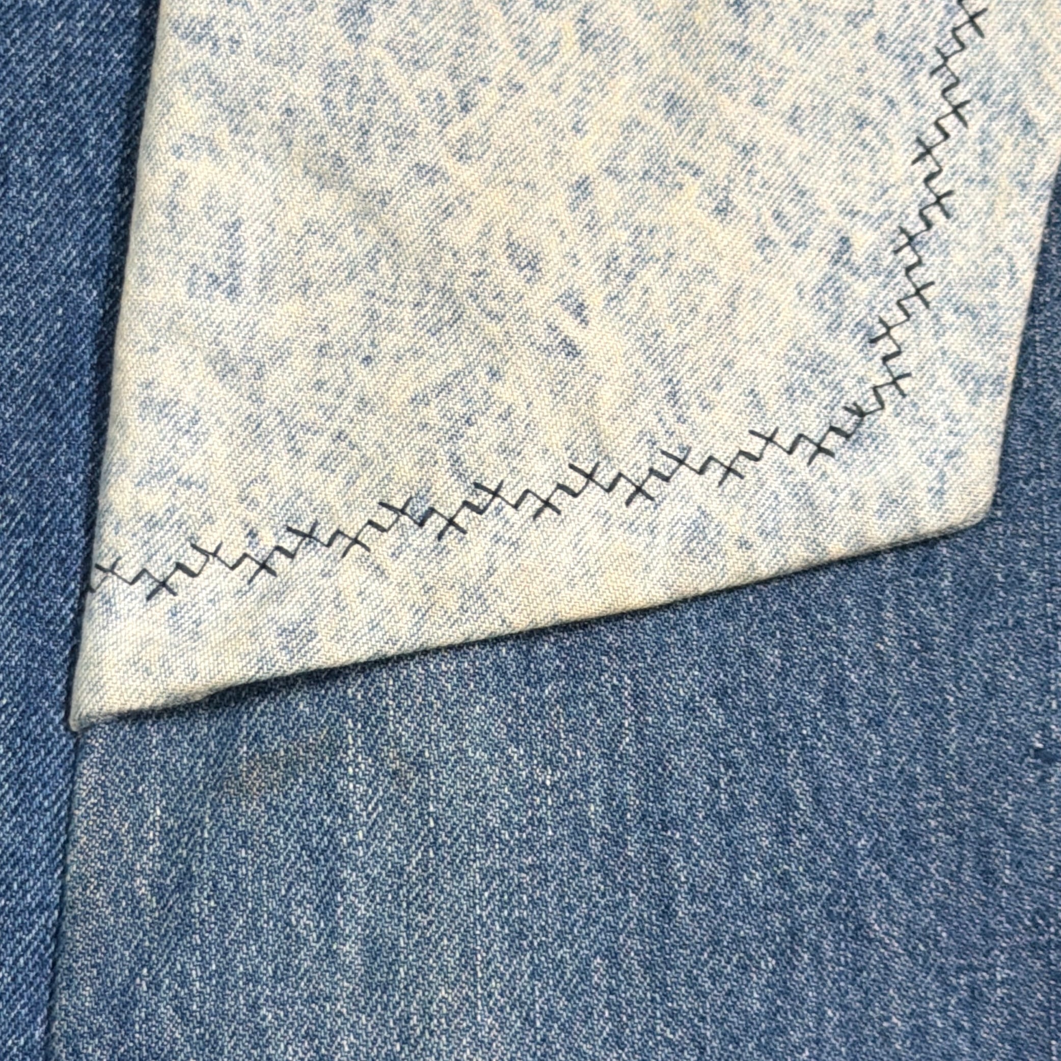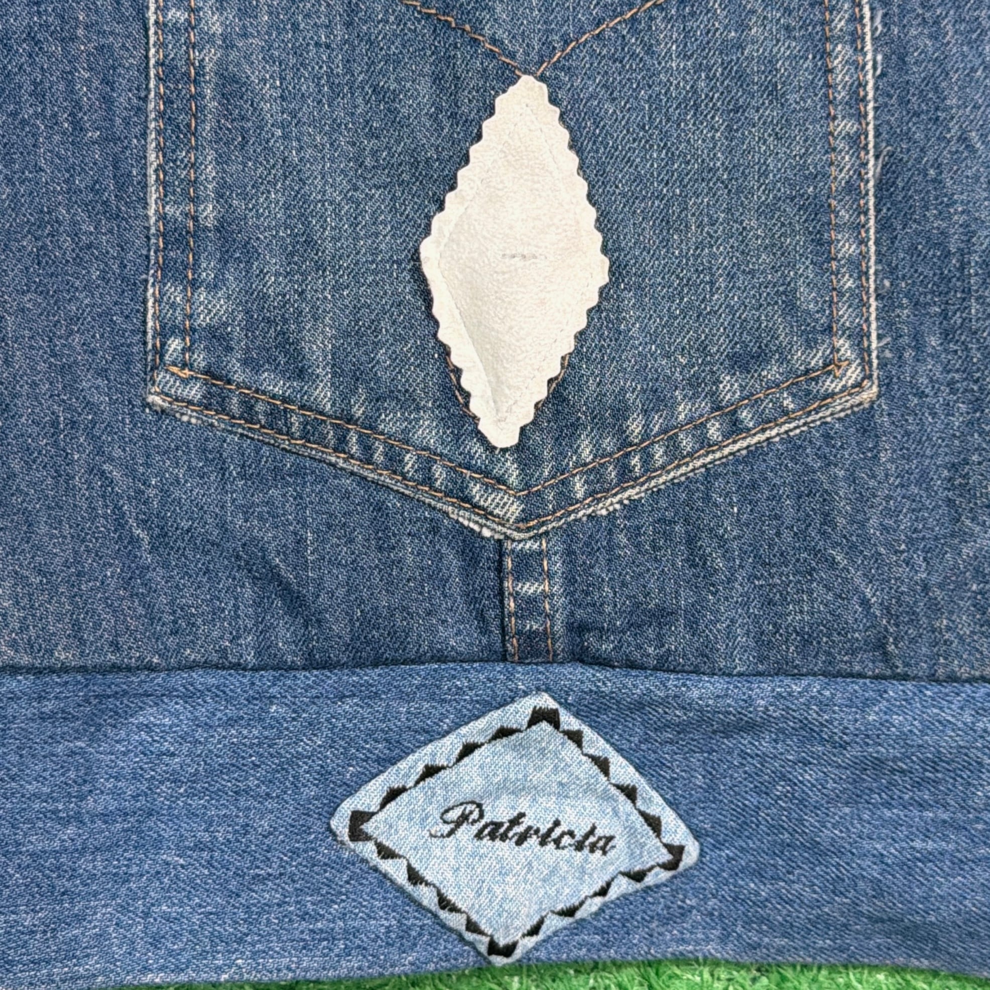 フロントにはコンチョボタンをあしらい、胸元や背面には幾何学的なパッチワークデザインが施されています。淡いケミカルウォッシュとインディゴの切り替えが雰囲気抜群で、ハンドメイド感のある一点ものの魅力が詰まっています。