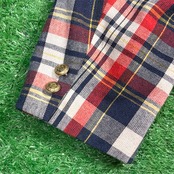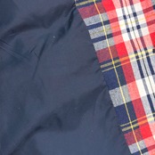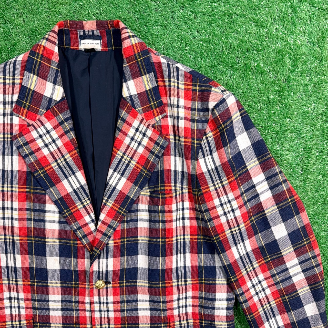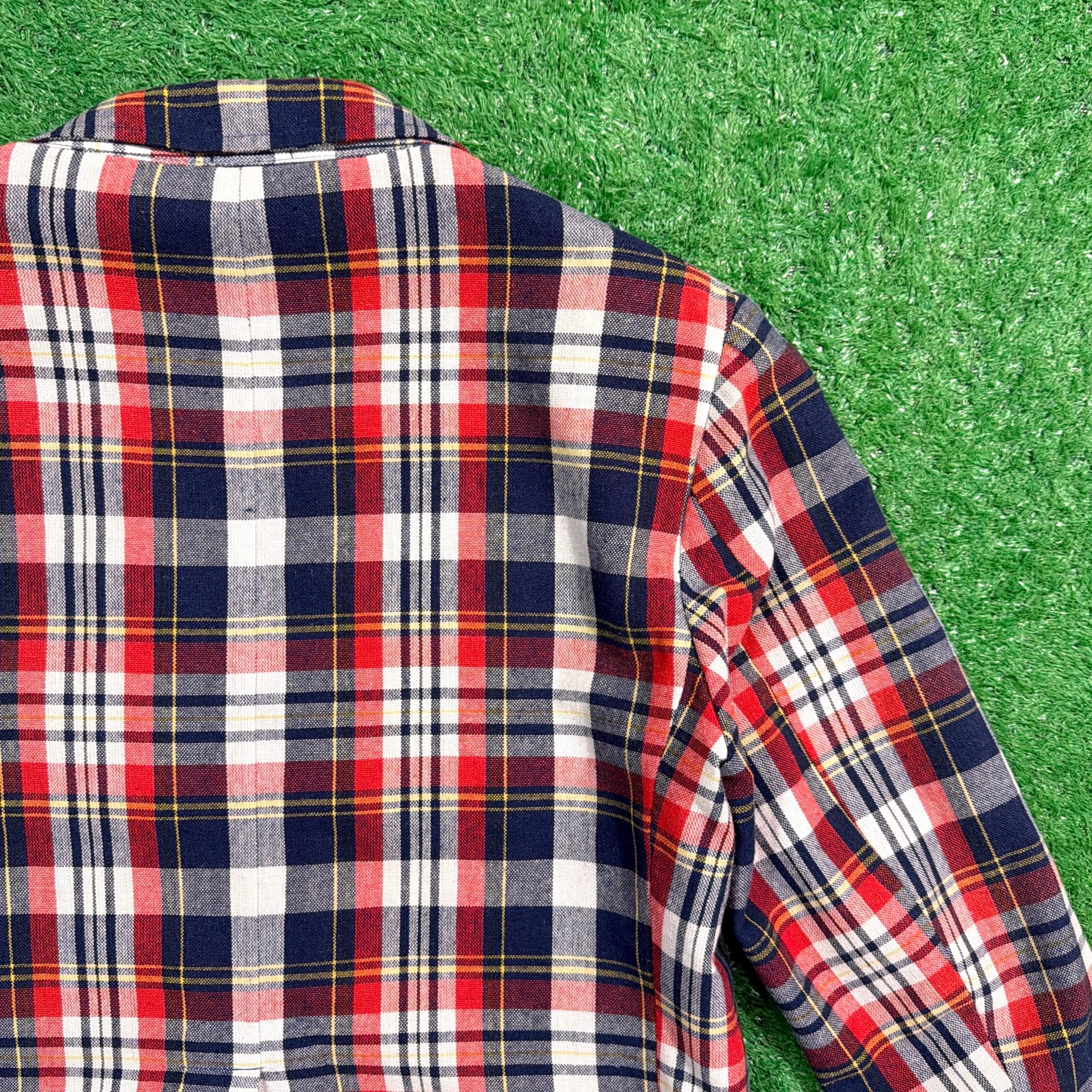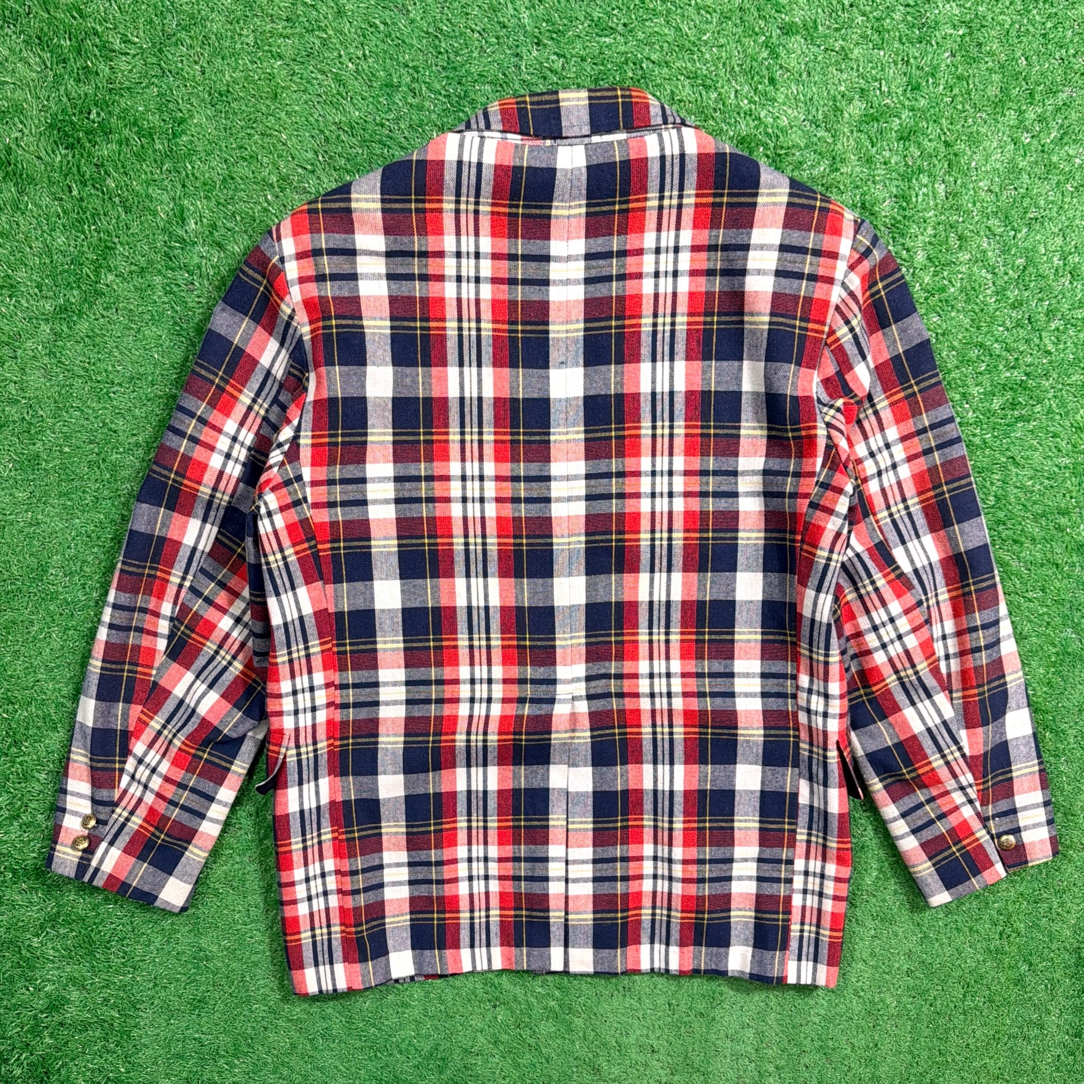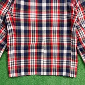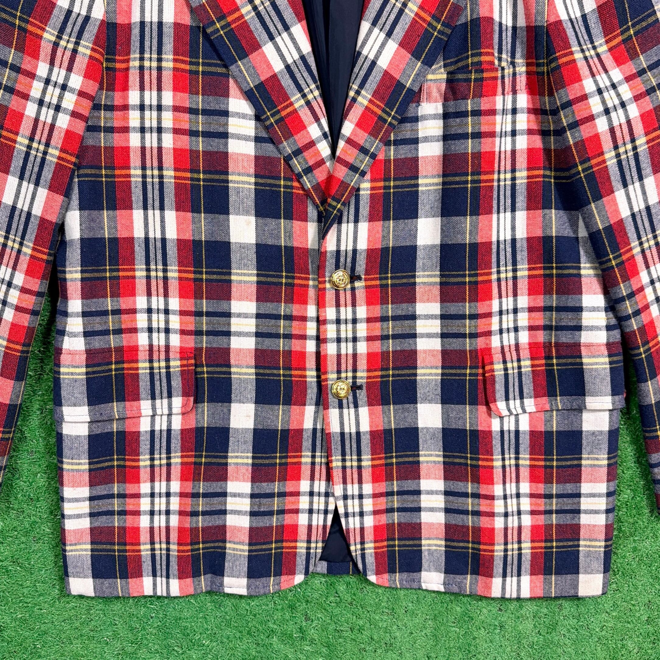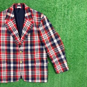 ネイビー・レッド・ホワイトのコントラストが効いたトラッドな配色で、アメリカンプレッピーなムード漂う一着。程よく厚みのある生地感で、ジャケットながらも軽やかに羽織れるアイテムです。ゴールドボタンがアクセントになり、クラシックな雰囲気を引き立てています。