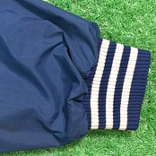 深みのあるブルーに、襟と袖口、裾のストライプリブがアクセントになったクラシックなデザイン。軽量でシャカシャカしたナイロン素材を使用しており、スポーティで爽やかな印象の一着です。スナップボタン仕様で着脱もしやすく、さらっと羽織れるライトアウターとして活躍します。