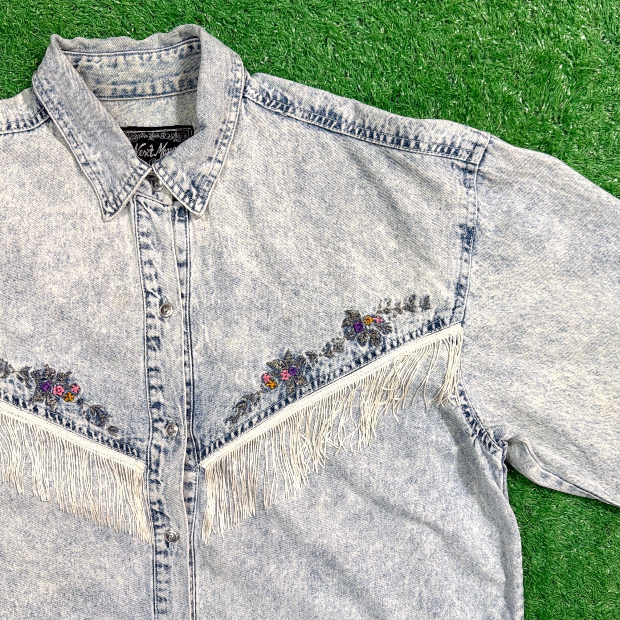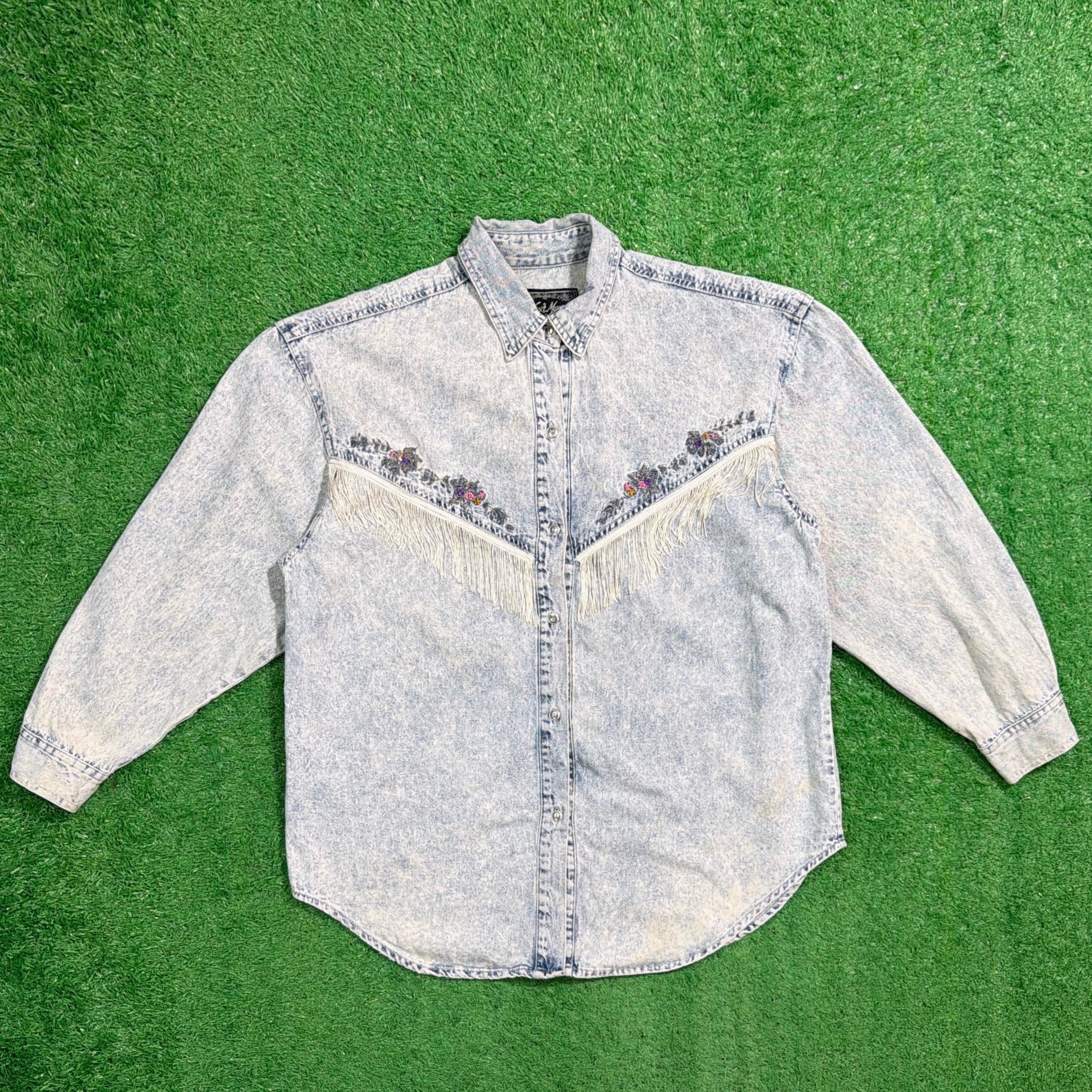 1990年代のフリンジ付きケミカルウォッシュデニムシャツです。