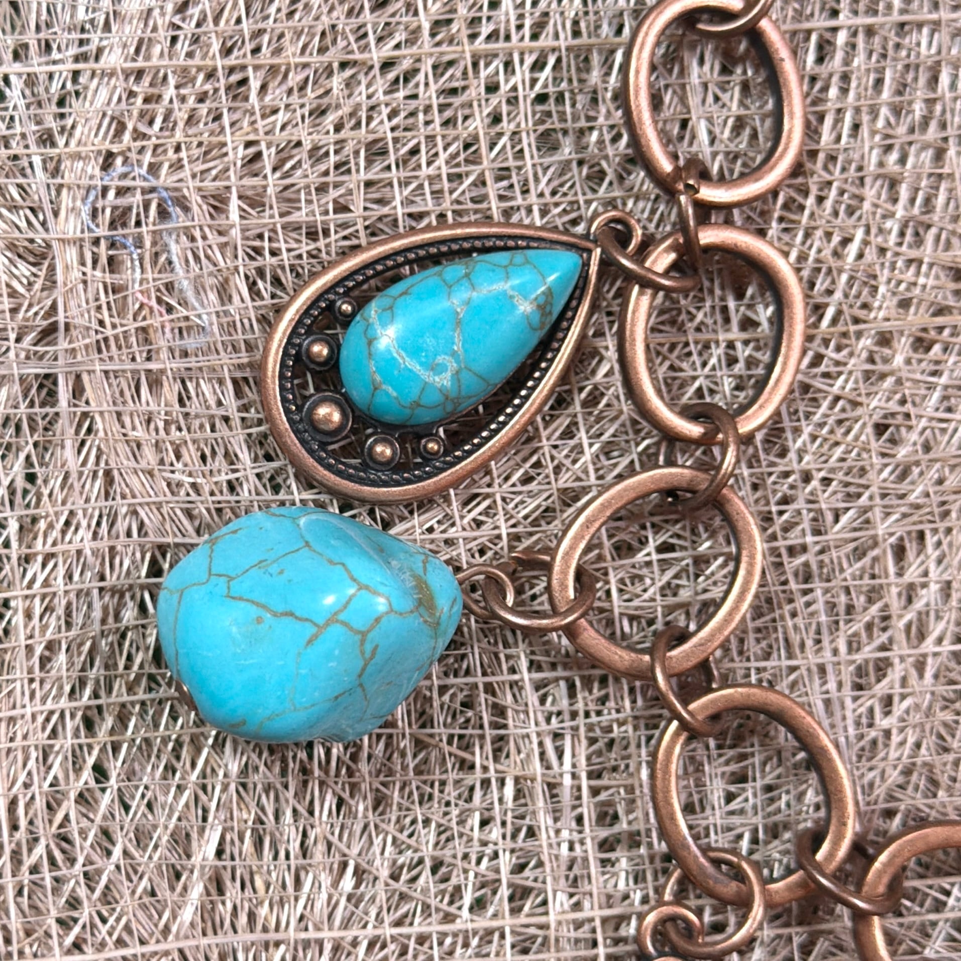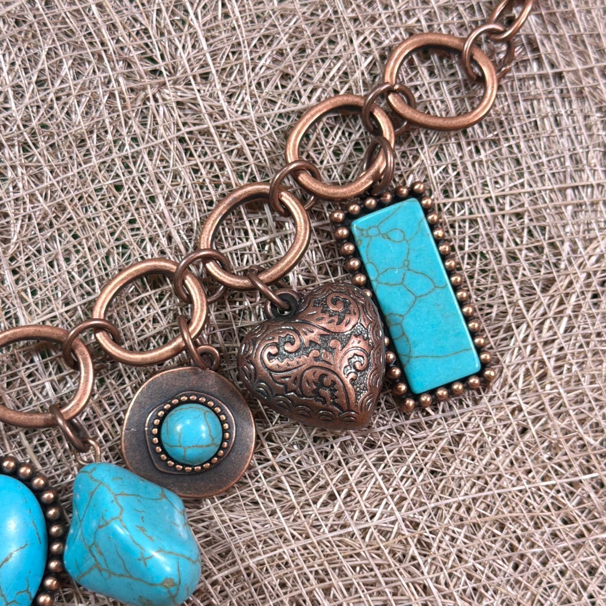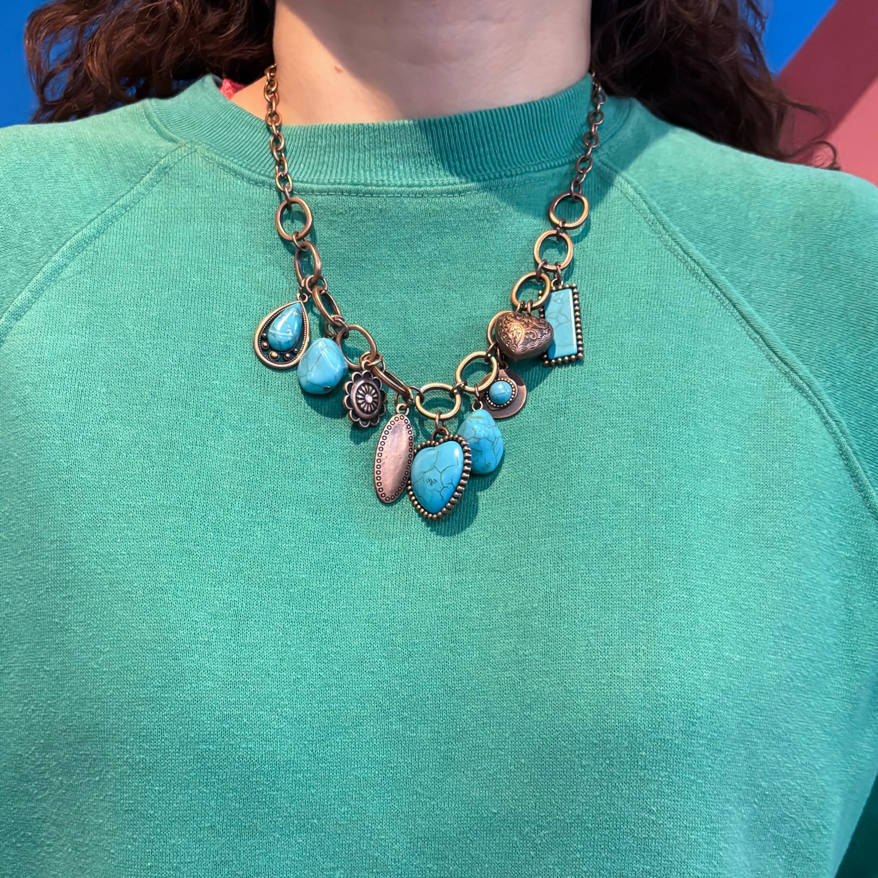 ターコイズブルーのチャームとコンチョモチーフが組み合わさった、ブロンズカラーのネックレスです。異なる形のターコイズパーツやハートモチーフが並び、アメリカンヴィンテージの雰囲気漂うデザイン。ややくすんだブロンズの質感が味わい深く、カジュアルにもエスニックにも馴染む一点です。ユニセックスで楽しめる存在感あるアクセサリーです。