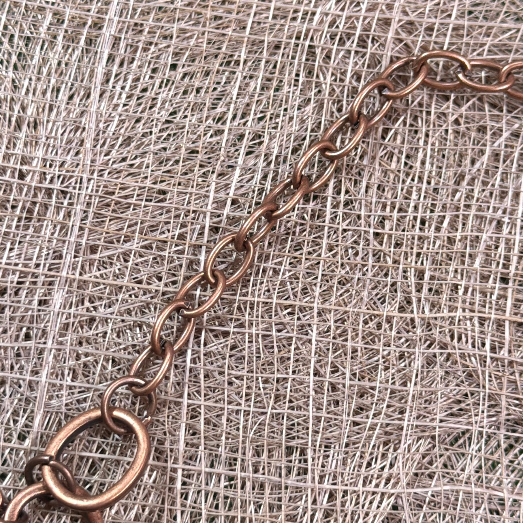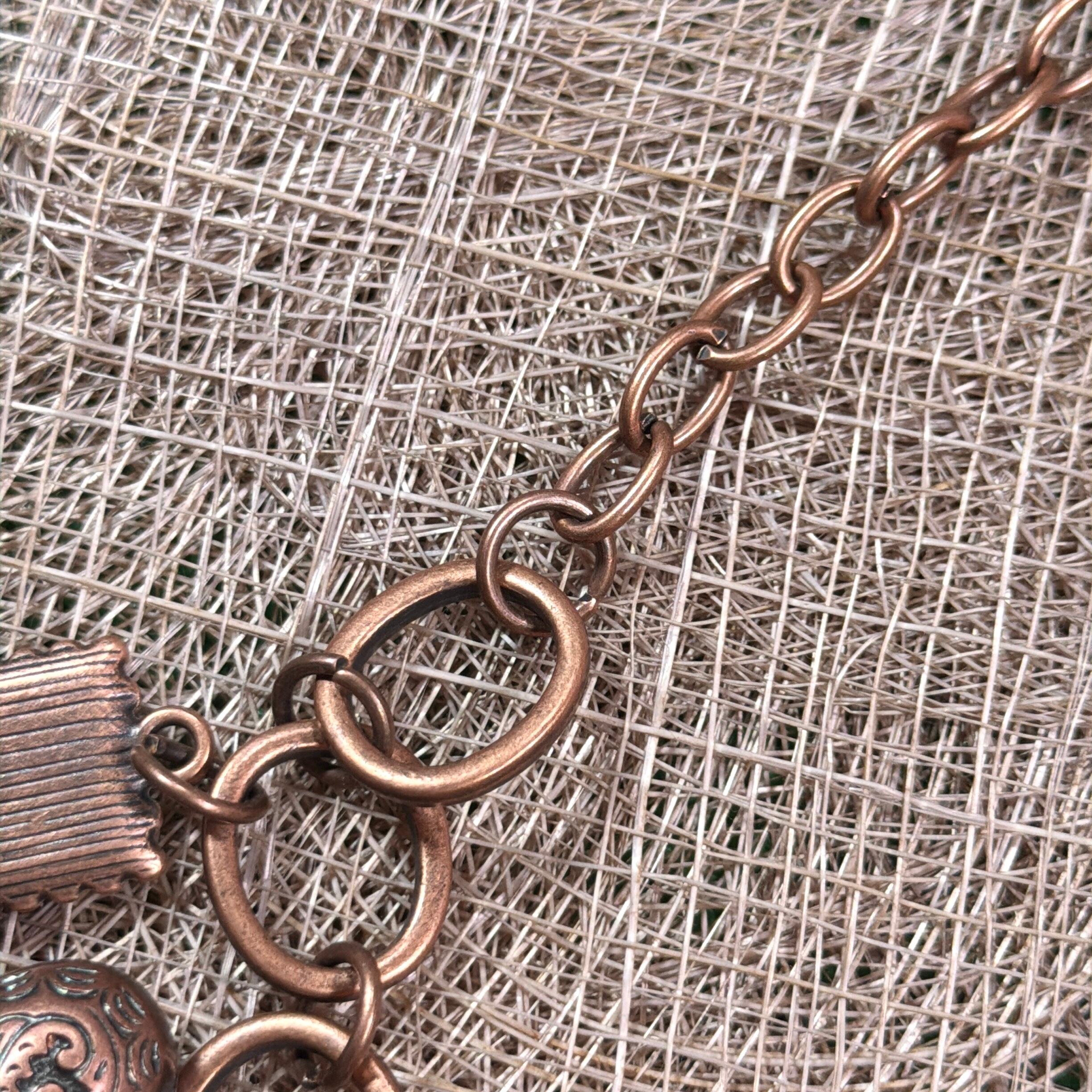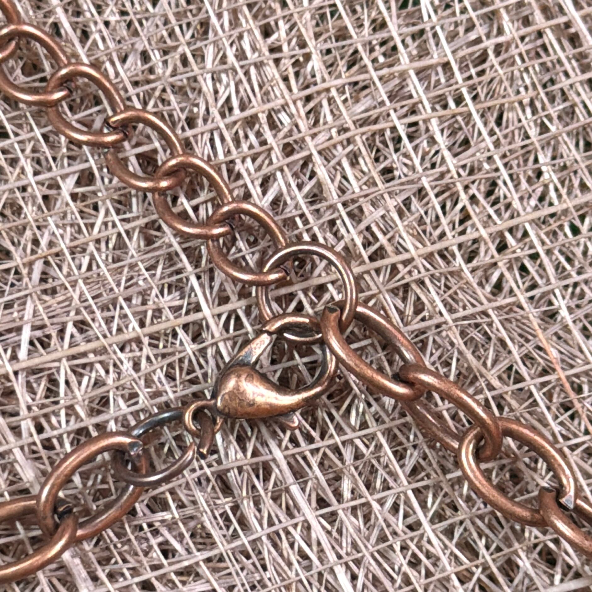ターコイズブルーのチャームとコンチョモチーフが組み合わさった、ブロンズカラーのネックレスです。異なる形のターコイズパーツやハートモチーフが並び、アメリカンヴィンテージの雰囲気漂うデザイン。ややくすんだブロンズの質感が味わい深く、カジュアルにもエスニックにも馴染む一点です。ユニセックスで楽しめる存在感あるアクセサリーです。