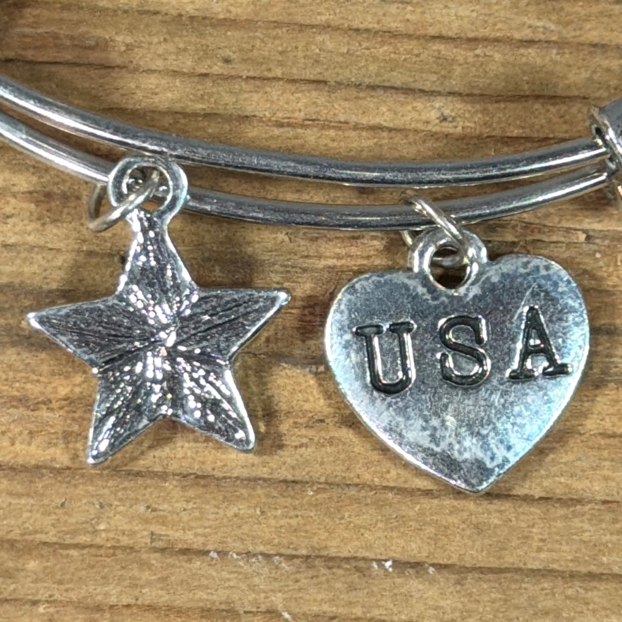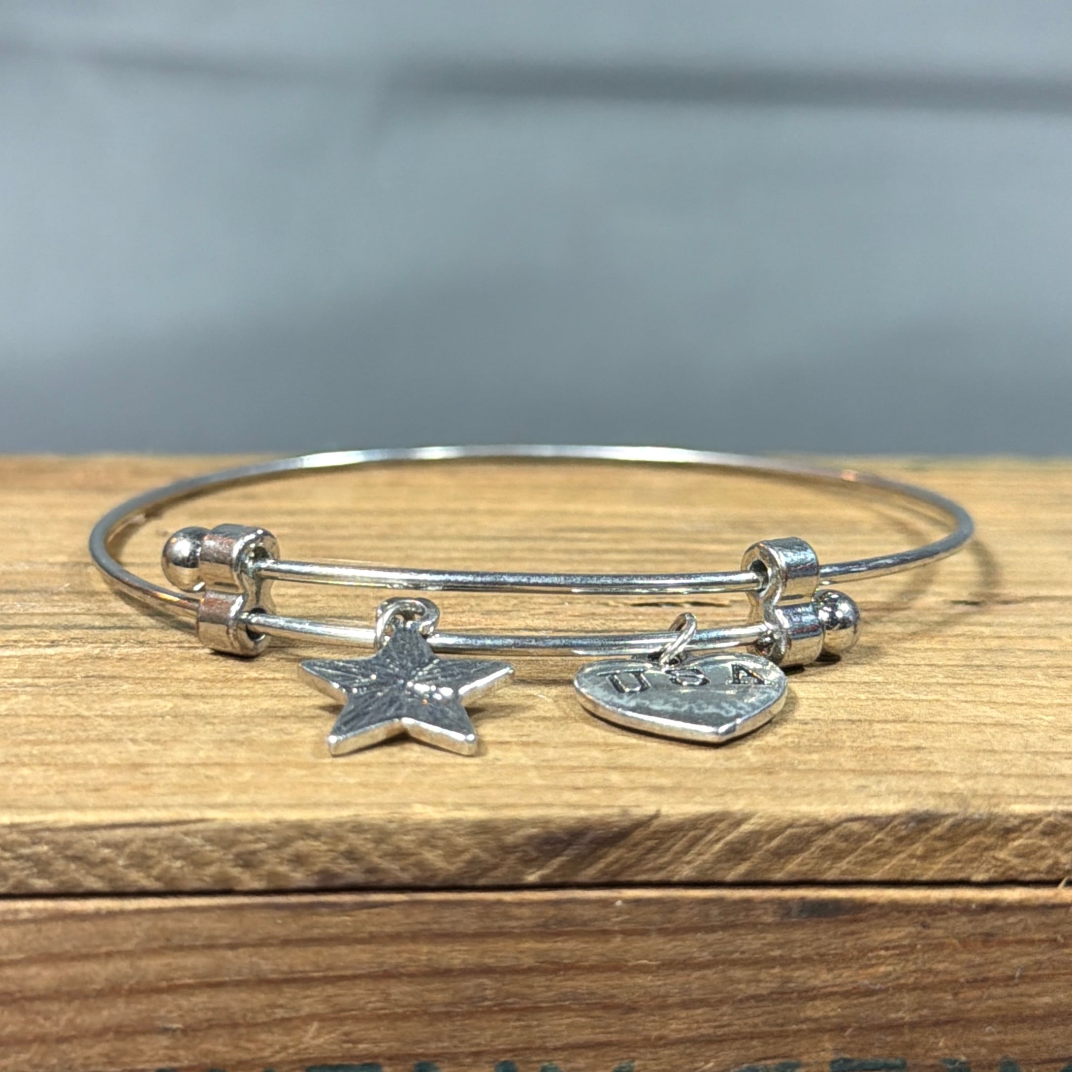 「love」とUSAの文字が刻まれたハートモチーフと、程よくくすんだスターのチャームがアクセントになったデザイン。細身のバングルタイプで、シンプルながらも存在感のある仕上がりです。軽やかな印象で、男女問わず取り入れやすいアイテムです。
