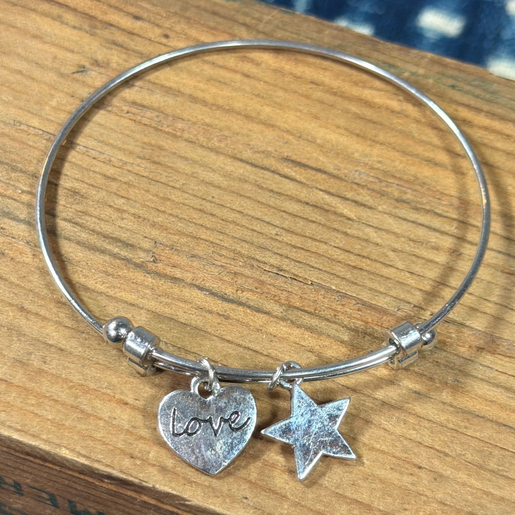 ハートとスターのチャームが付いた、シルバーカラーのワイヤーブレスレットです。