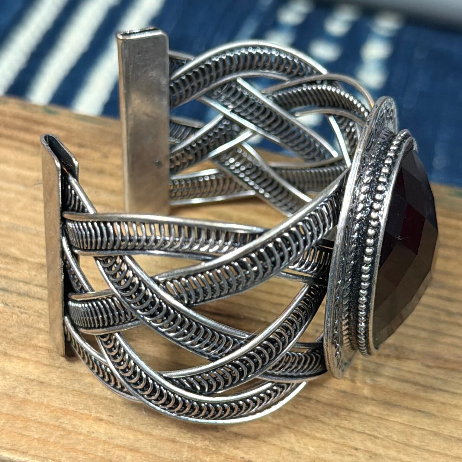 メタルベースには繊細な彫り模様が施され、中央のオーバル型モチーフがクラシカルな印象を与えます。複雑に編み込まれたバンドデザインも特徴的で、重厚感のあるヴィンテージアクセサリーらしい雰囲気。ユニセックスで使えるアートピースのような一本です。