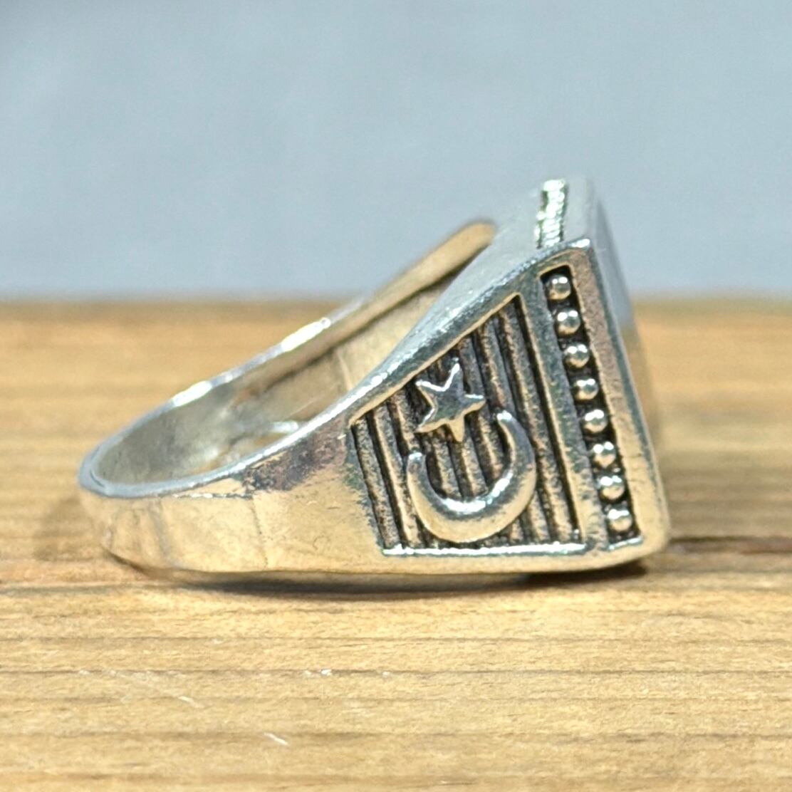 シルバーカラーのベースに、両サイドには月と星のモチーフが刻まれており、どこか神秘的な雰囲気を漂わせるデザイン。程よくくすんだ質感が、古着スタイルにもよく馴染みます。ユニセックスで使える存在感のあるアクセサリーです。
