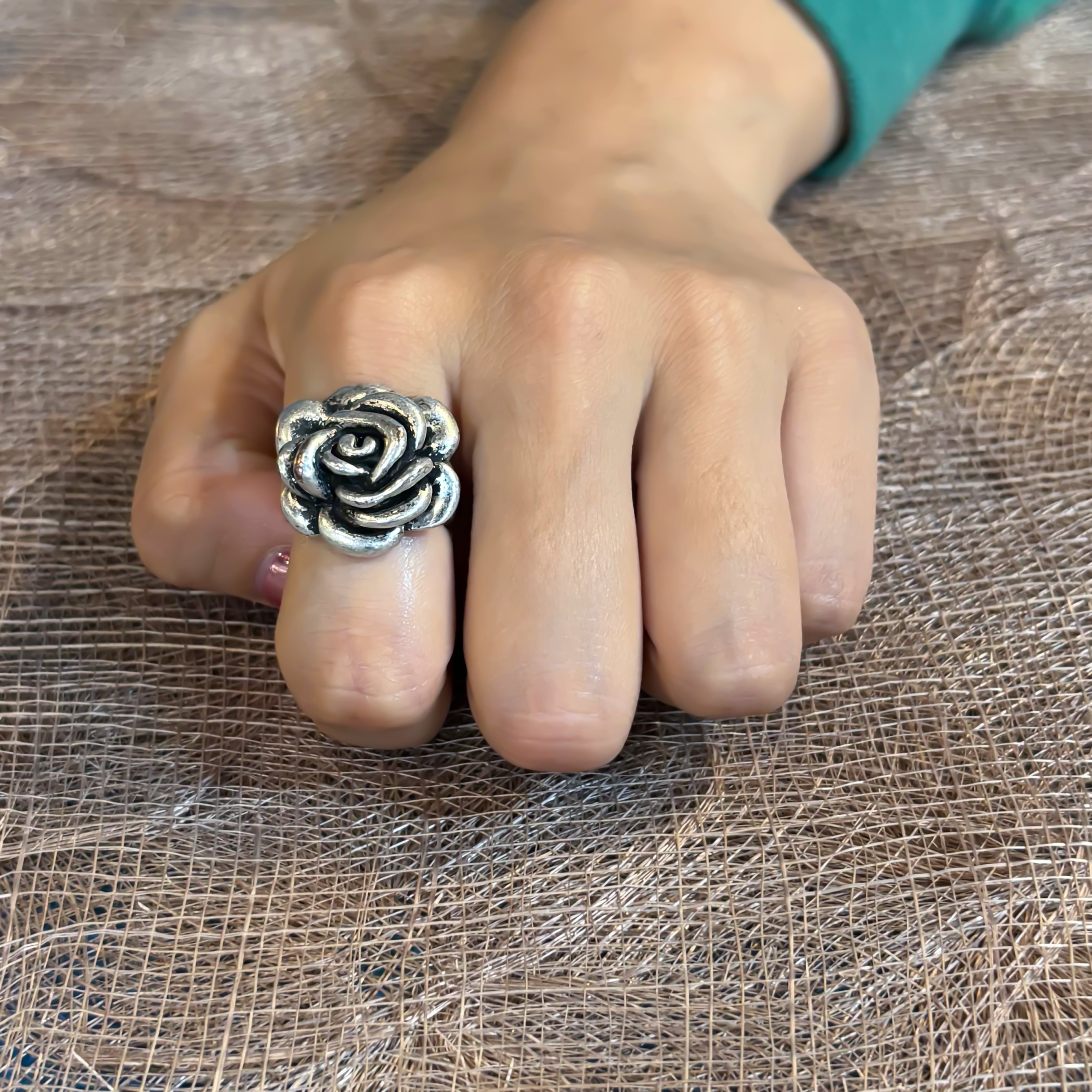 立体的なローズデザインが印象的な、シルバーカラーのリングです。