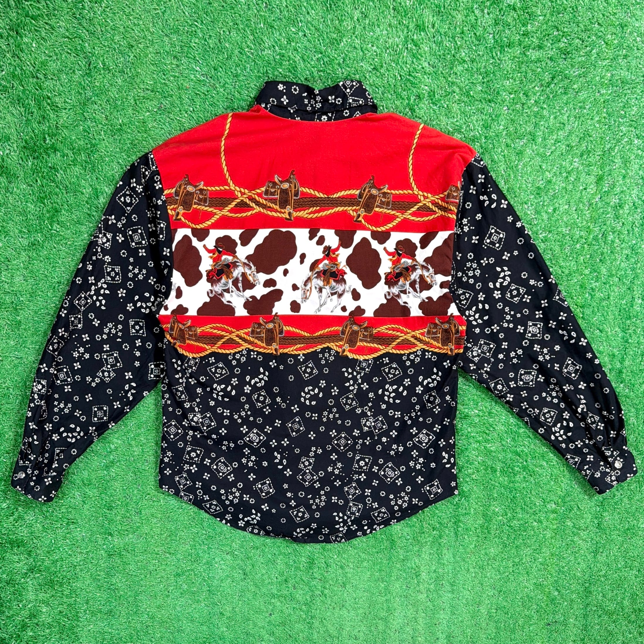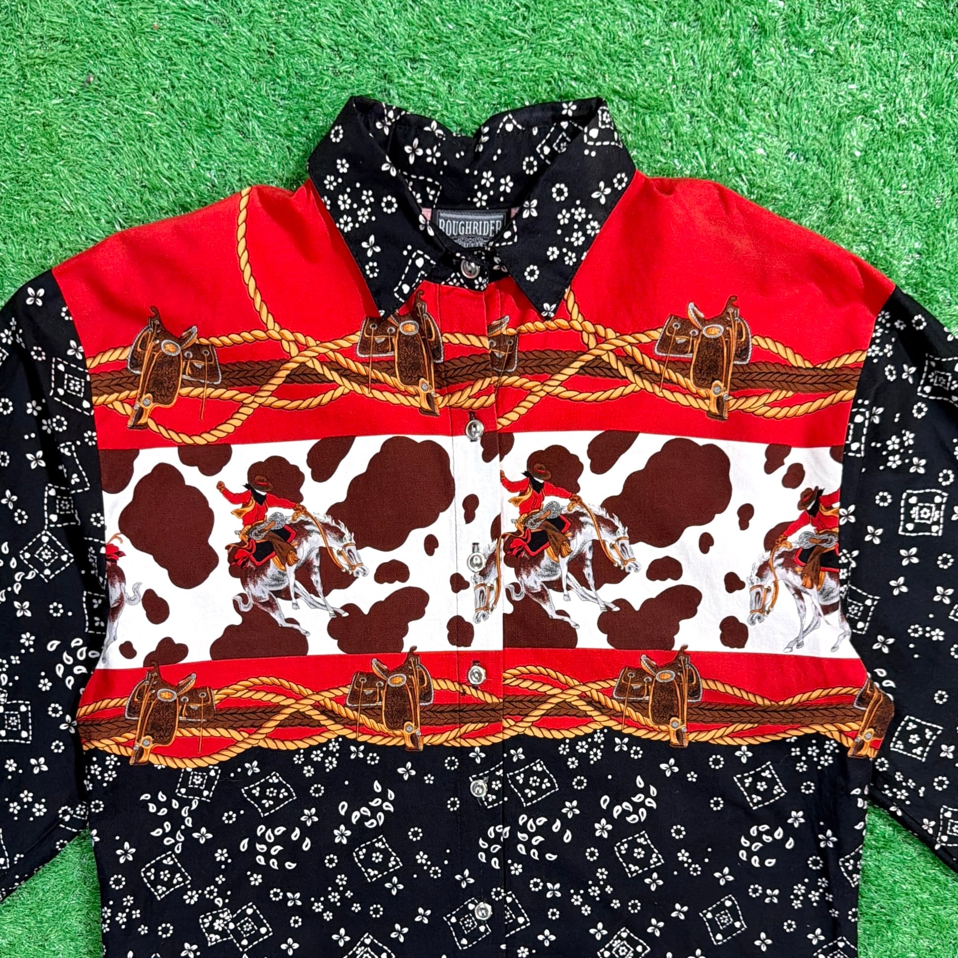 胸元にはロープや馬、カウプリントなどウエスタンテイストたっぷりのデザインが施され、80sらしい遊び心を感じる一枚。インパクトのあるヴィジュアルながらどこかクラシックな雰囲気も漂います。