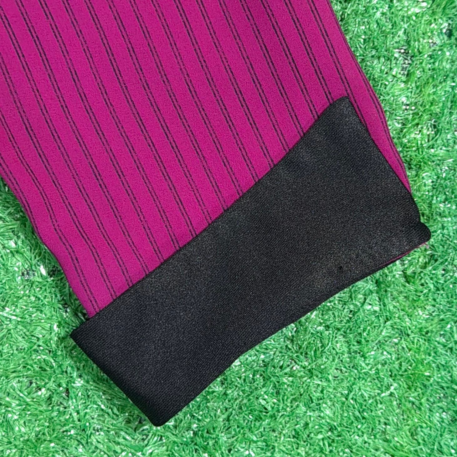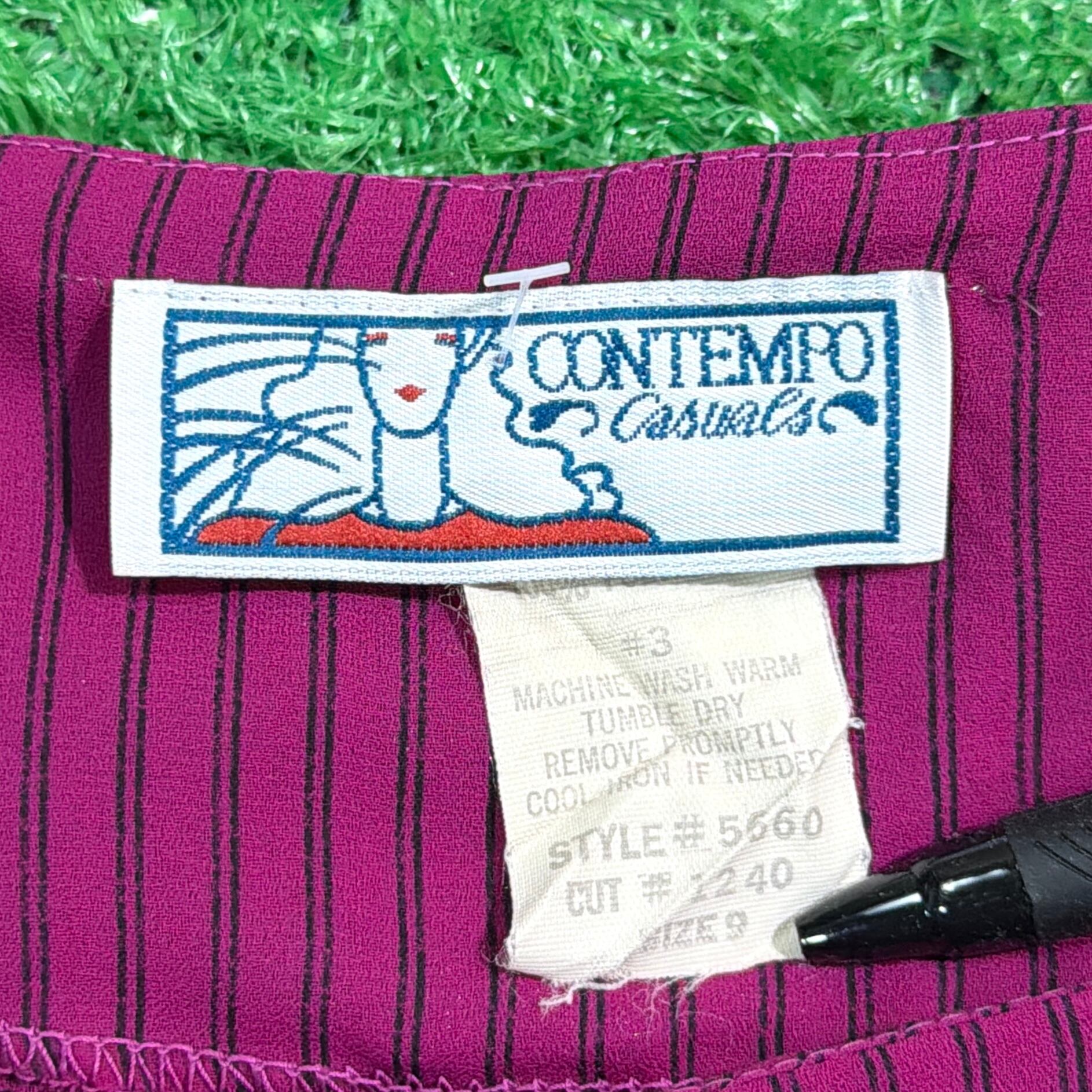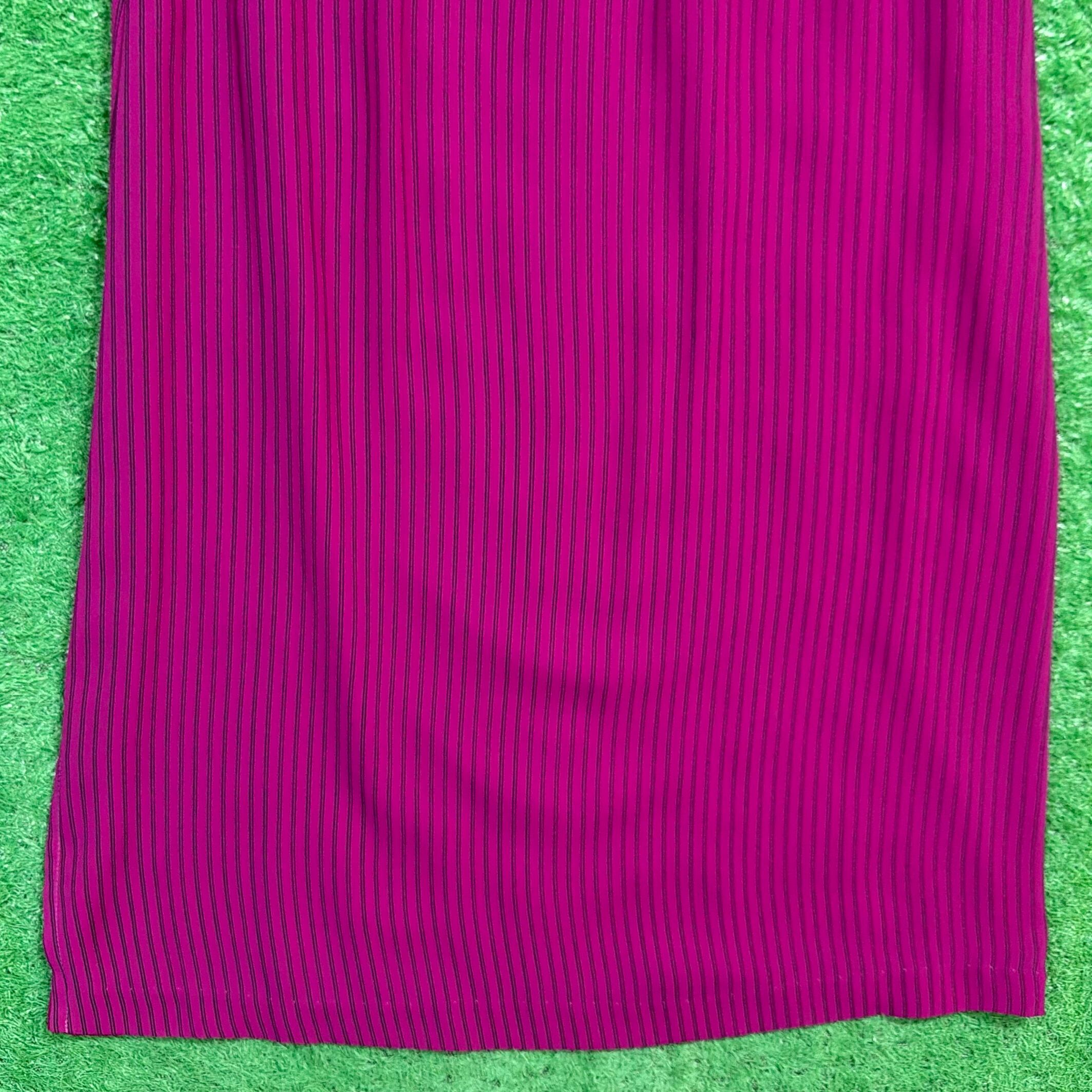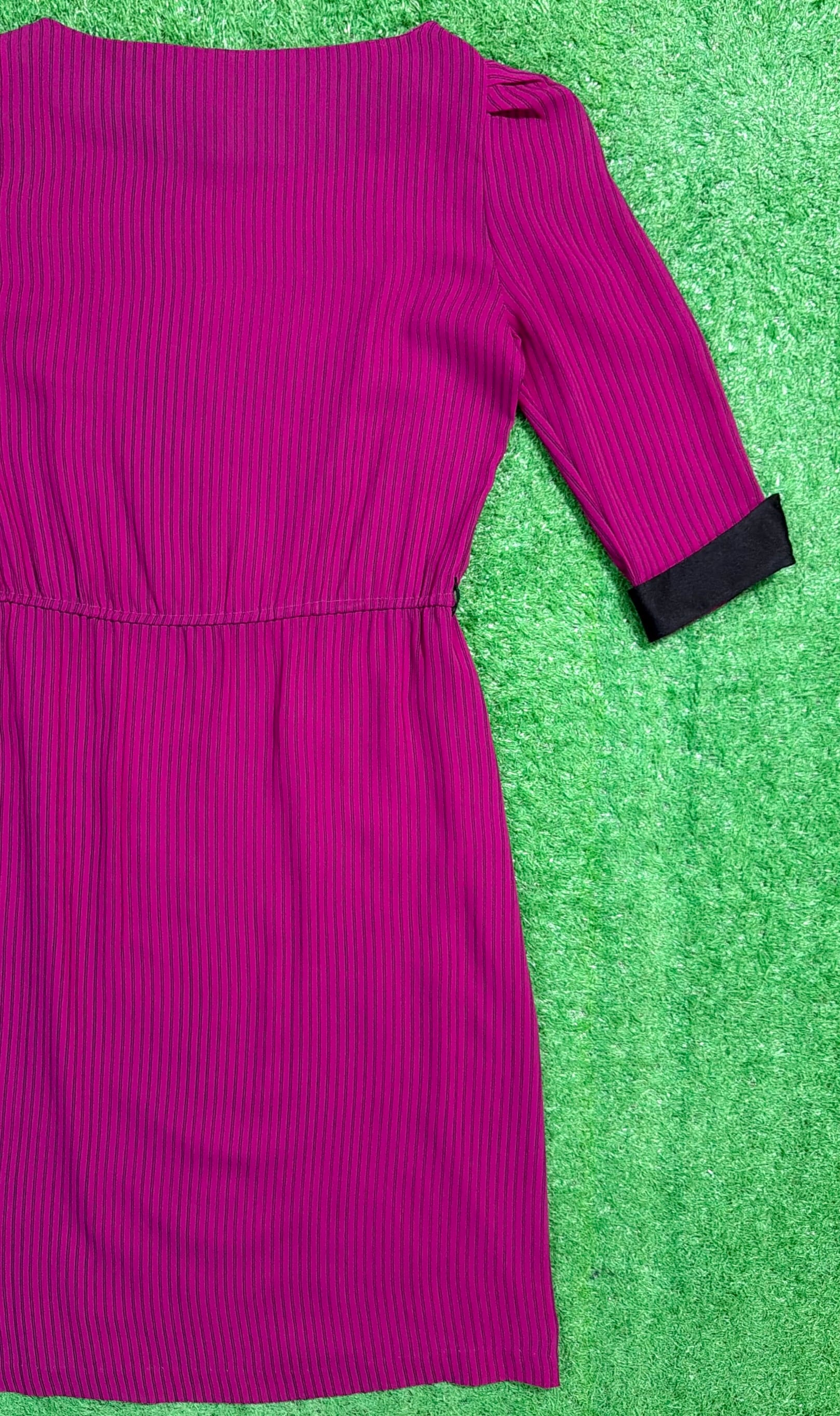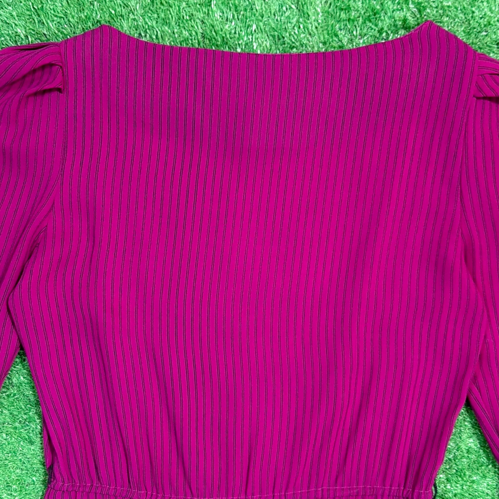 マゼンタピンクのストライプ生地に、肩のタックと袖口の切り替えデザインがアクセントになった1枚。ウエストはゴム仕様で、ほどよくフィットしながらも楽に着られるシルエットです。