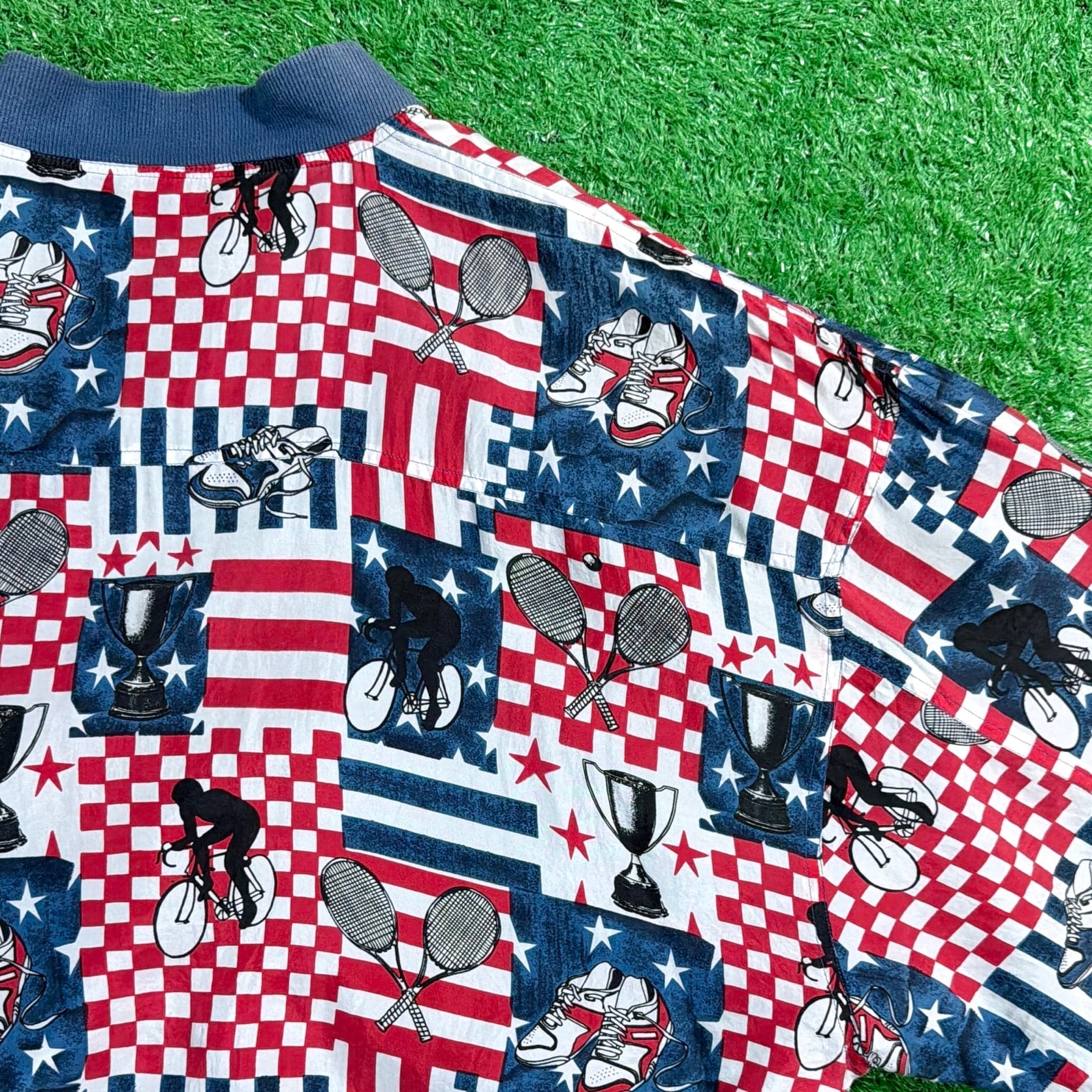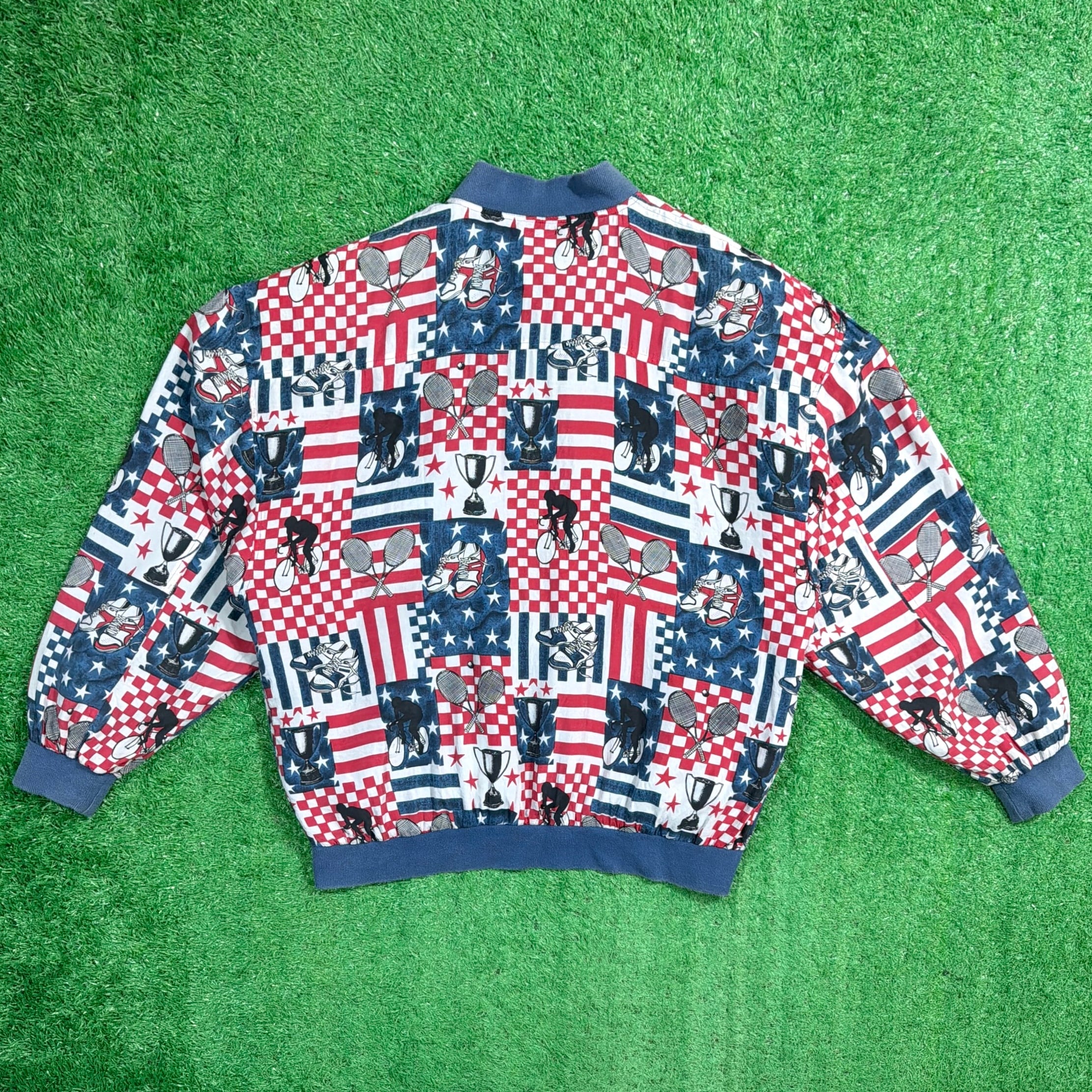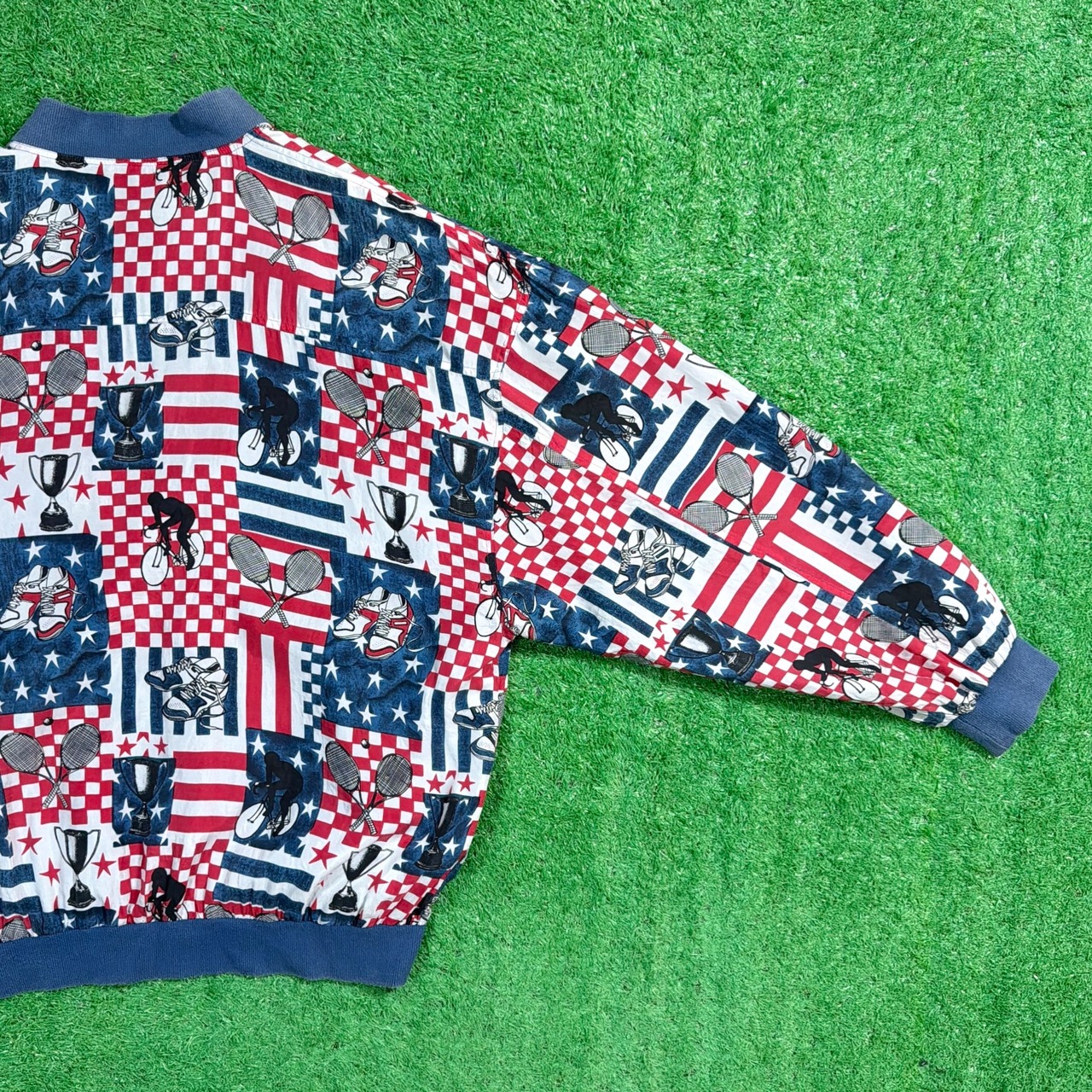 星条旗やラケット、テニスボールなどがパッチワークのように並ぶデザインで、90sらしいポップで遊び心のある雰囲気が魅力。