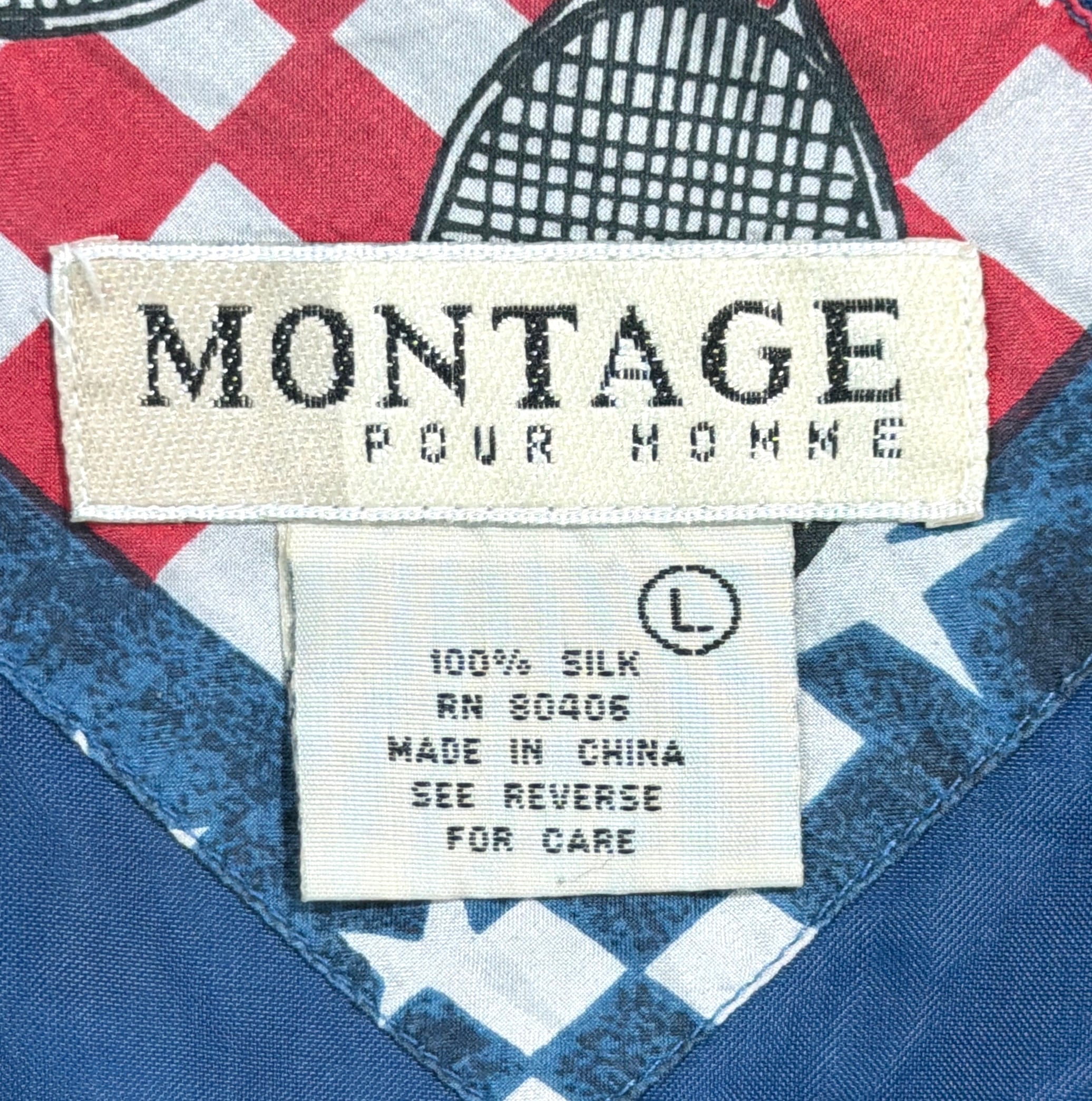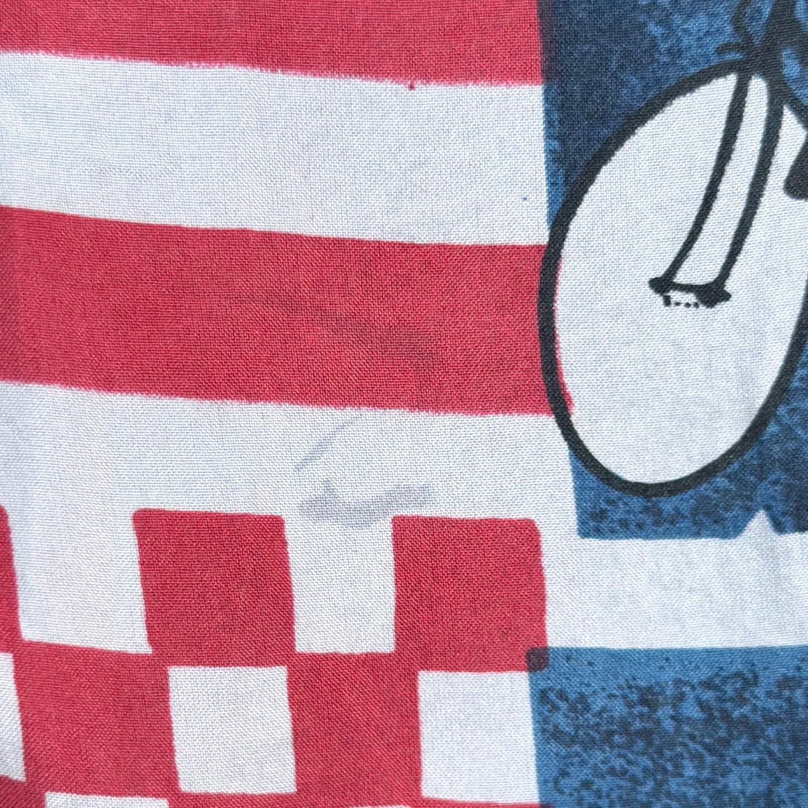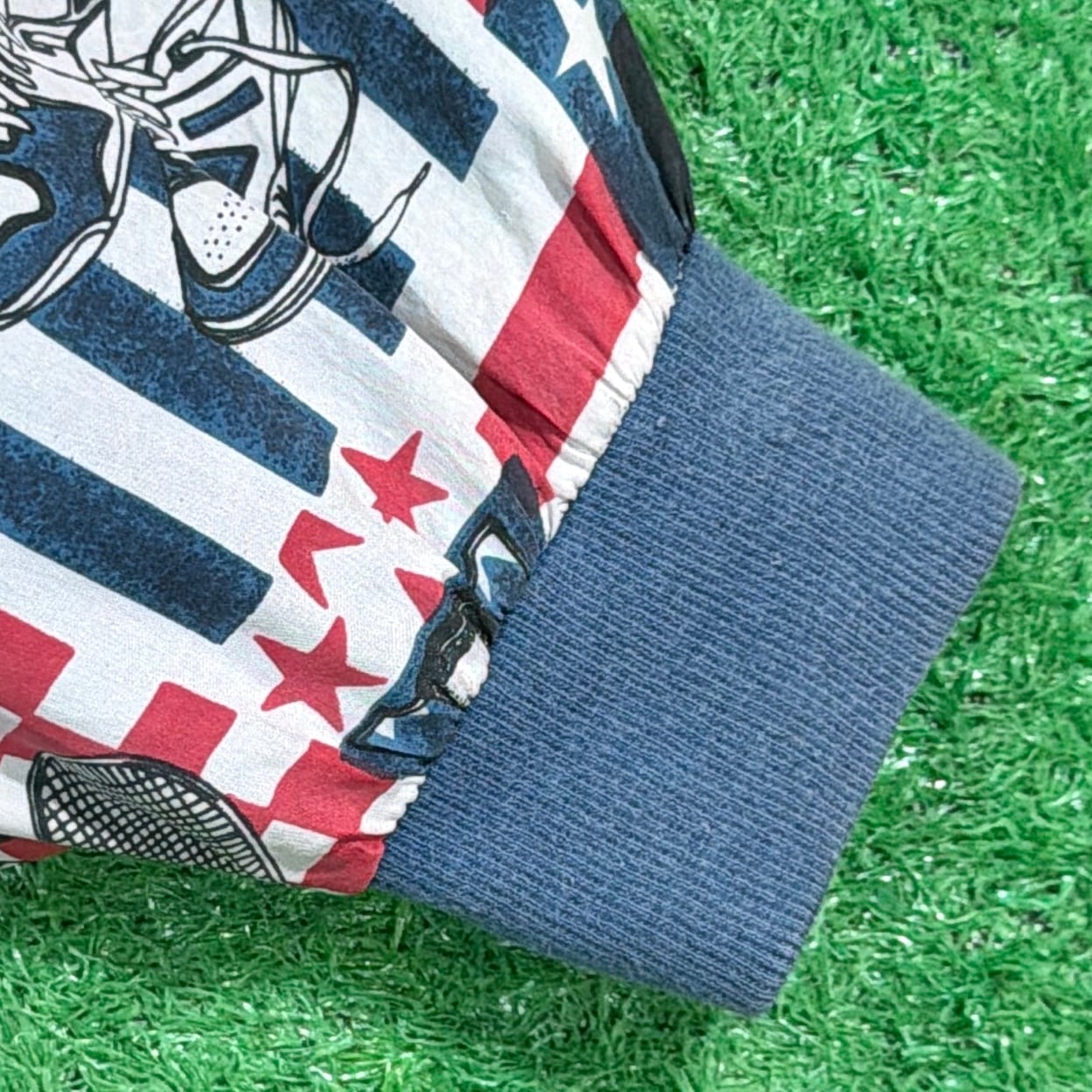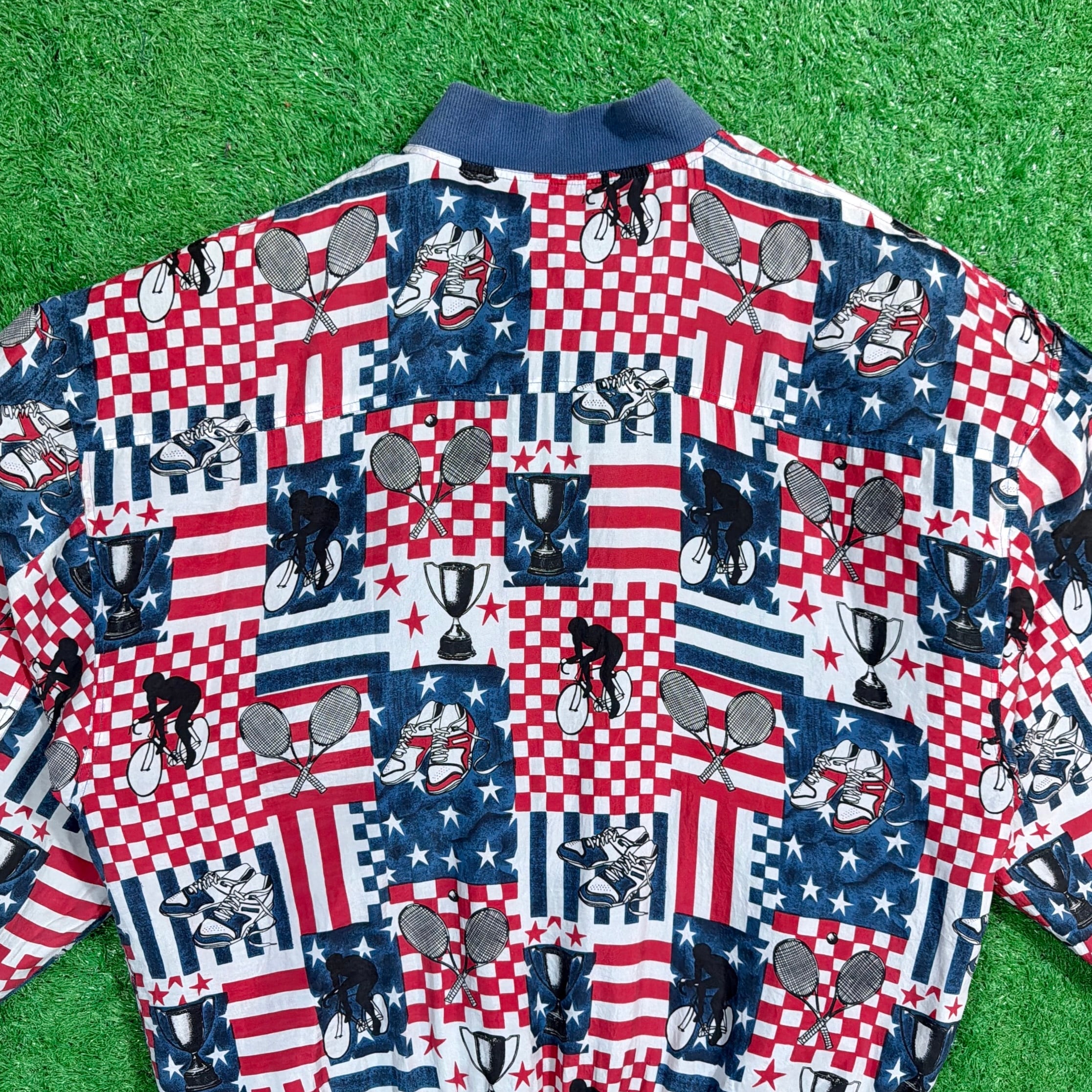 星条旗やラケット、テニスボールなどがパッチワークのように並ぶデザインで、90sらしいポップで遊び心のある雰囲気が魅力。