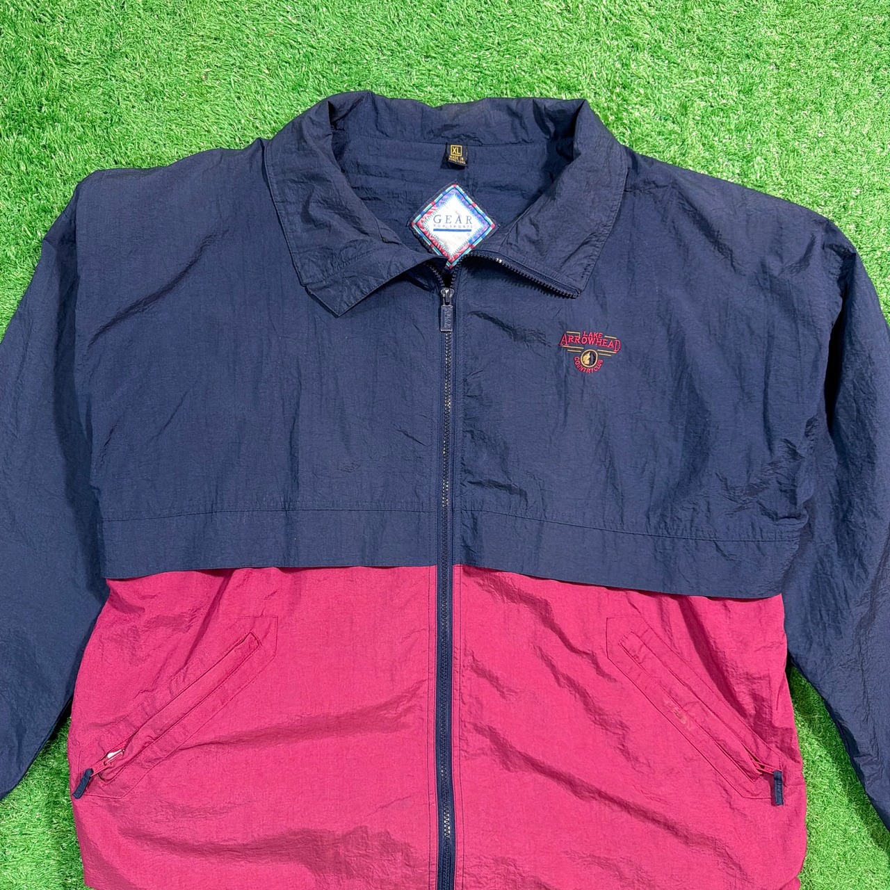ネイビー×ボルドーのバイカラーデザインで、胸元には「Lake Arrowhead Country Club(アメリカ・カリフォルニア州のマウンテンリゾート地レイクアローヘッドにあるカントリークラブ)」の刺繍入り。