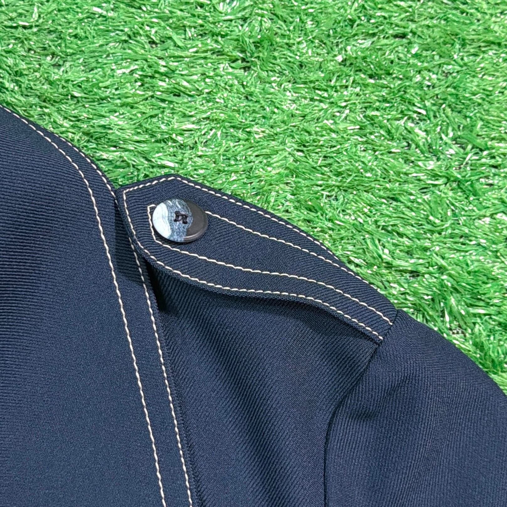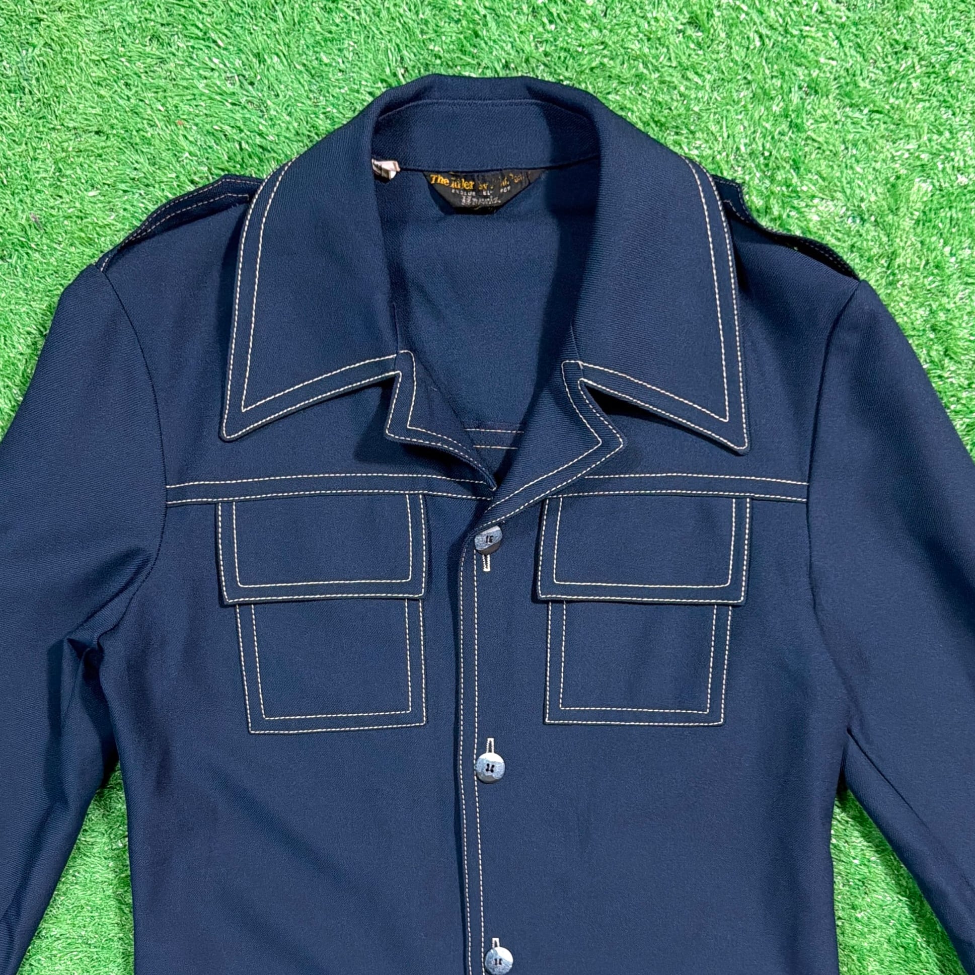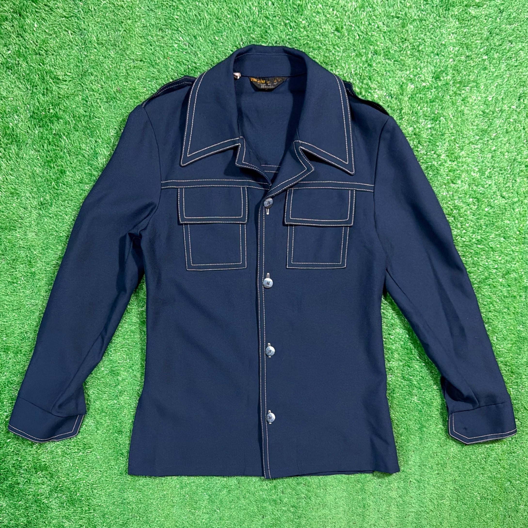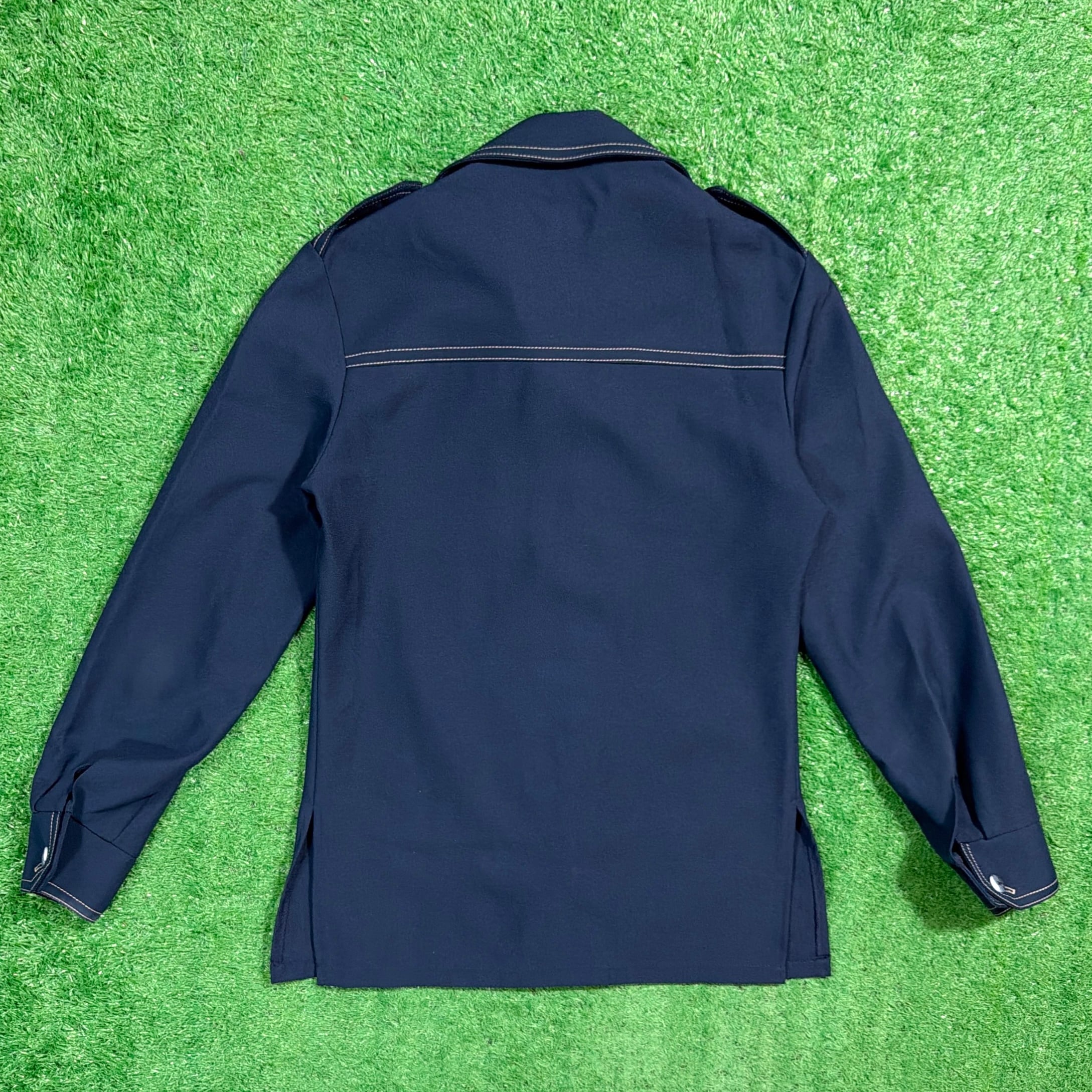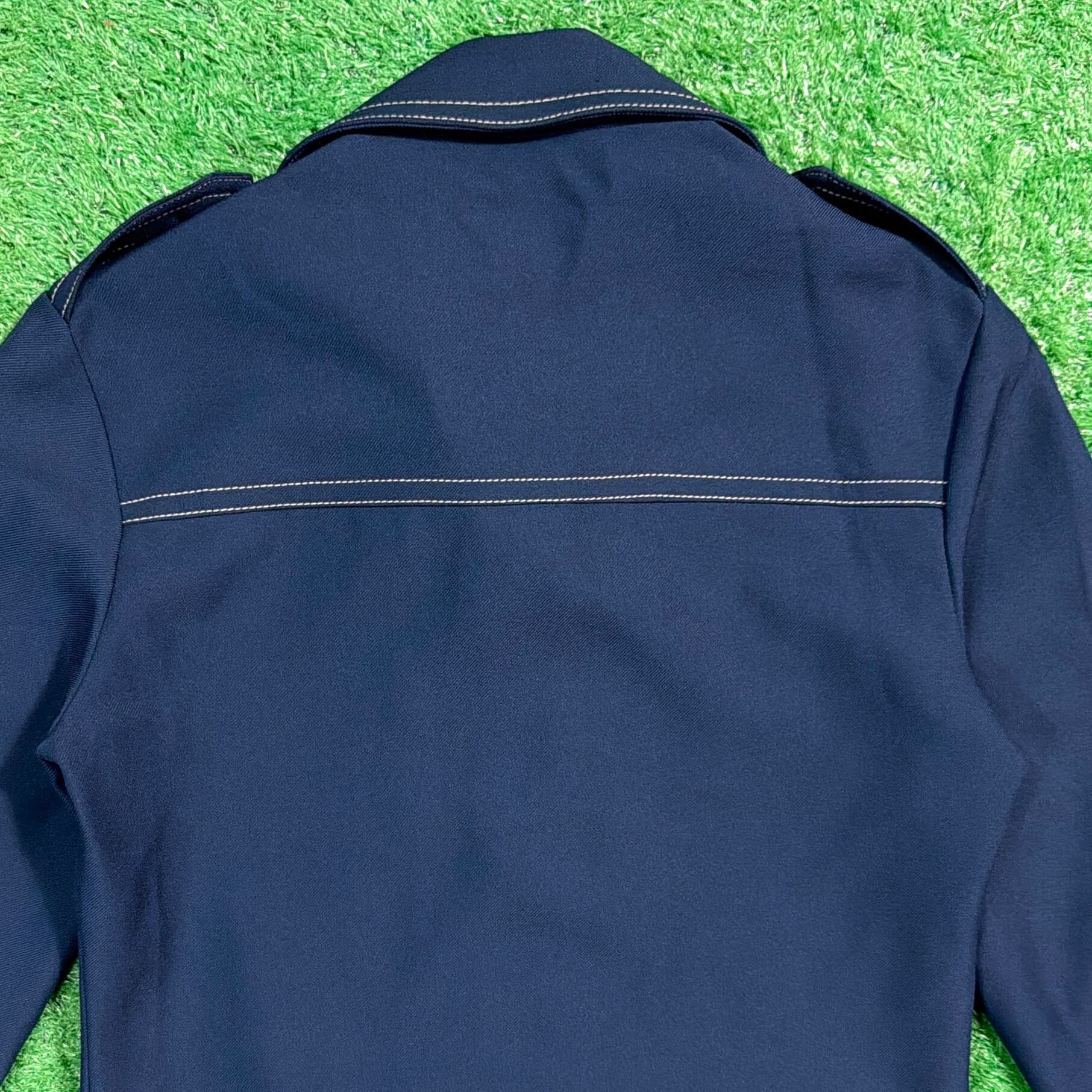大きめの開襟デザインに加え、肩のエポレットやステッチがアクセントになったレトロな一着。ジャージのような素材感で、軽い着心地ながら程よくハリのある生地です。ミリタリーやモードの要素を感じさせる独特のデザインが魅力的です。