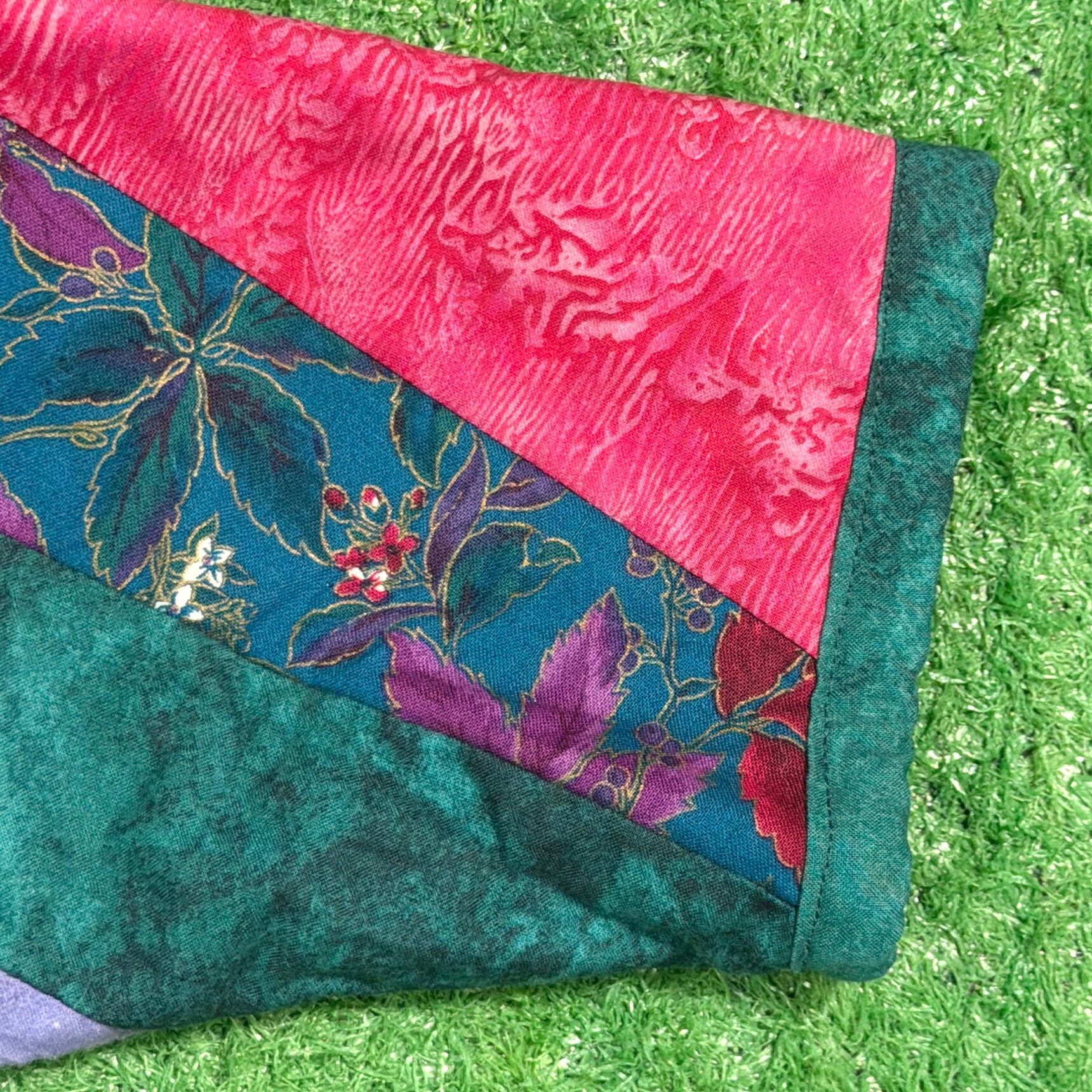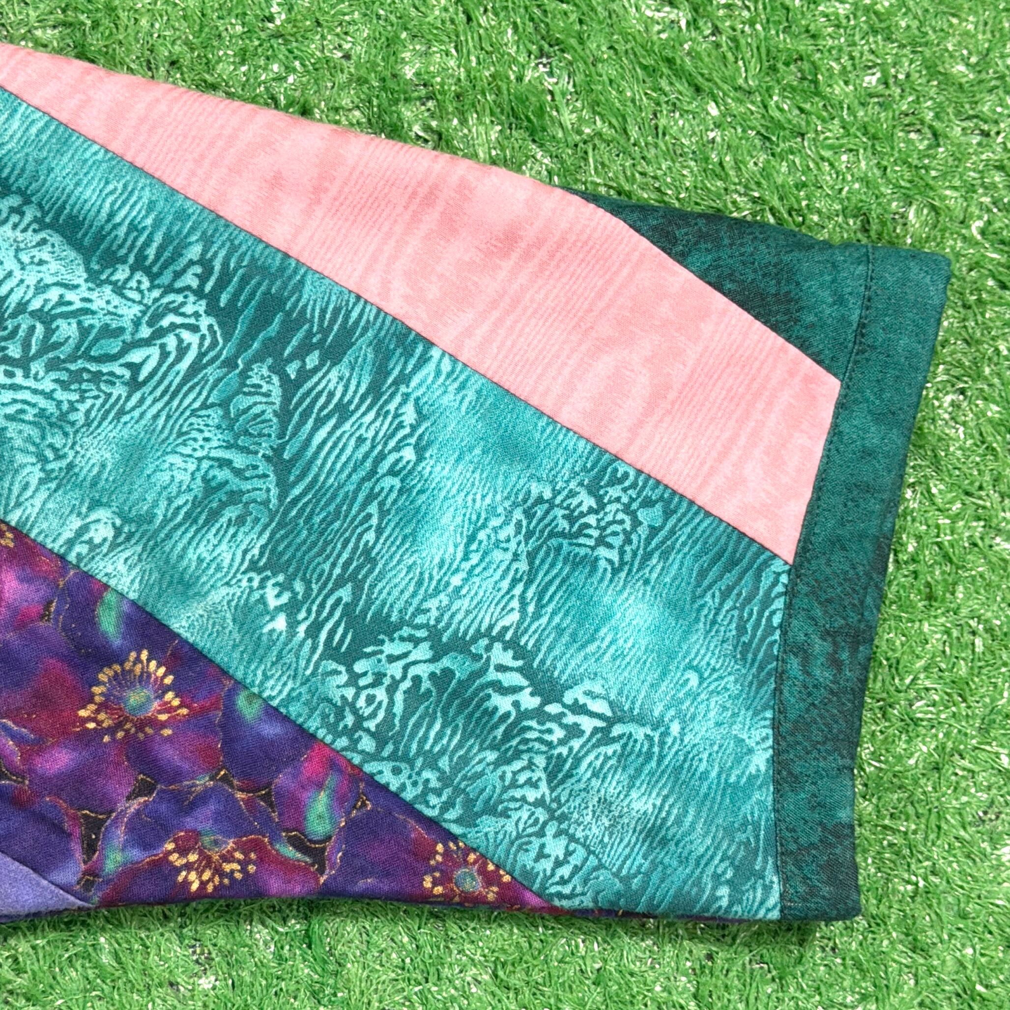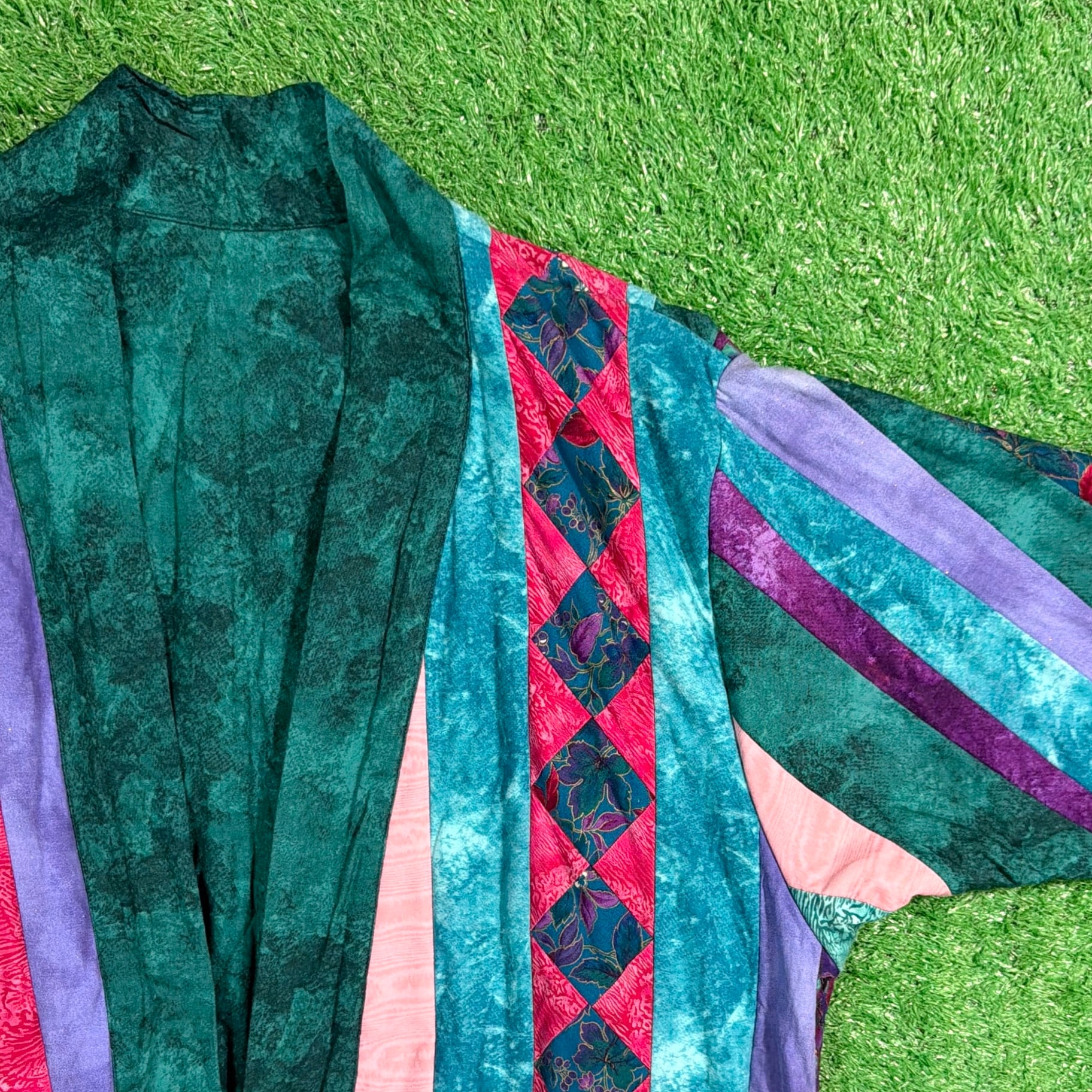 カラフルなパッチワークデザインが目を引く、ハンドメイドのロングジャケットです。