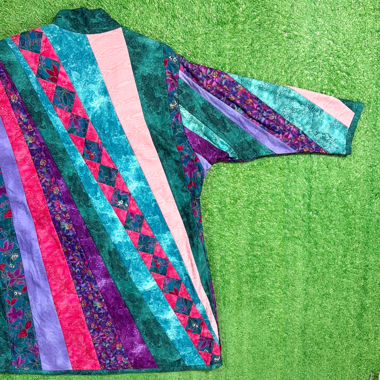 鮮やかなピンクやターコイズ、パープルなどを組み合わせた個性的な1着。ゆったりとしたシルエットに加え、裏地なしの軽やかな作りで季節の変わり目にも活躍します。タイダイのようなムラ感のある生地がヴィンテージらしい雰囲気を演出し、1枚で存在感抜群のアイテムです。