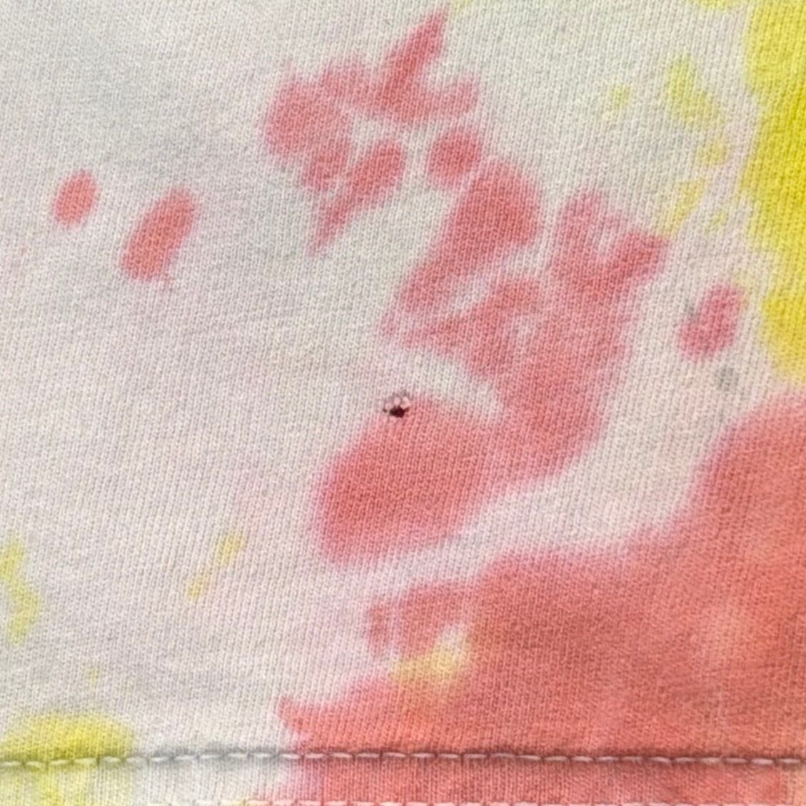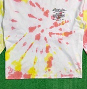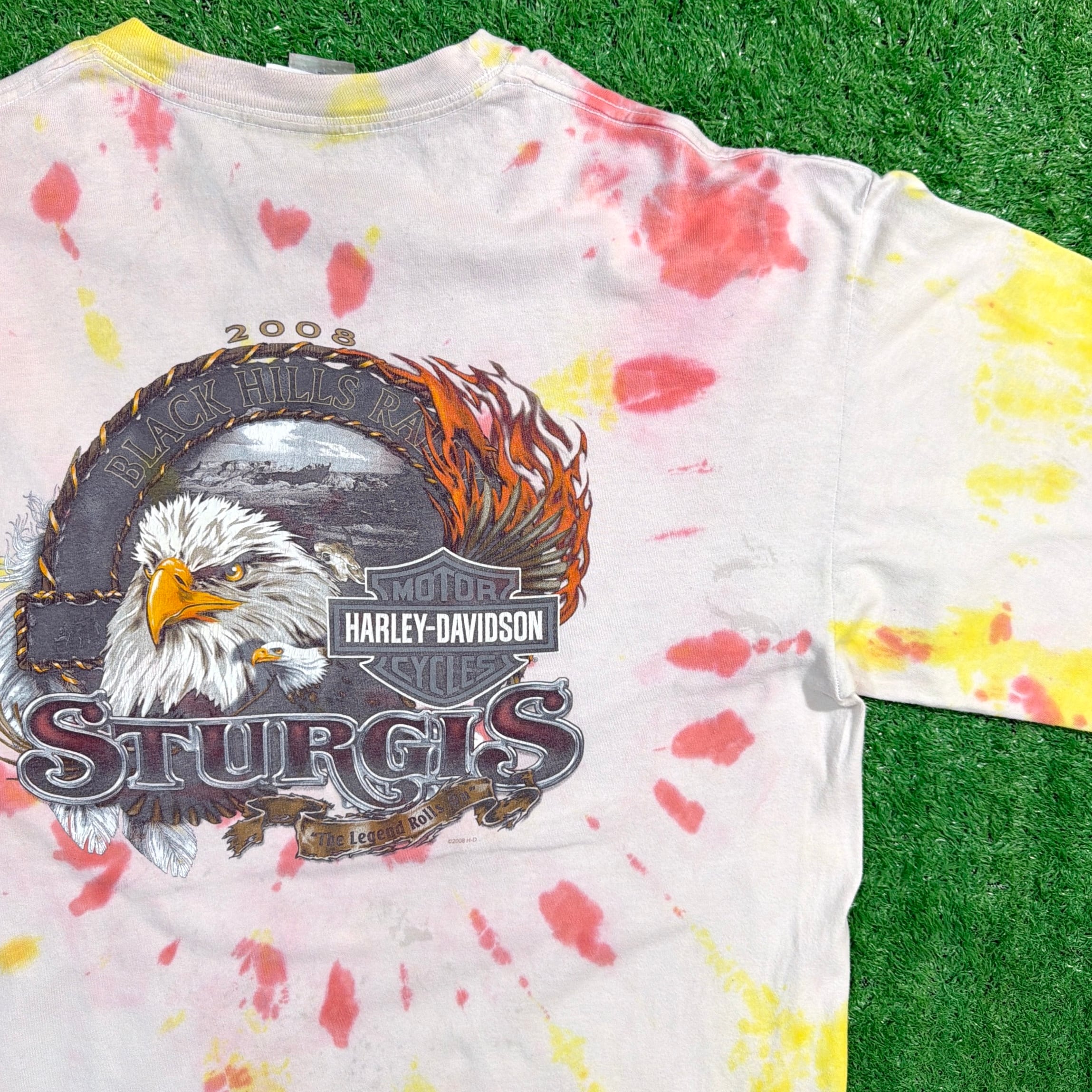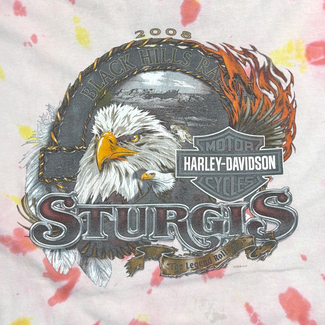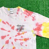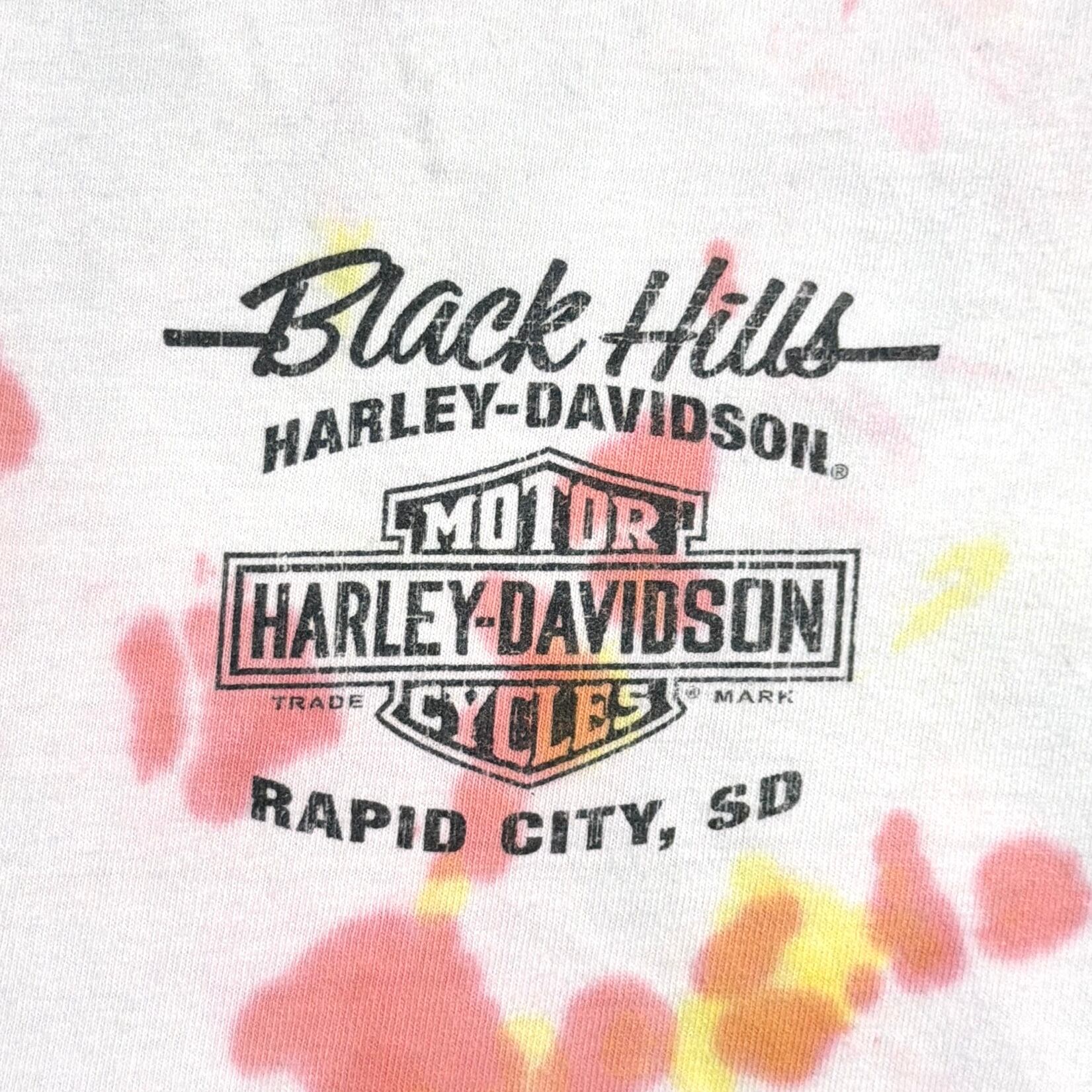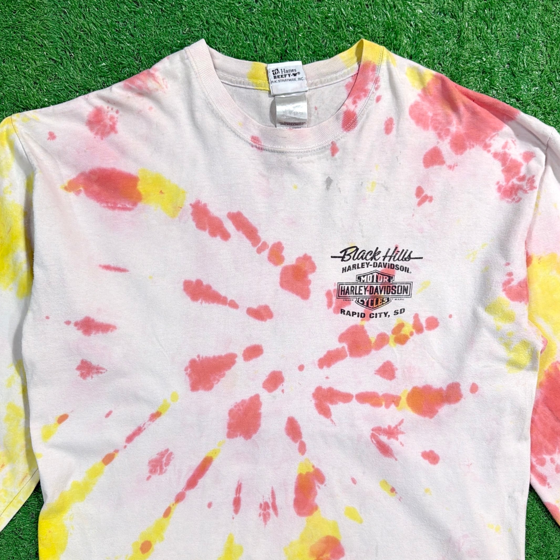 アメリカ・サウスダコタ州ラピッドシティにある「Black Hills Harley-Davidson(ブラックヒルズ ハーレーダビッドソン)」の店舗アイテム。バックにはアメリカ最大級のバイクイベント「Sturgis Motorcycle Rally(スタージス・モーターサイクル・ラリー)」のプリントが施されています。イーグルやファイヤーパターンなど、アメリカンカルチャーを象徴する迫力のあるデザインが魅力。レッドとイエローを基調にしたタイダイ染めが個性的で、古着らしい存在感のある1枚です。