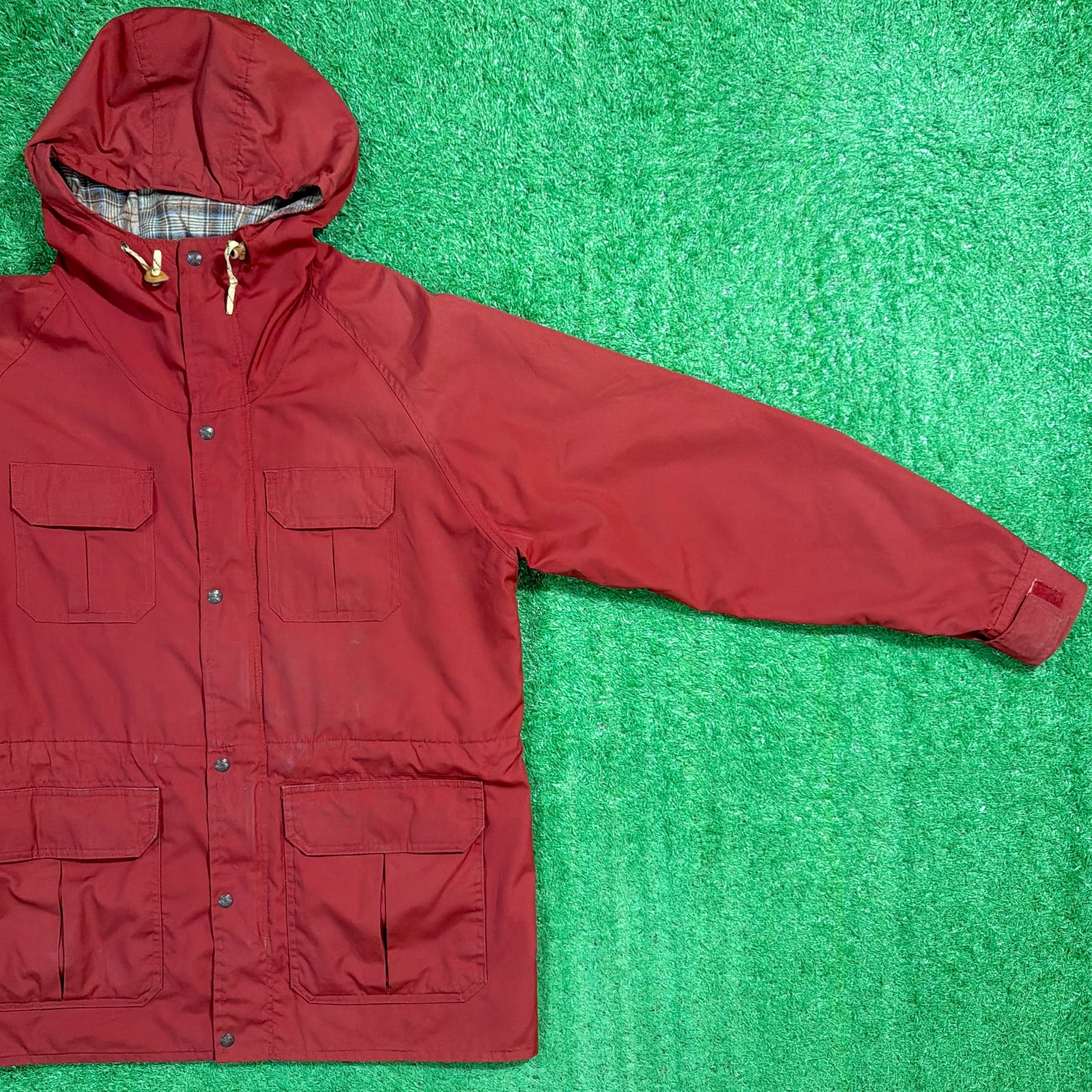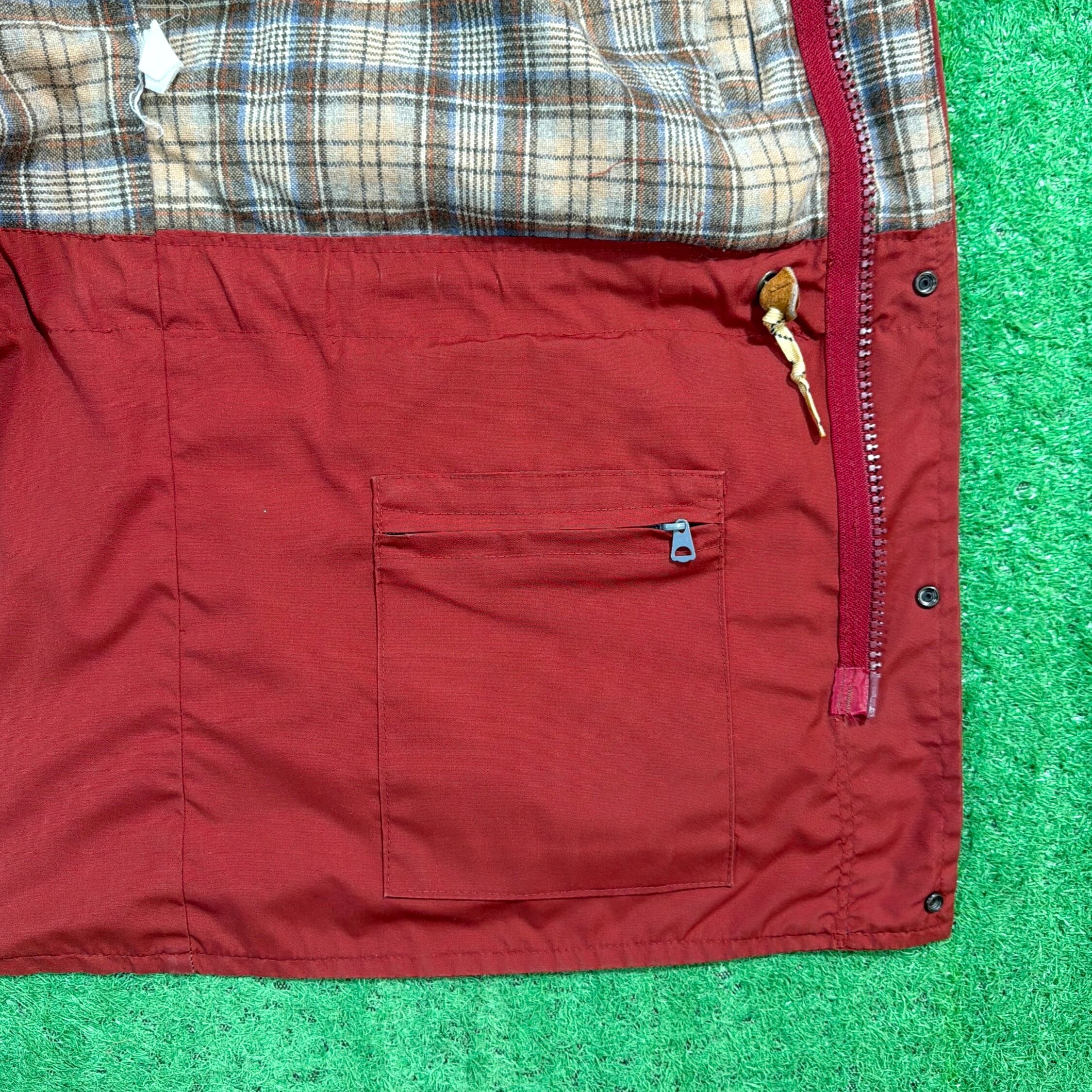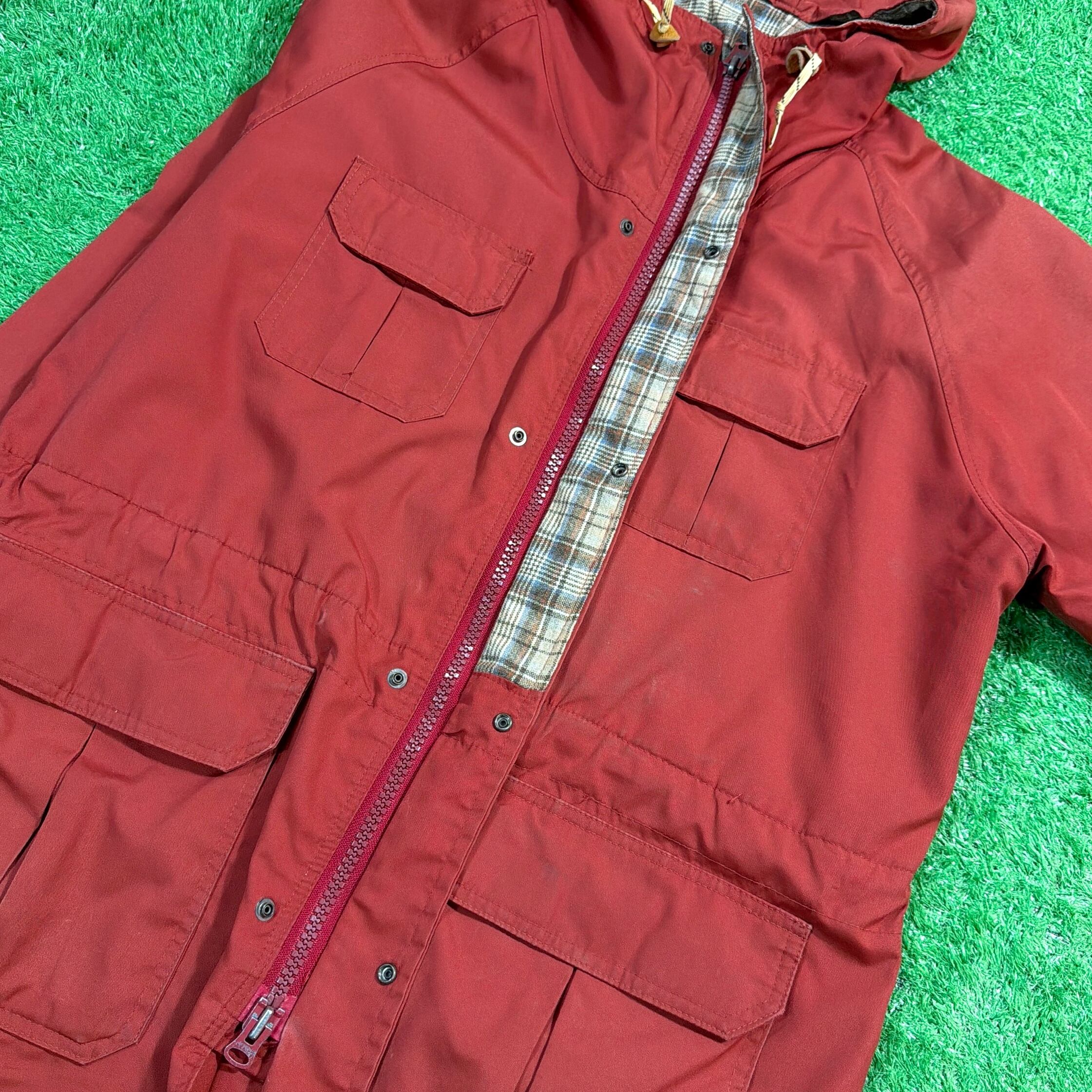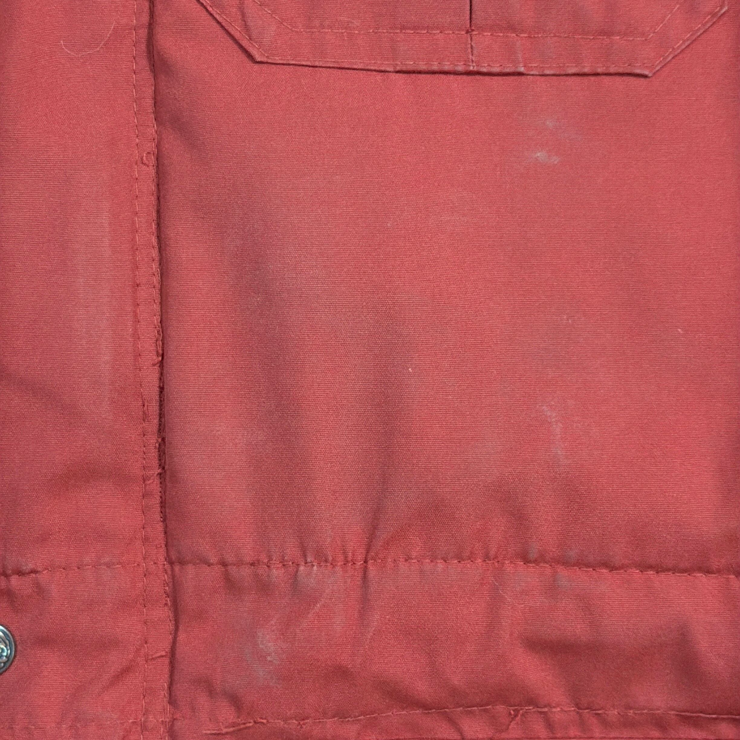 胸と腰に4つのポケットを備えた多機能デザインで、ウエストのドローコードでシルエット調整も可能です。裏地にはチェック柄のライナーが付き、当時らしいアウトドアムードを感じられる1着。ややくすんだオレンジ寄りのレッドカラーも、古着らしい味わいのある雰囲気に仕上がっています。