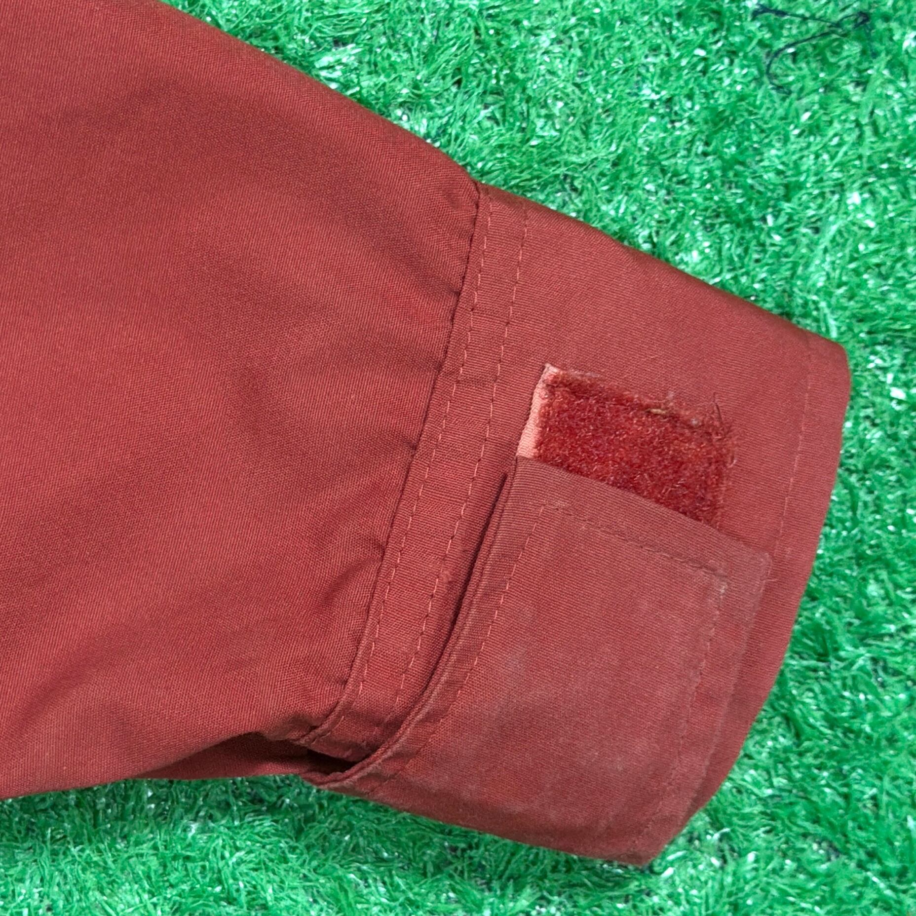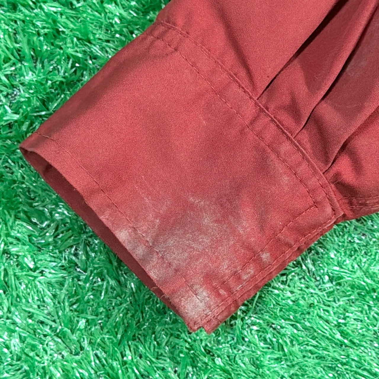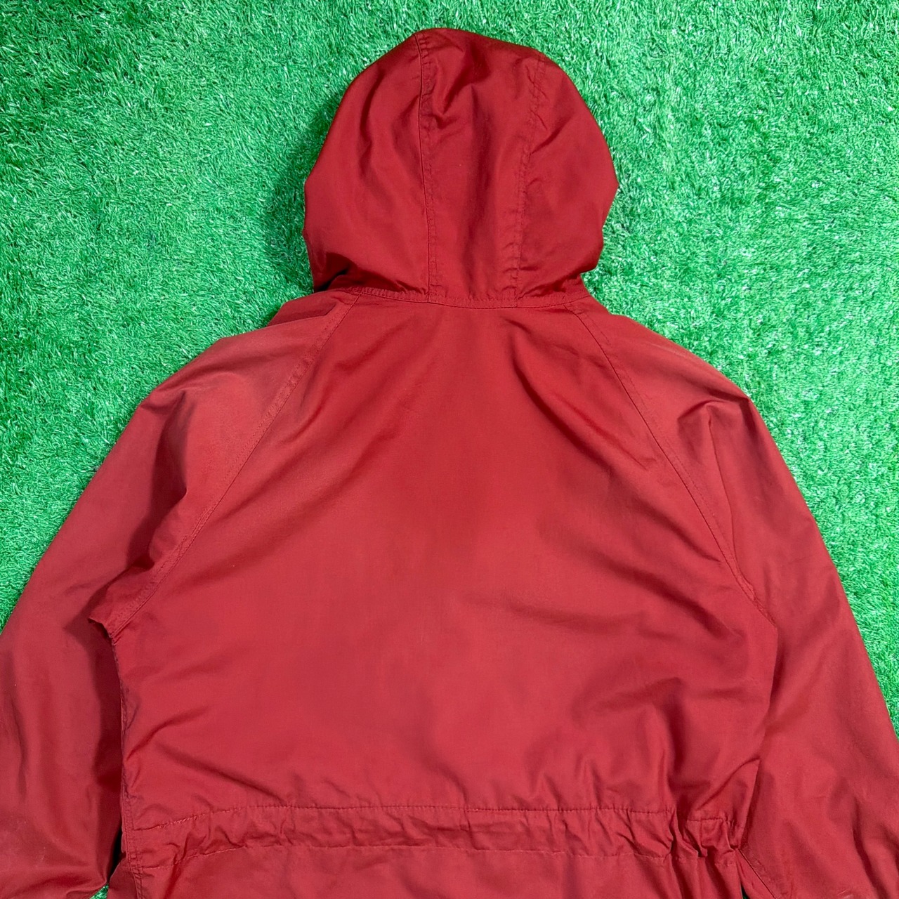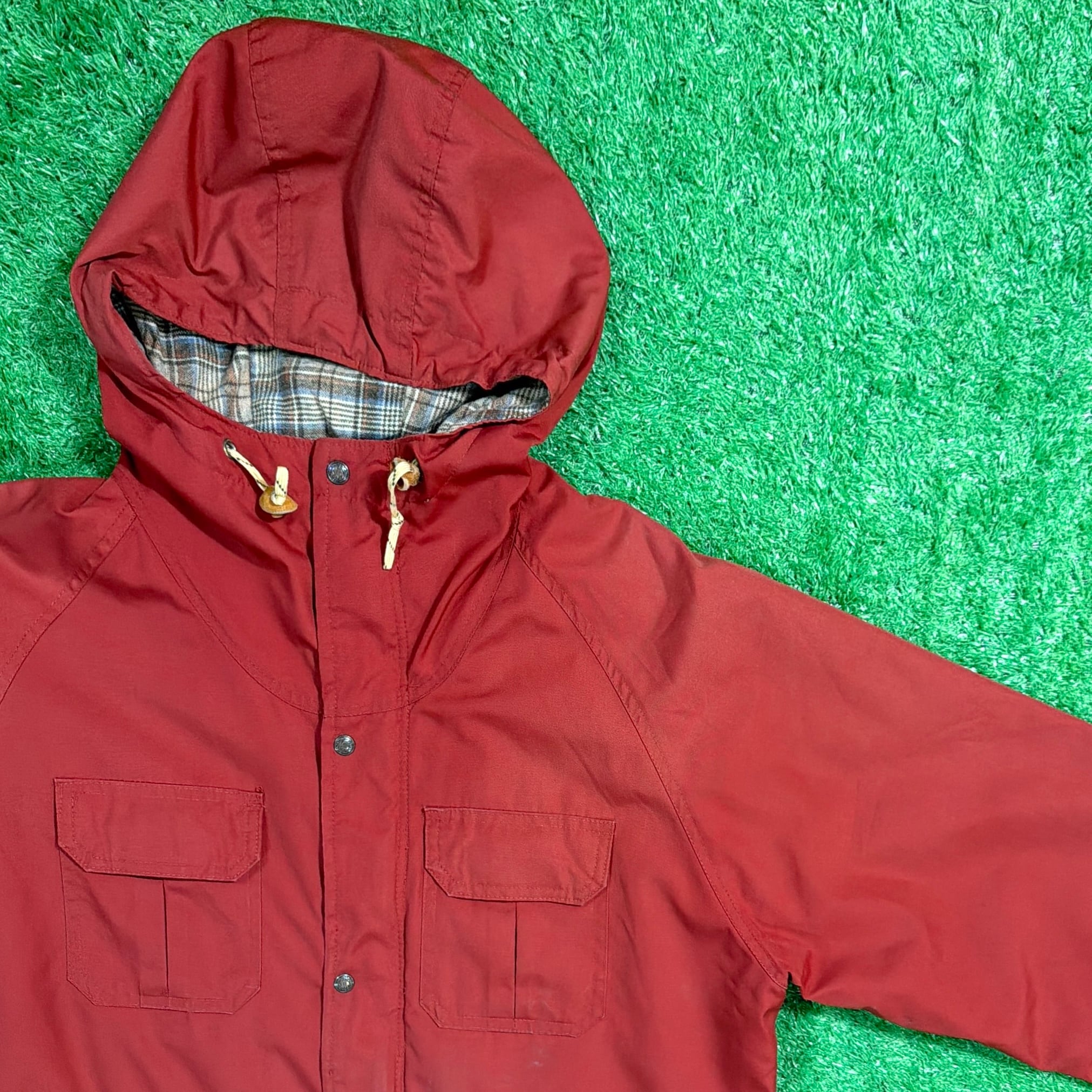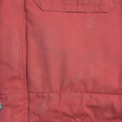 胸と腰に4つのポケットを備えた多機能デザインで、ウエストのドローコードでシルエット調整も可能です。裏地にはチェック柄のライナーが付き、当時らしいアウトドアムードを感じられる1着。ややくすんだオレンジ寄りのレッドカラーも、古着らしい味わいのある雰囲気に仕上がっています。