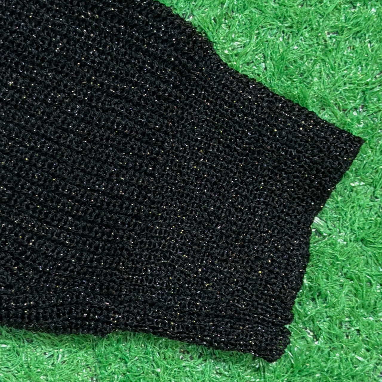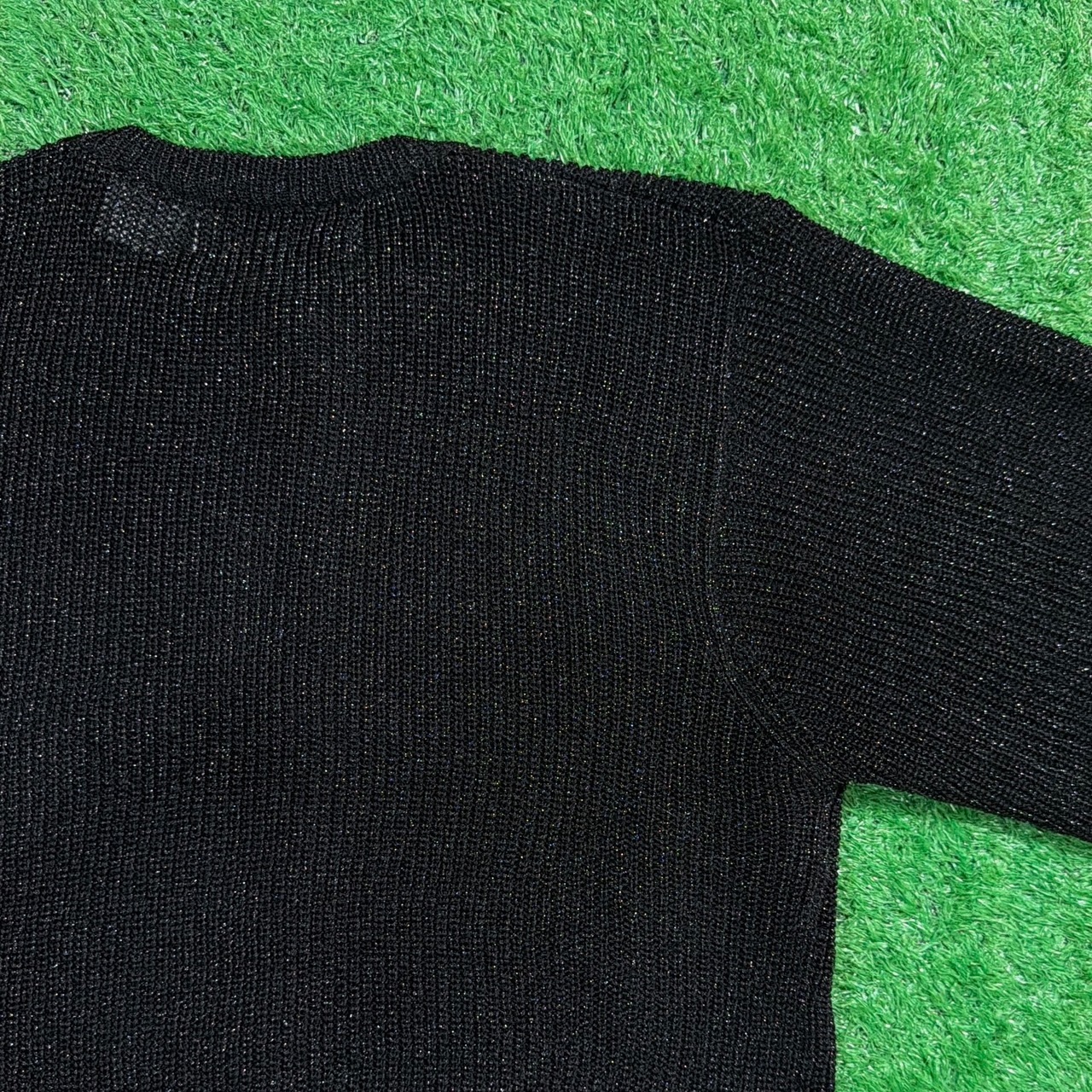 レーヨンポリエステル素材で、ほどよい光沢を持つラメ糸が織り込まれた上品な一枚。ノーカラーデザインで首まわりがすっきりと見え、きれいめにもカジュアルにも合わせやすいアイテムです。軽やかな生地感で、季節の変わり目にも使いやすい一枚。黒ベースのラメ糸が控えめにきらめき、シンプルながら存在感のある仕上がりです。