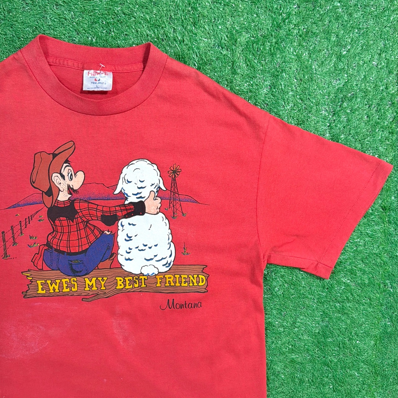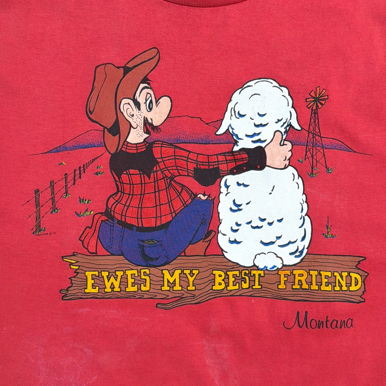 カウボーイと羊が寄り添うユニークなプリントで、「EWES MY BEST FRIEND(=Ewe=雌羊とかけた言葉遊び)」のメッセージが可愛らしい一枚。