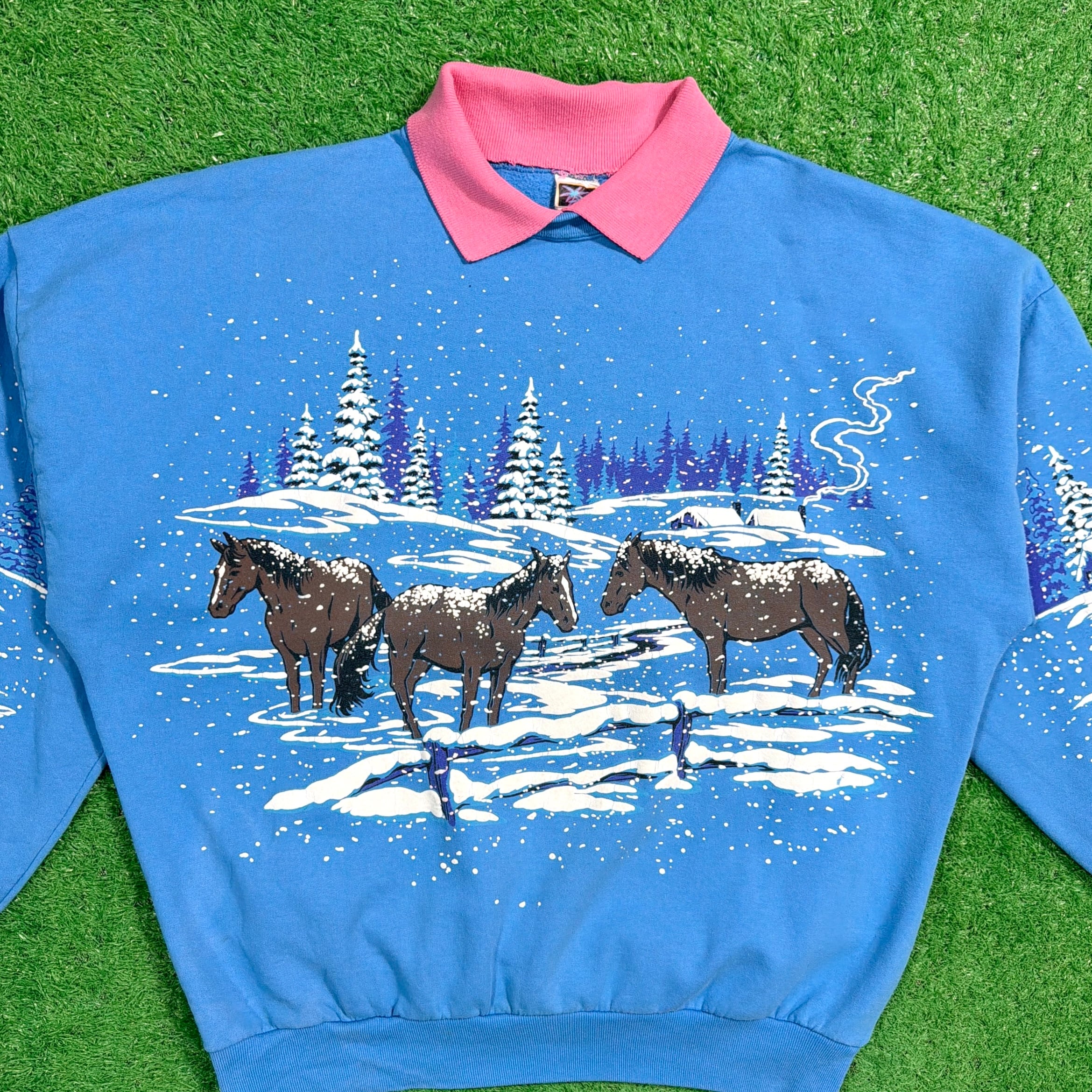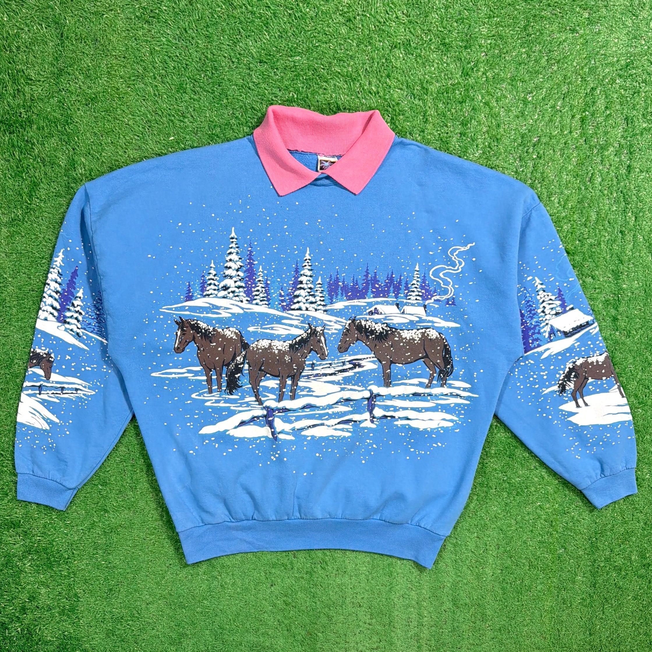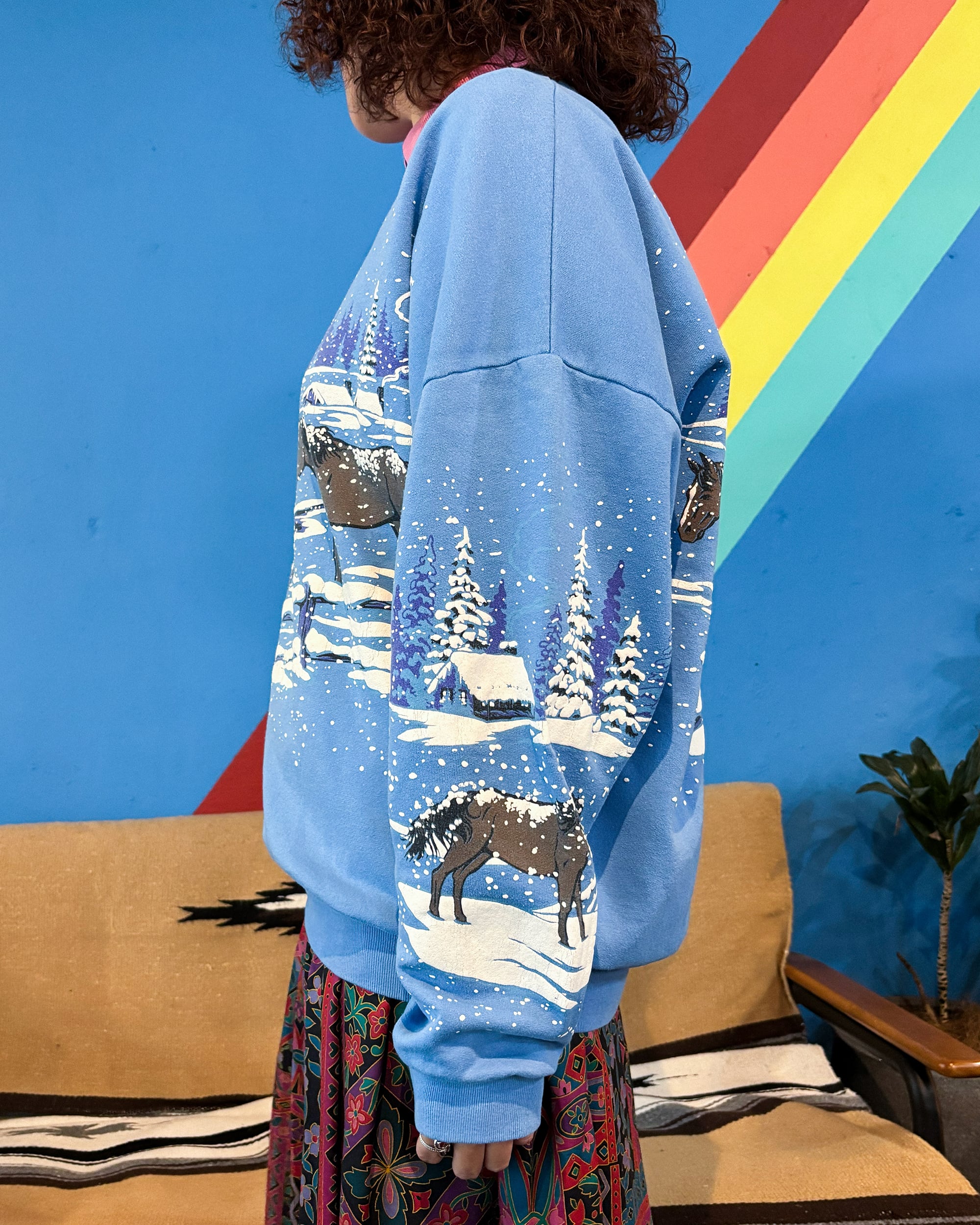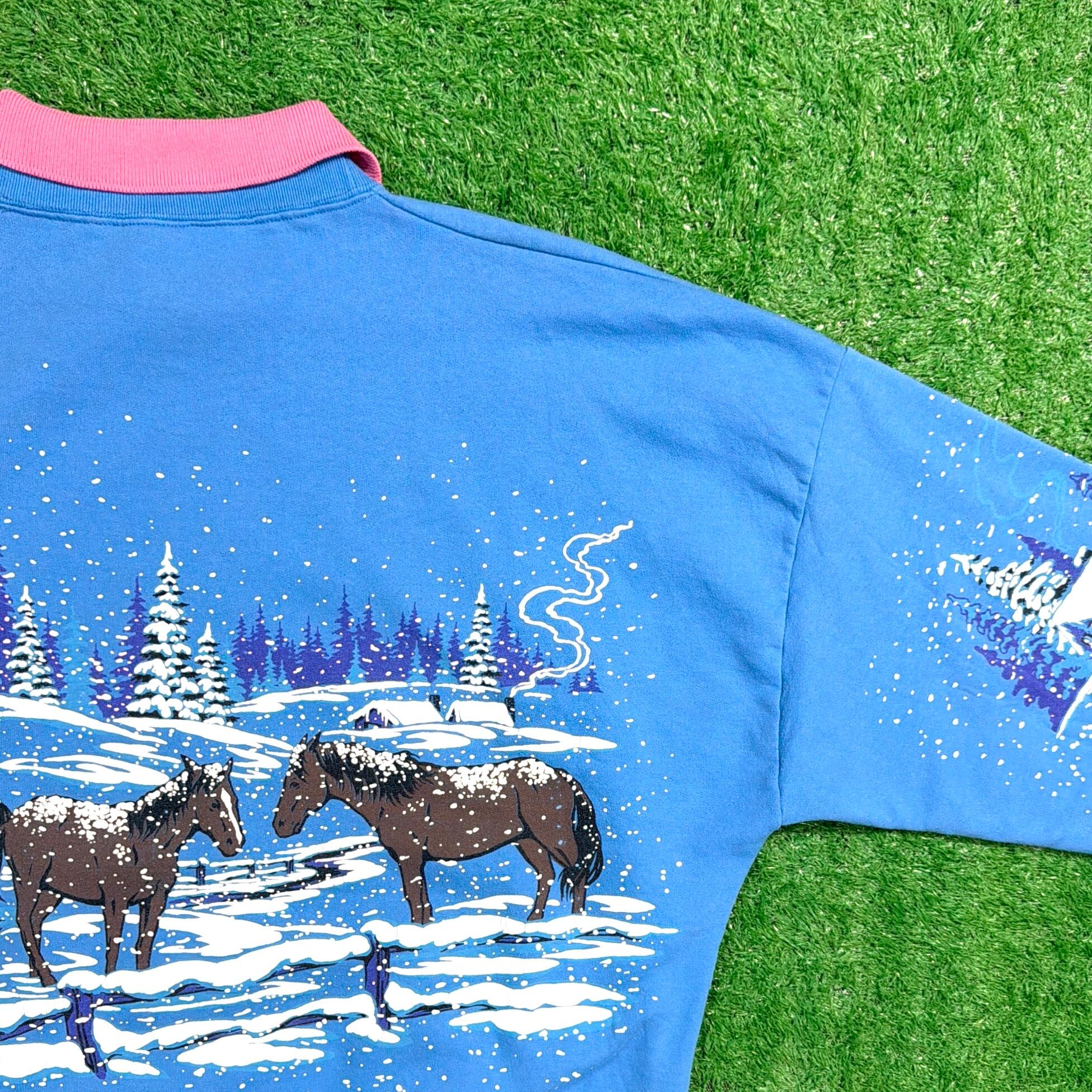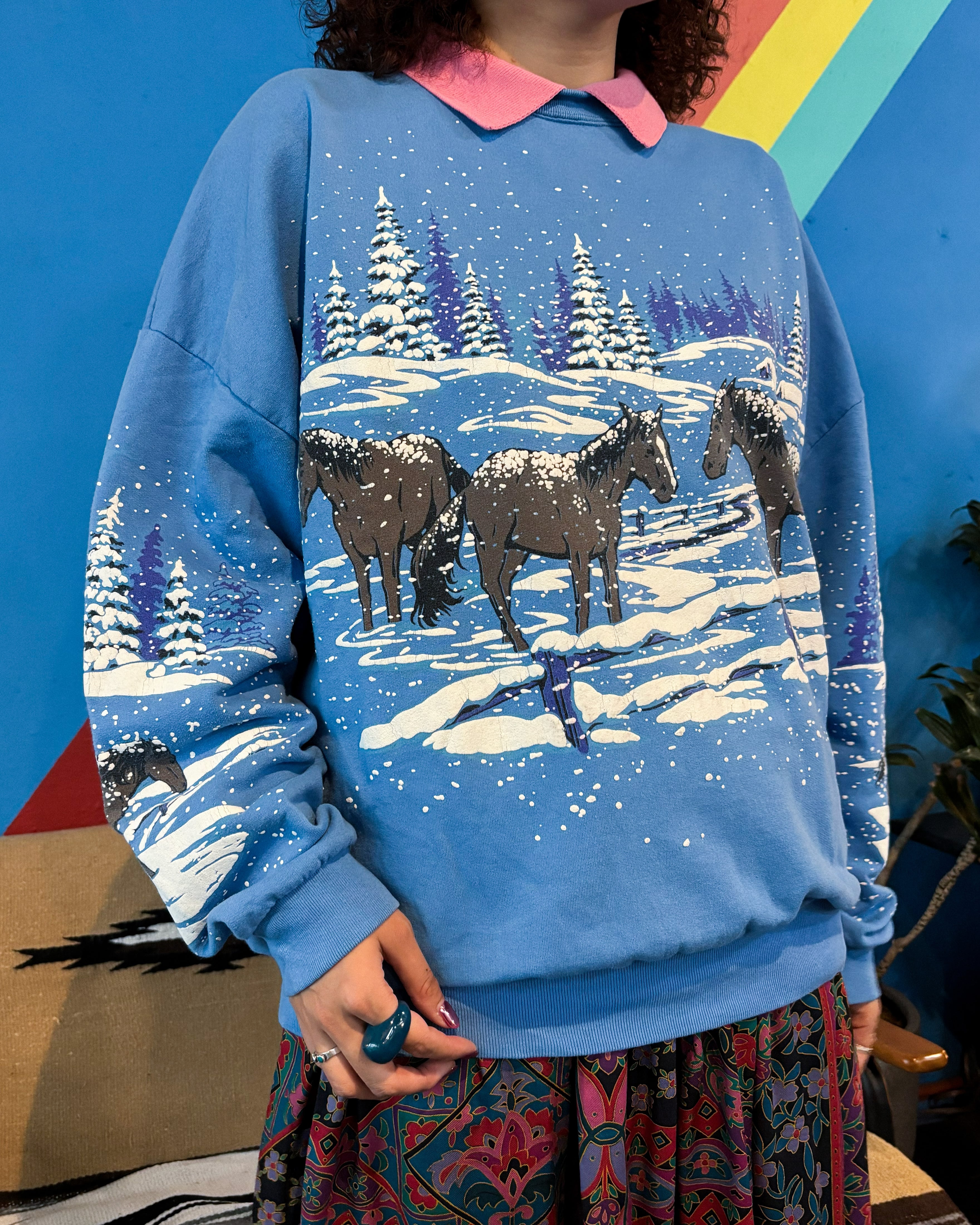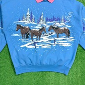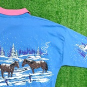 雪の中に佇む馬たちが描かれたアニマルプリントデザイン。ブルーのボディに映える幻想的な冬の風景が印象的です。袖にも続くプリントが施されており、全体でストーリー性を感じさせる一枚。ピンクの襟がアクセントになっており、90sらしい遊び心のあるデザインです。