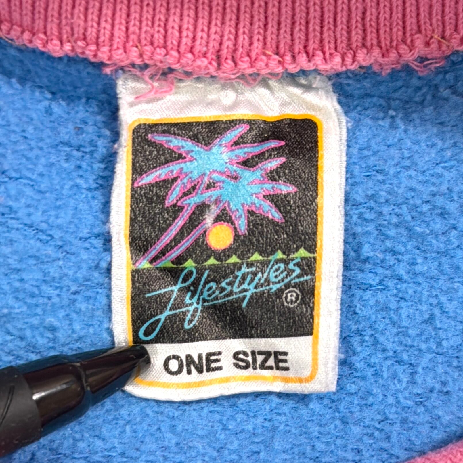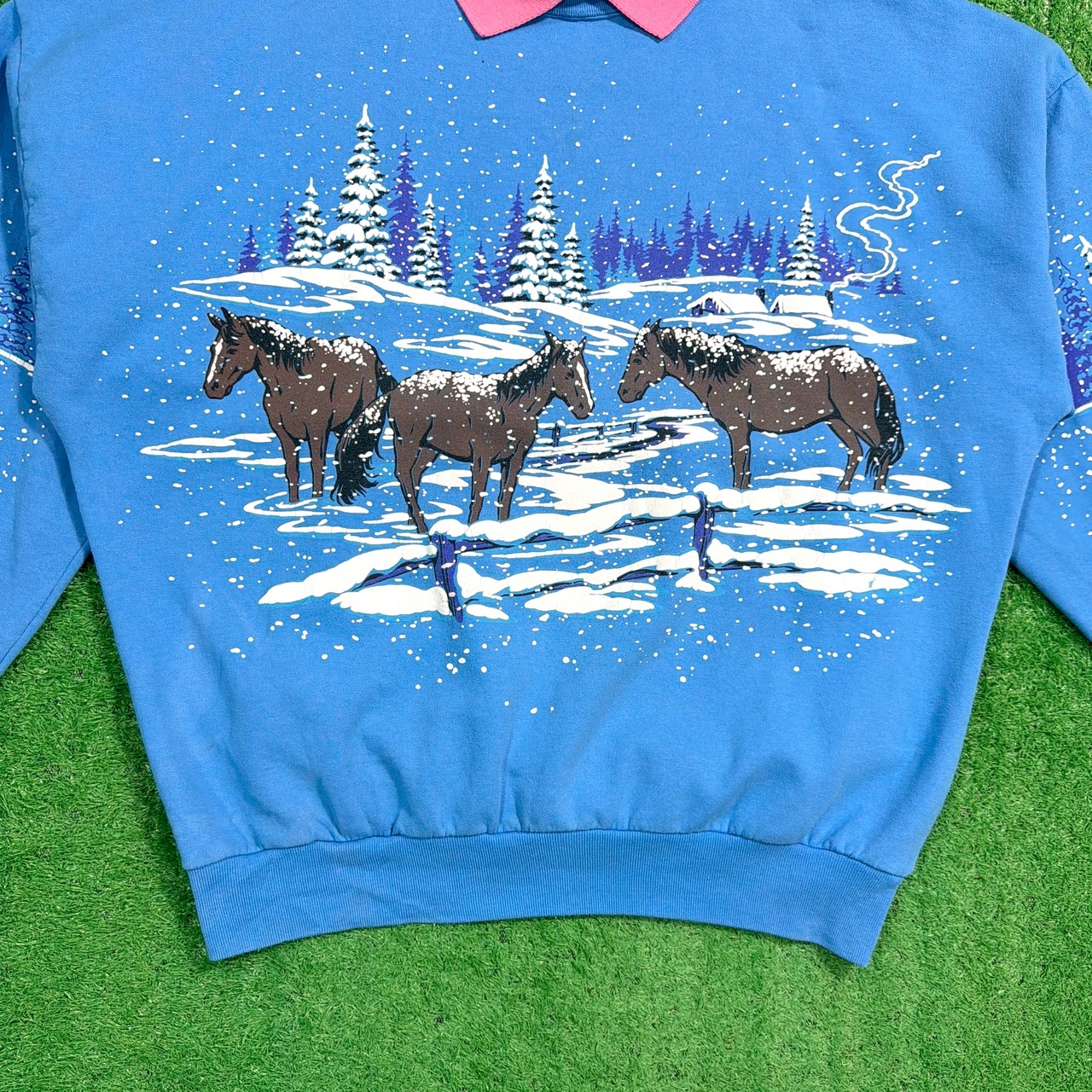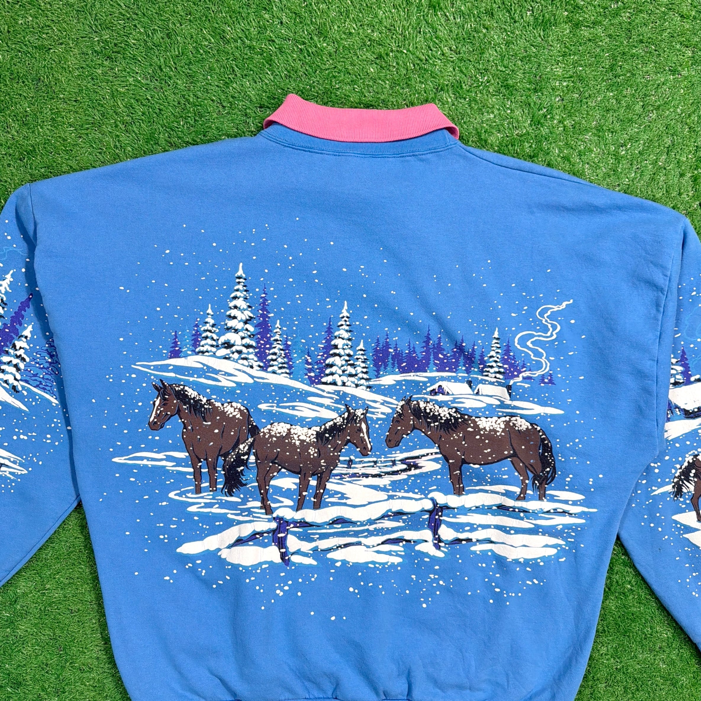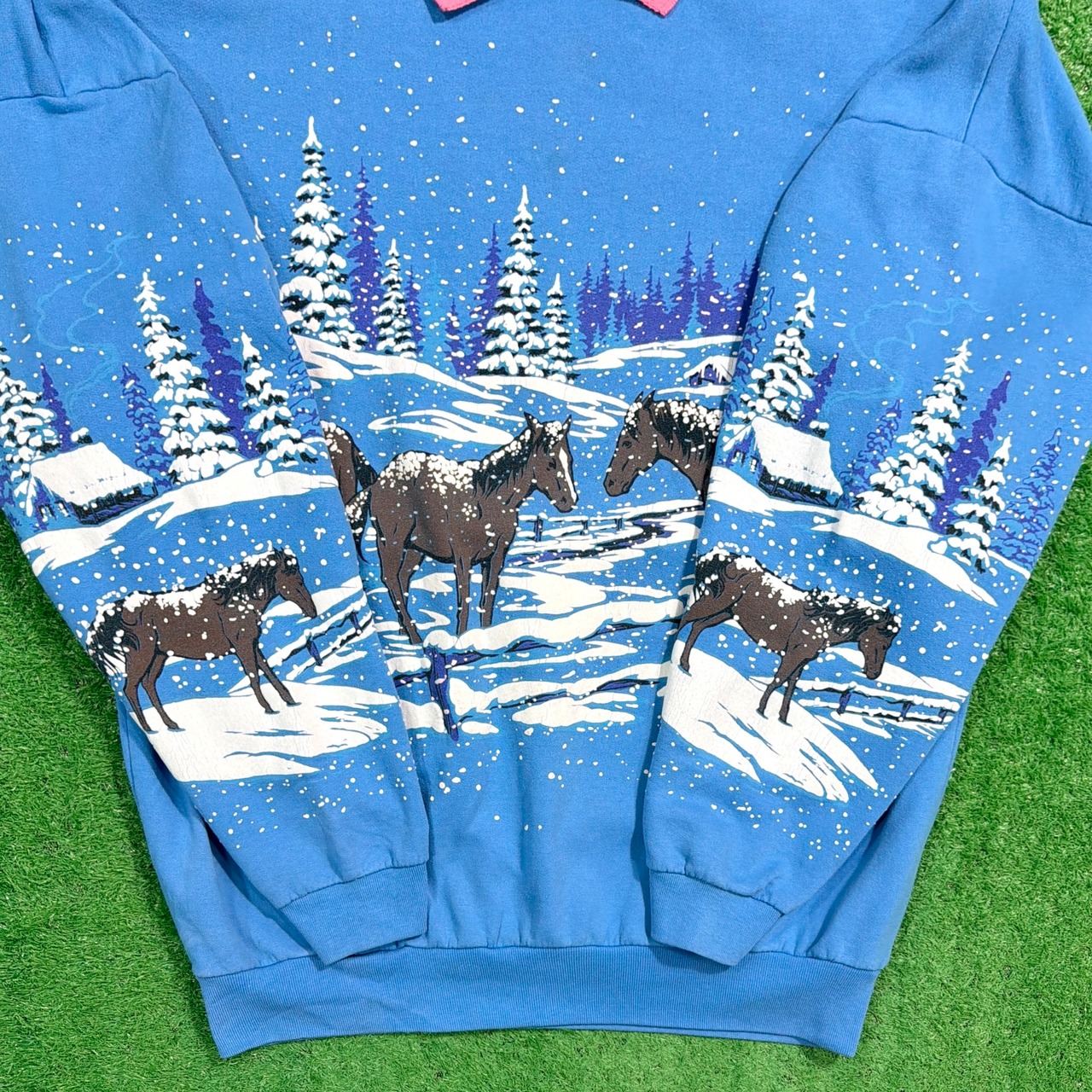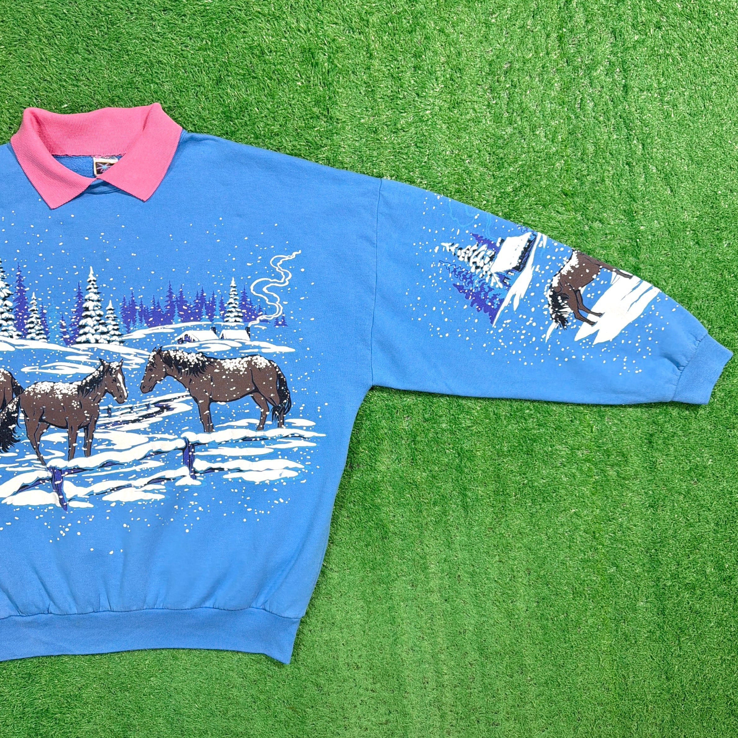 雪の中に佇む馬たちが描かれたアニマルプリントデザイン。ブルーのボディに映える幻想的な冬の風景が印象的です。袖にも続くプリントが施されており、全体でストーリー性を感じさせる一枚。ピンクの襟がアクセントになっており、90sらしい遊び心のあるデザインです。