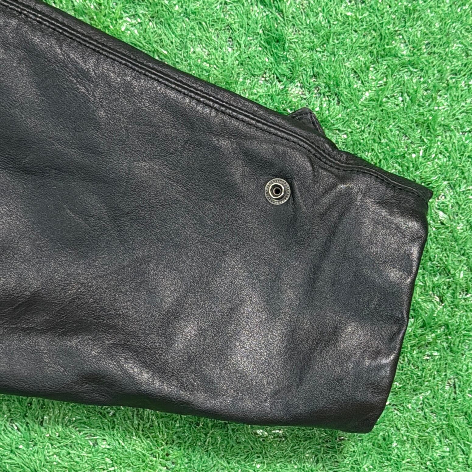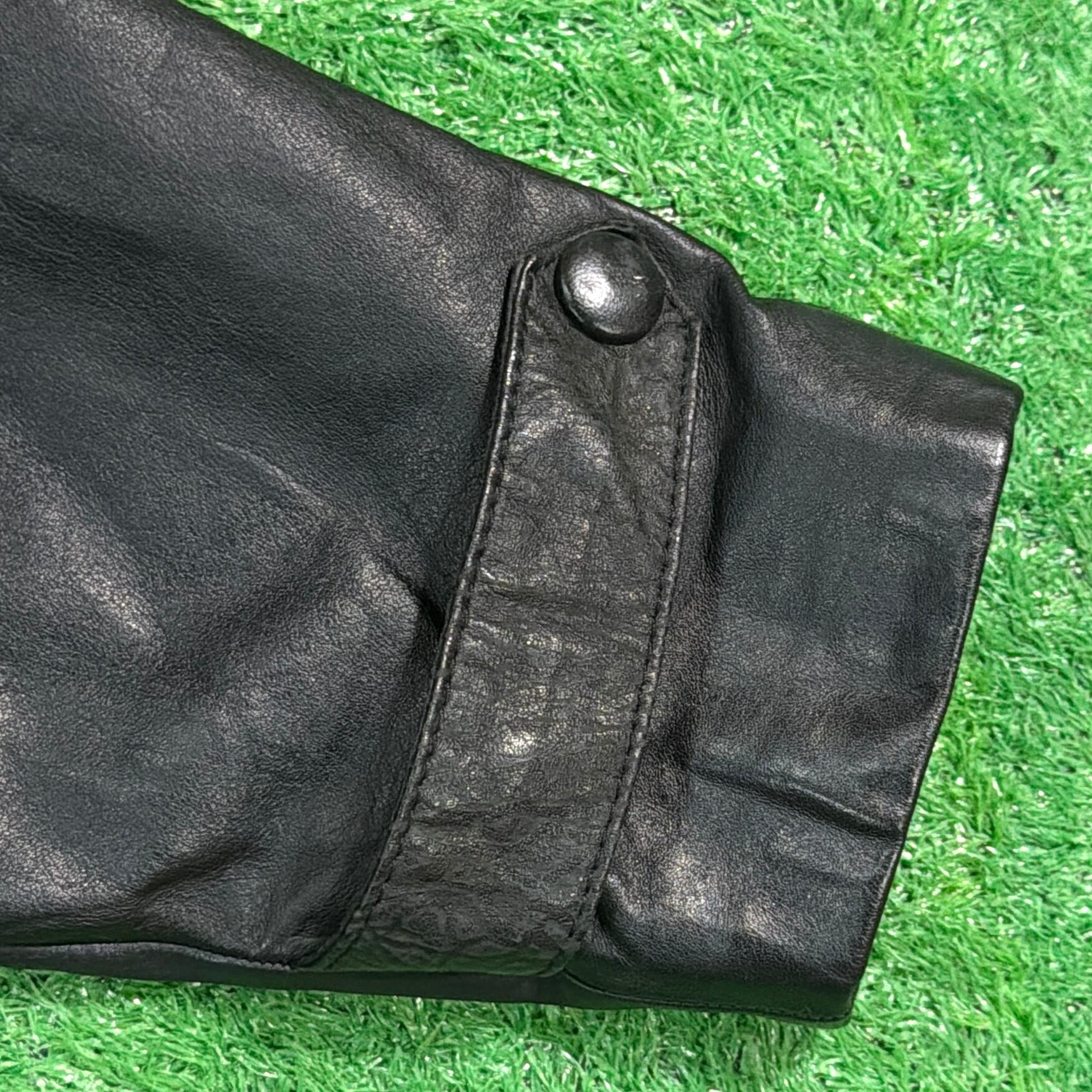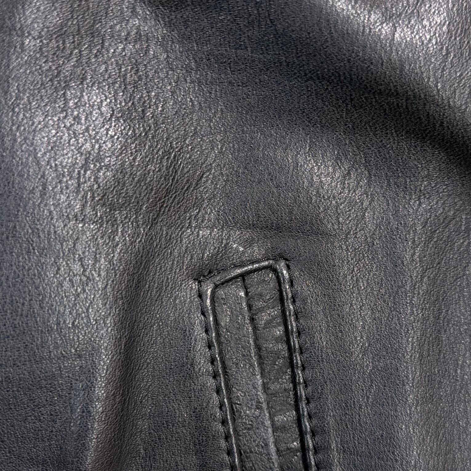 しなやかなレザーを使用したシングルライダース風のデザインで、短めの丈感とウエストベルト風の切り替えが特徴。フロントは開けても閉めてもバランスが良く、深めの襟とゆとりのあるシルエットが90sらしい雰囲気を演出します。裏地にはレッドカラーの生地が使用され、見えない部分までこだわりを感じる1着です。