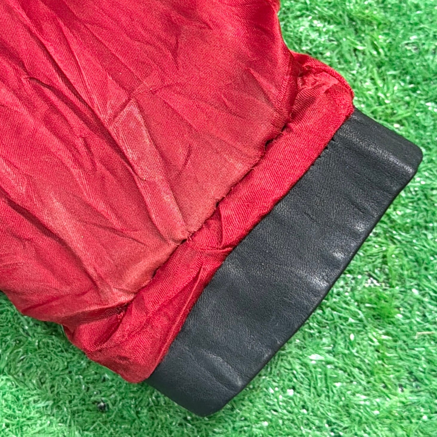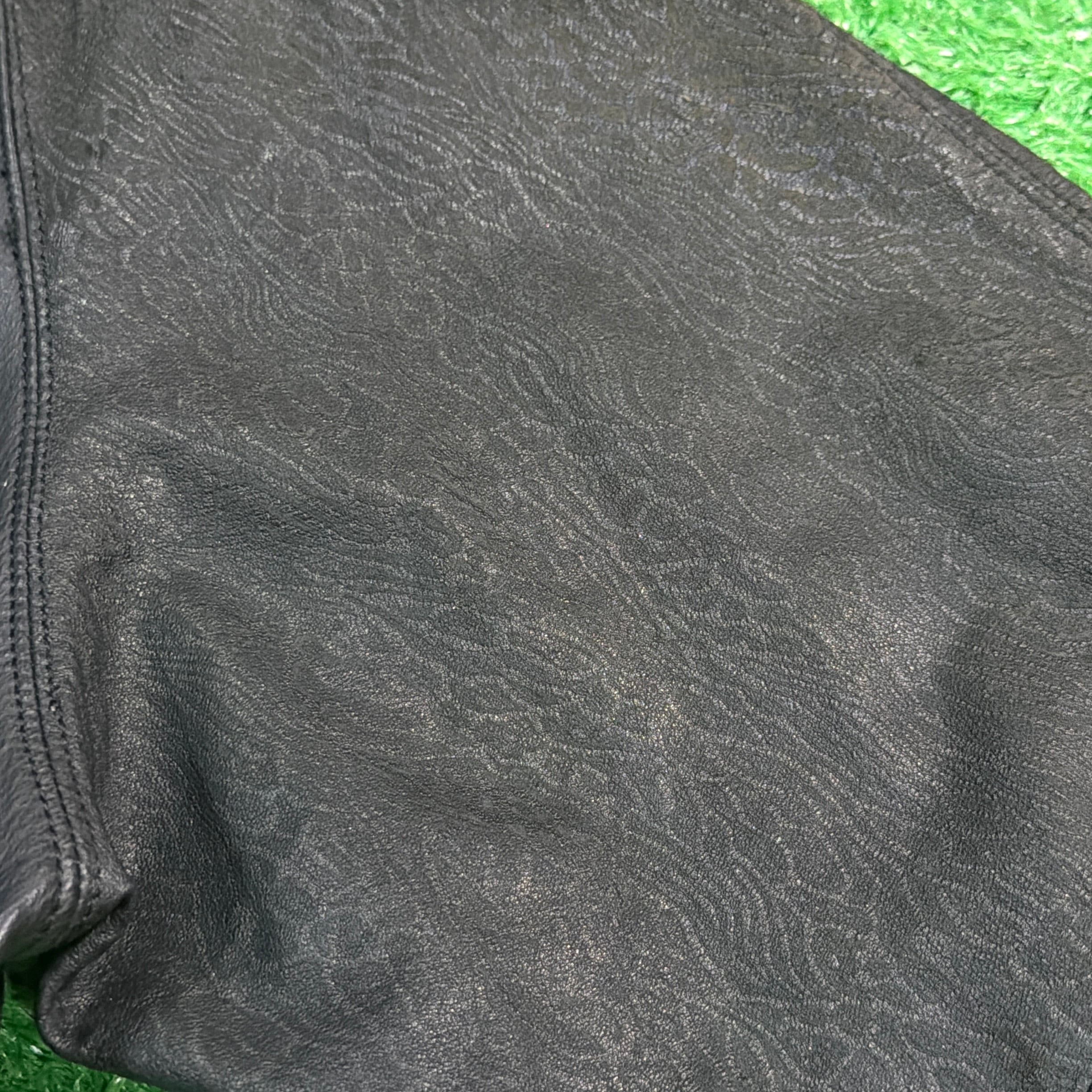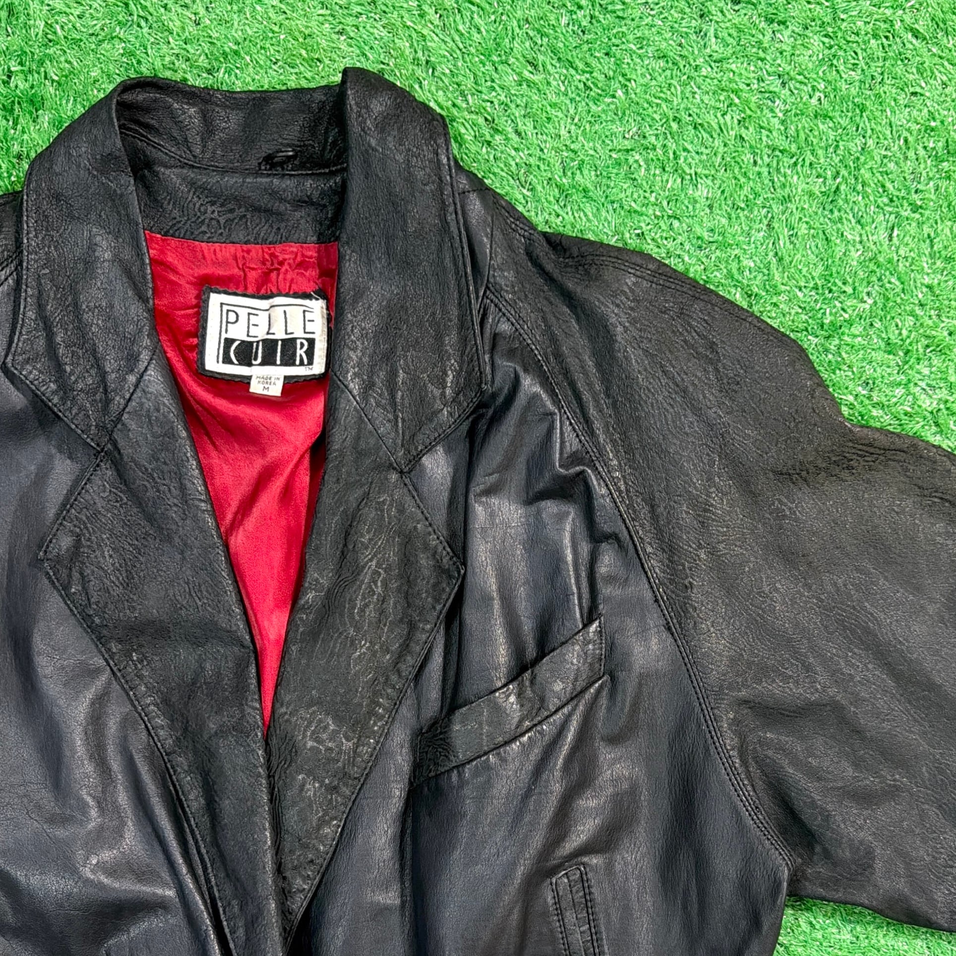 しなやかなレザーを使用したシングルライダース風のデザインで、短めの丈感とウエストベルト風の切り替えが特徴。フロントは開けても閉めてもバランスが良く、深めの襟とゆとりのあるシルエットが90sらしい雰囲気を演出します。裏地にはレッドカラーの生地が使用され、見えない部分までこだわりを感じる1着です。