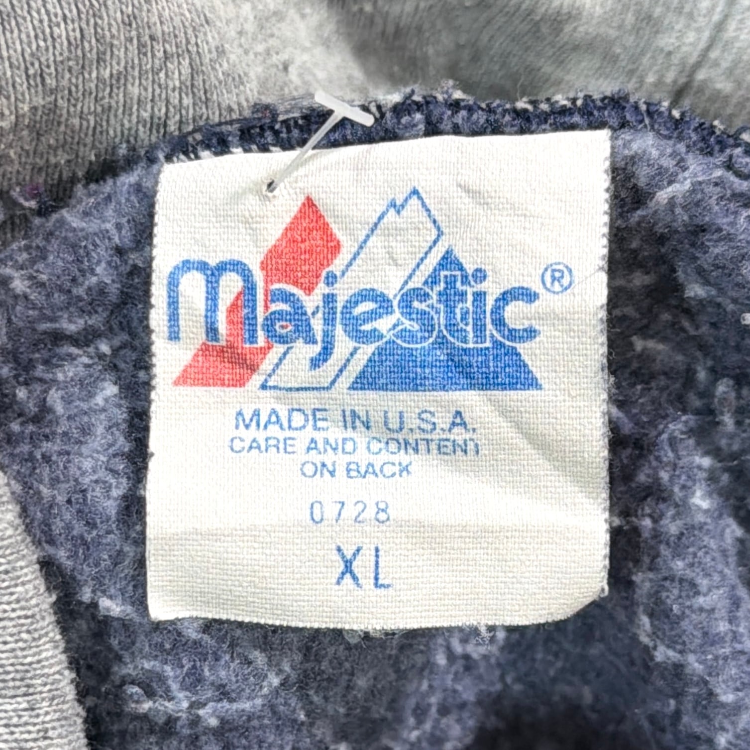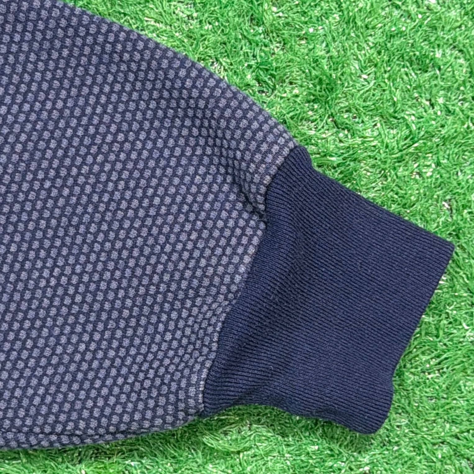 胸元にはチームロゴの刺繍デザイン入りで、ネック部分にはロゴ入りのタートルが縫い付けられた珍しい一枚。やや凹凸感のあるワッフル調スウェット生地で、柔らかく軽い着心地ながらも暖かさがあります。裾・袖リブのネイビーカラーが全体を引き締めてくれます。