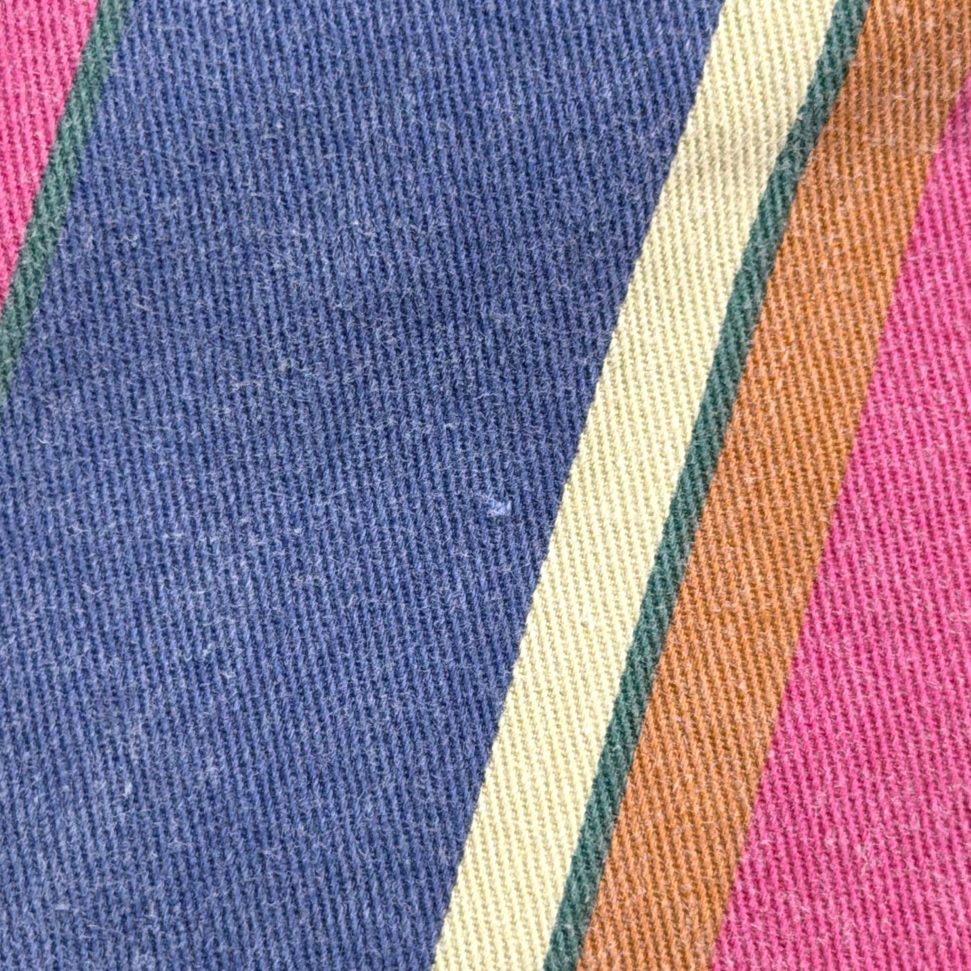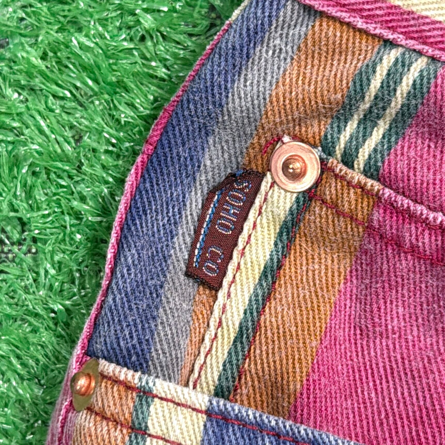 鮮やかなカラーが縦に並ぶマルチストライプデザイン。ハイウエスト気味のシルエットで、腰まわりに程よくゆとりがありながら、裾にかけてややテーパードしたラインがきれいな一本です。コットン素材で軽く、デニムよりも柔らかな穿き心地。