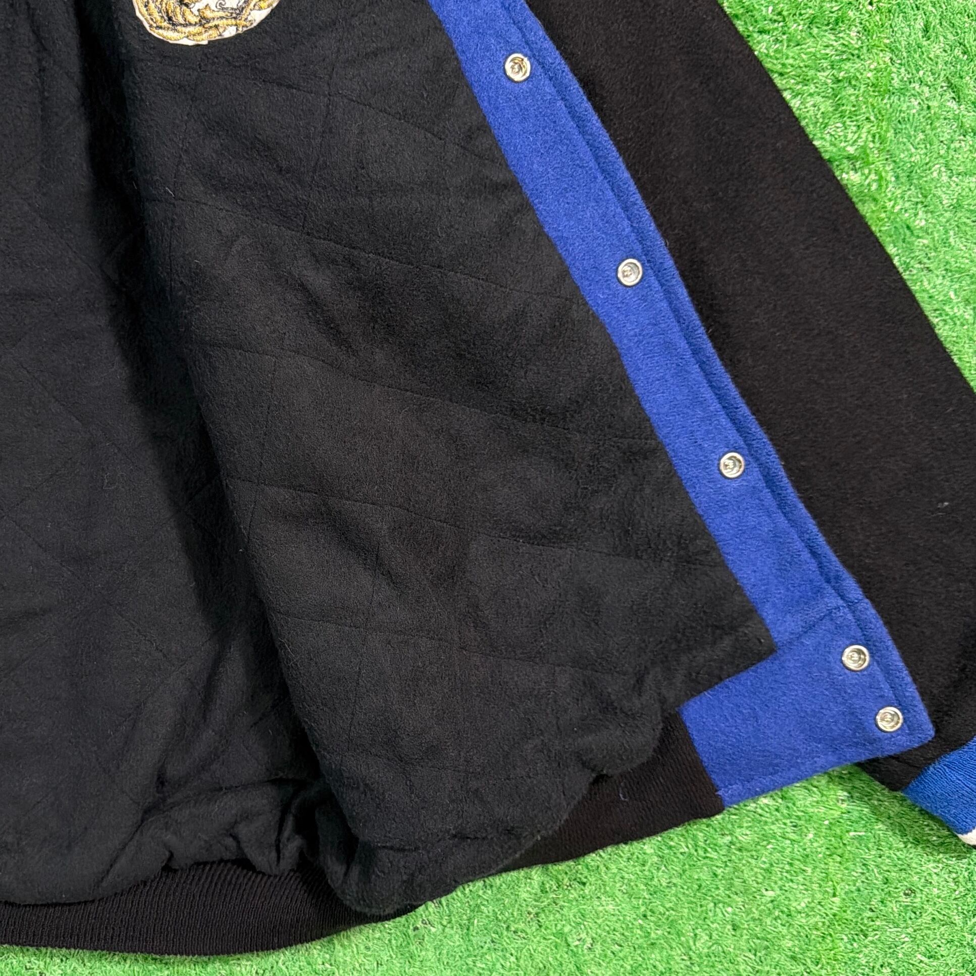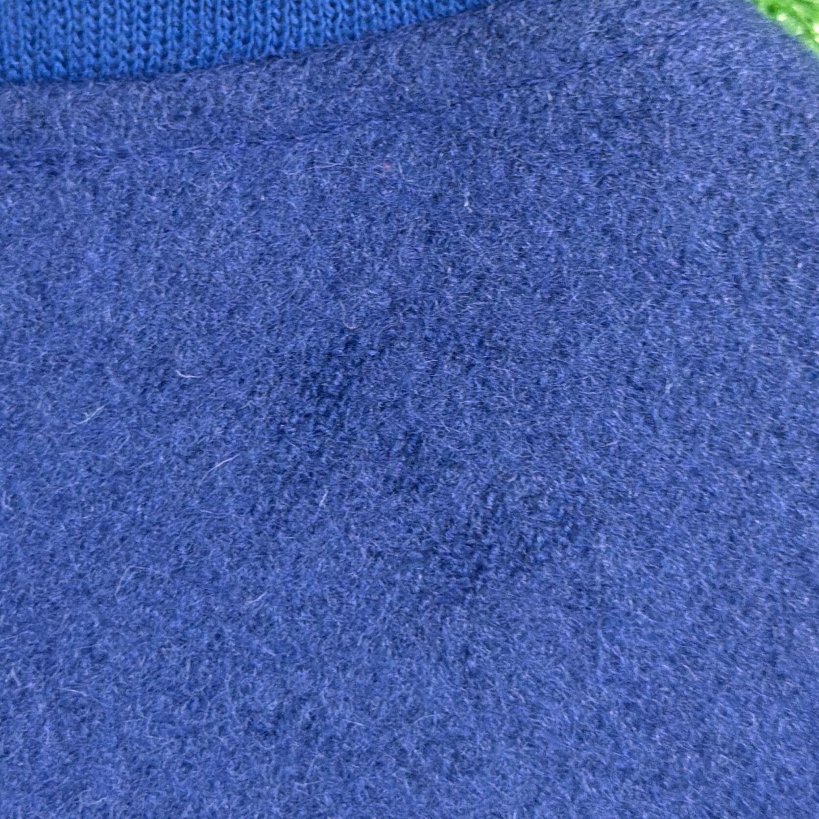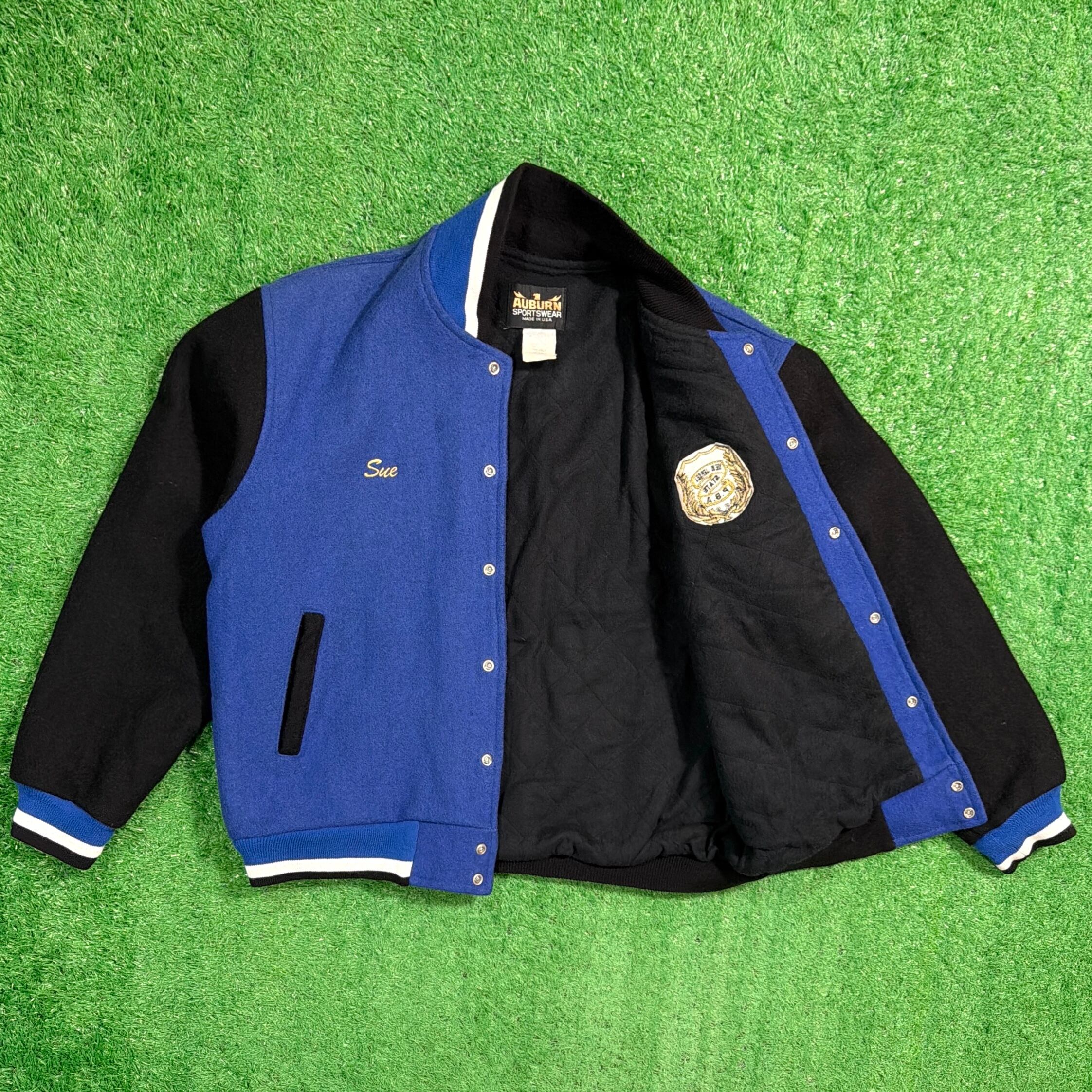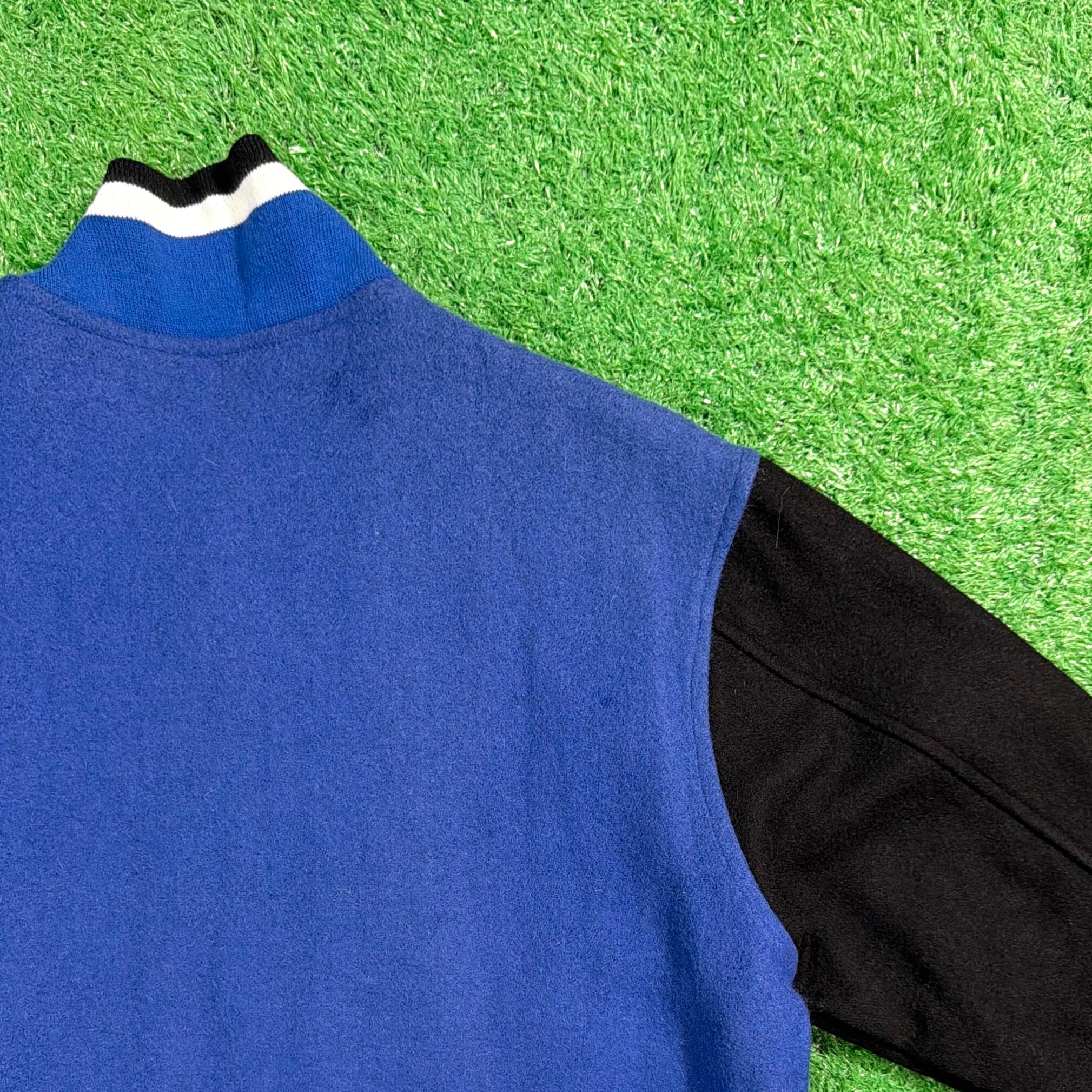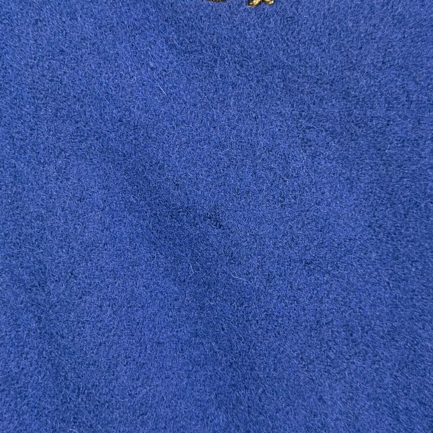 鮮やかなブルー×ブラックの配色に、胸元には金糸で刺繍されたエンブレムと「Sue」のネーム刺繍入り。ウール混のしっかりとした生地感で、クラシックな雰囲気を感じる一着です。袖やリブの配色ラインもアクセントになっています。