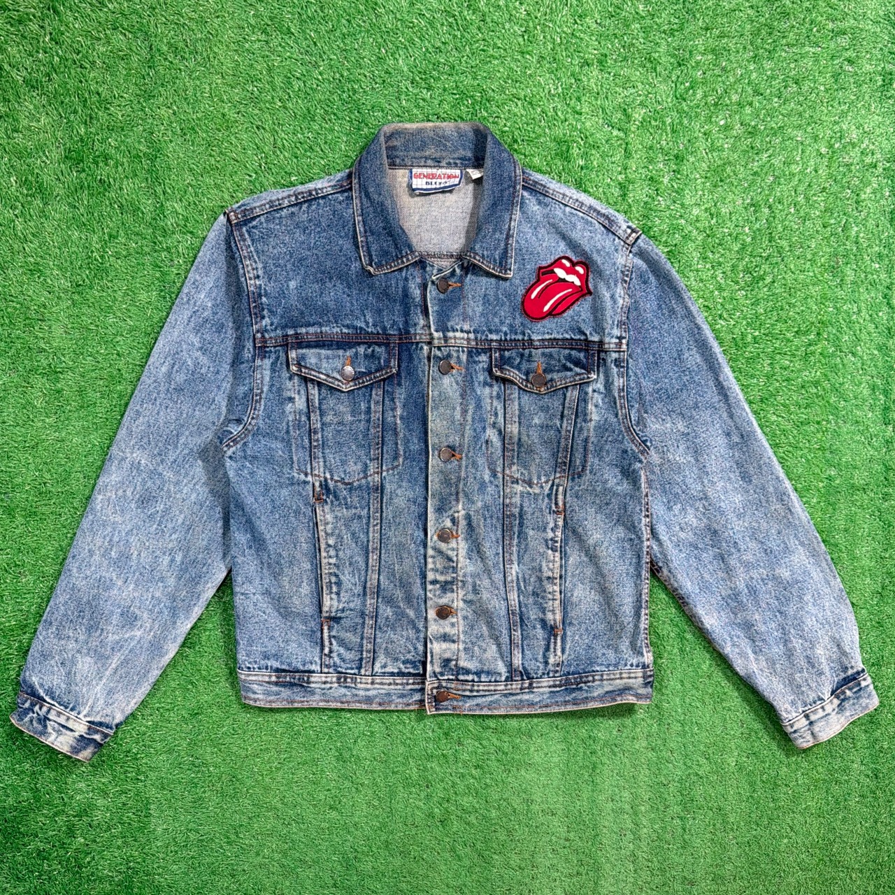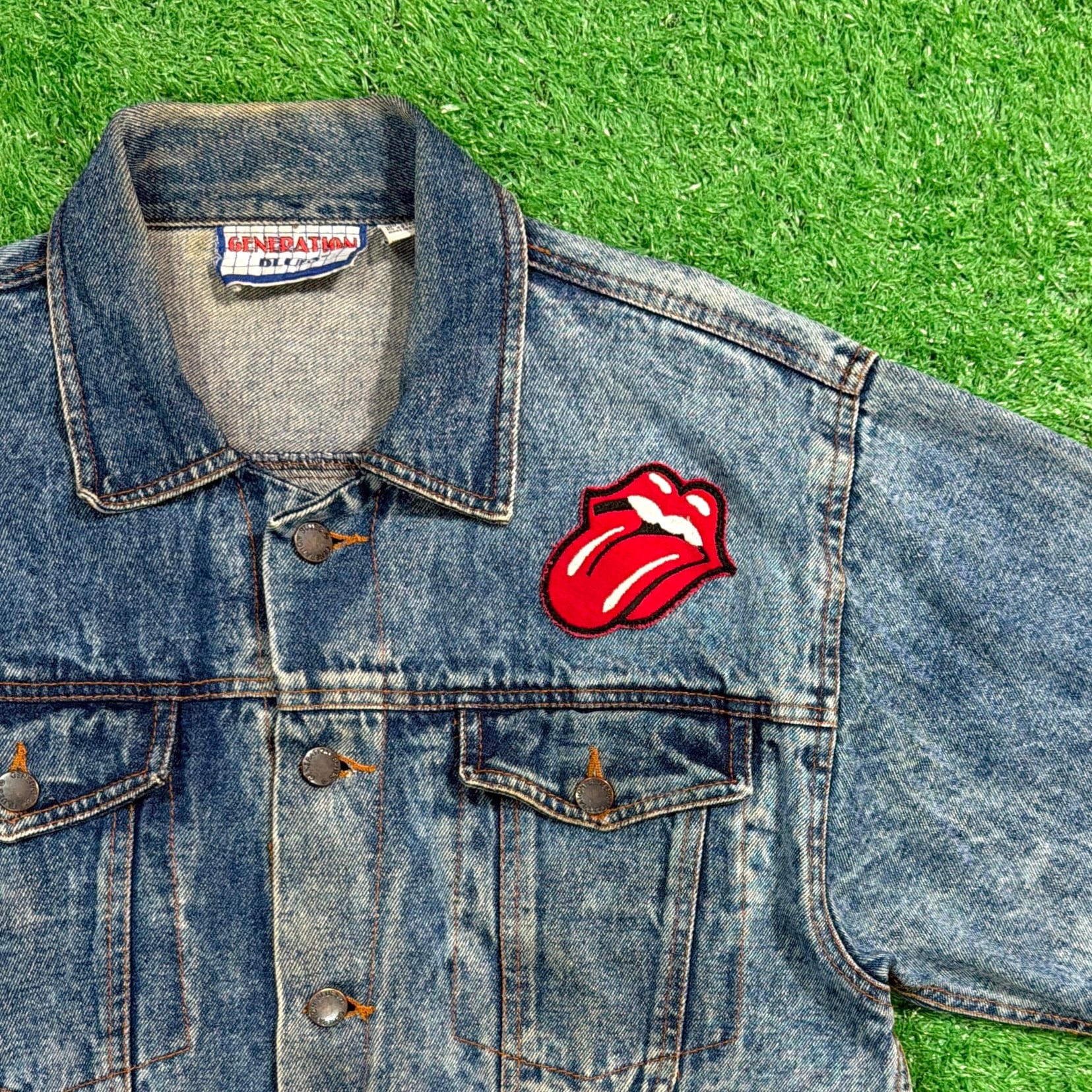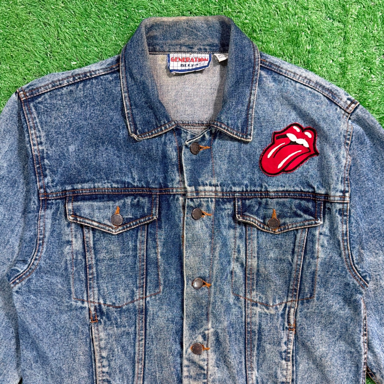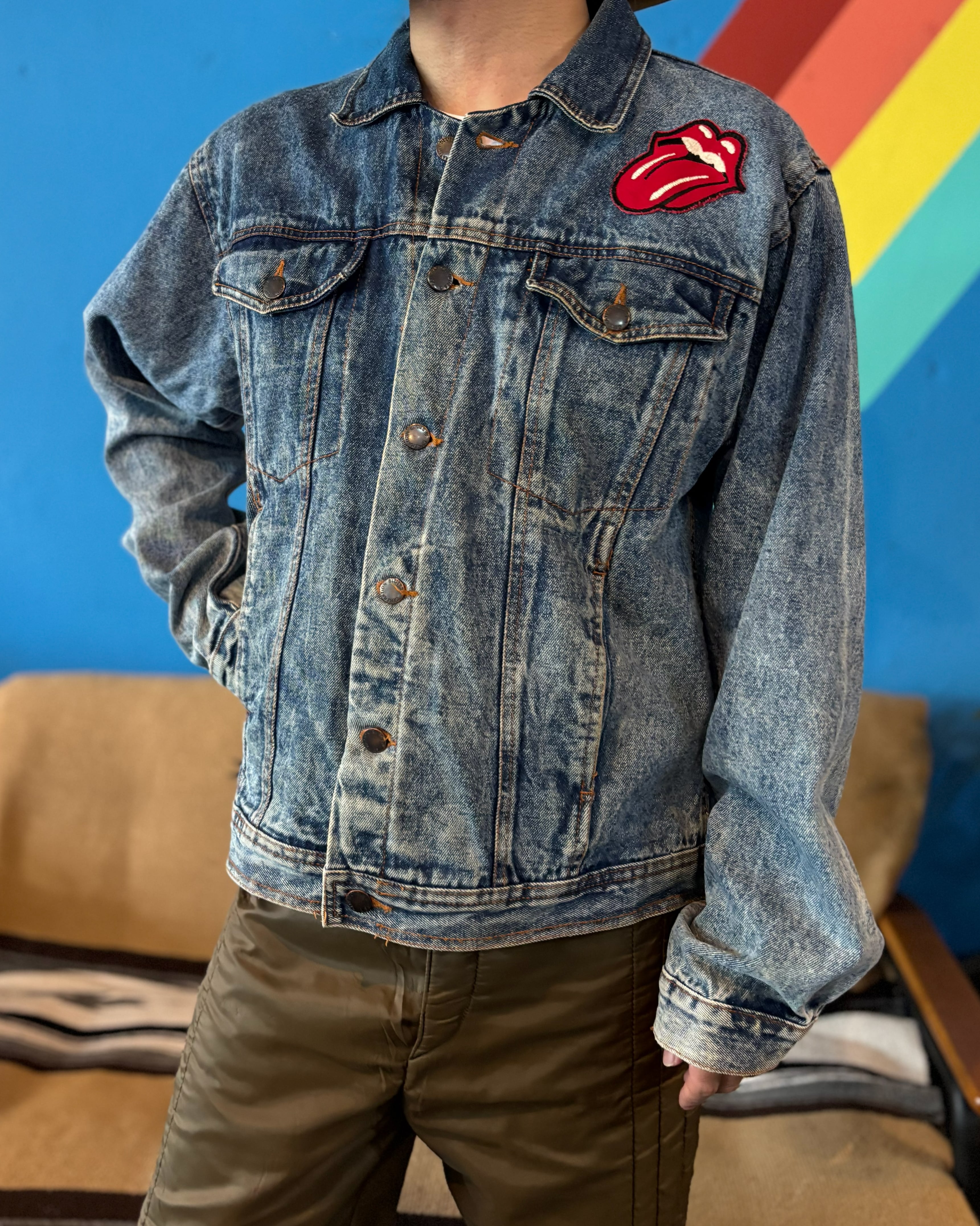 程よく色落ちしたブルーデニムに、赤のストーンズワッペンが映える一着。フロントに配置されたワッペンは後付けの可能性がありますが、全体としてヴィンテージらしい雰囲気に仕上がっています。シルエットはややコンパクトなボックス型で、90年代らしいバランス感のある一着です。