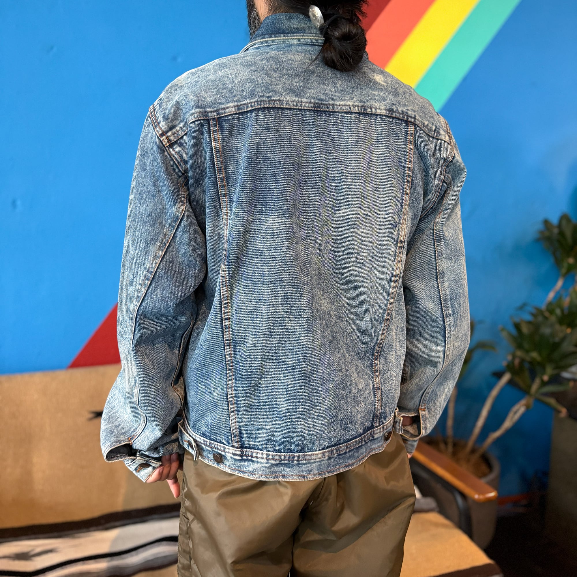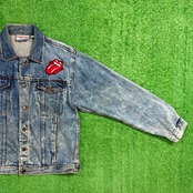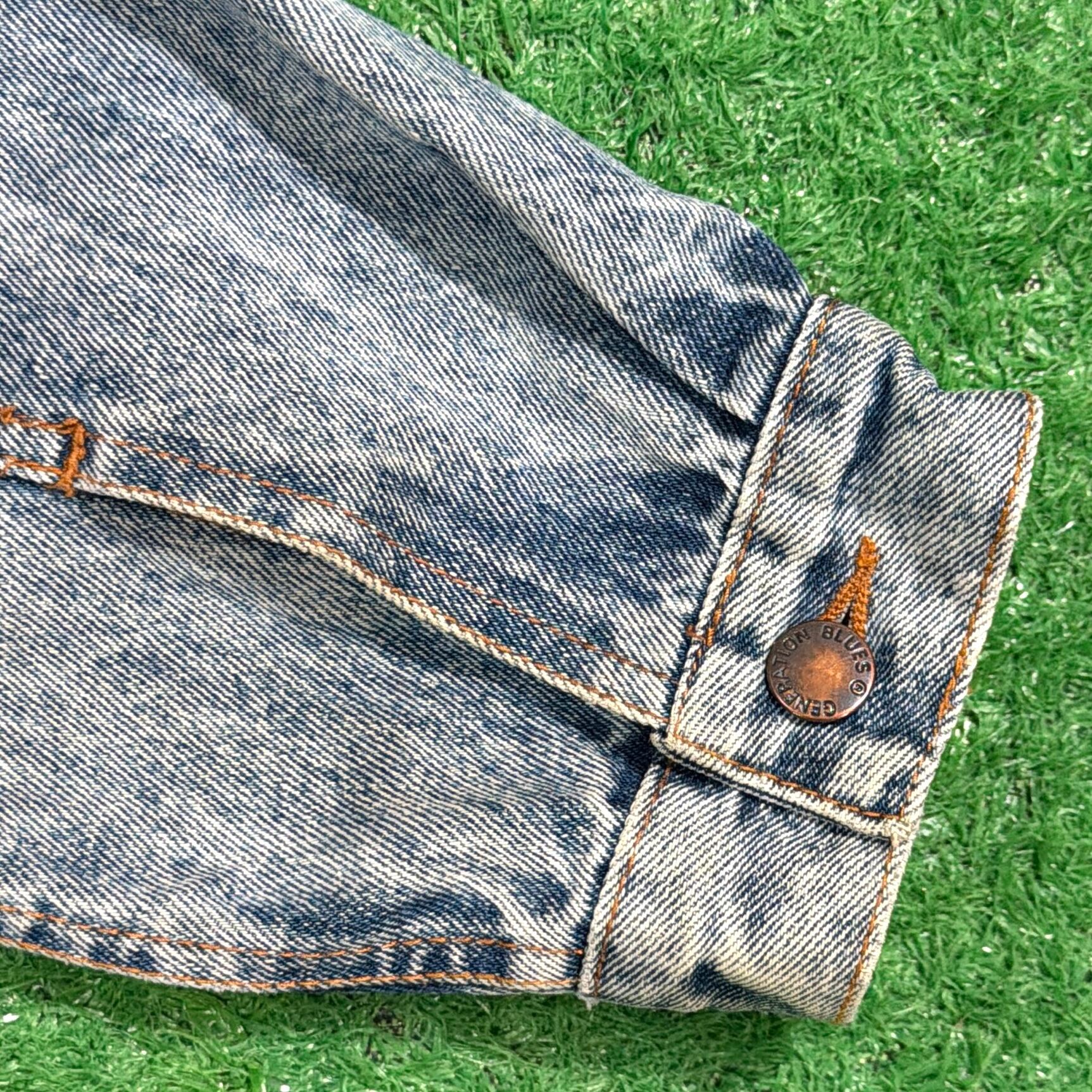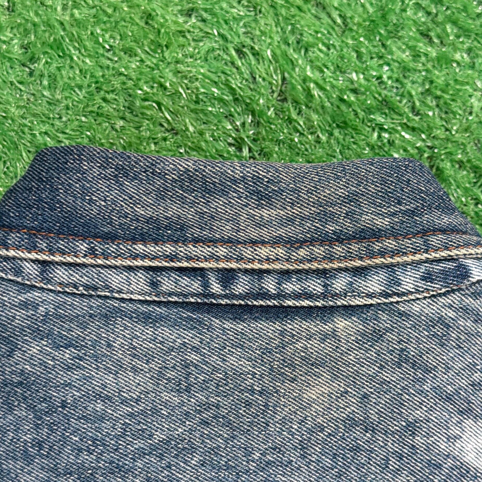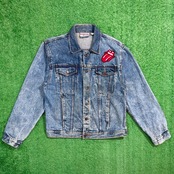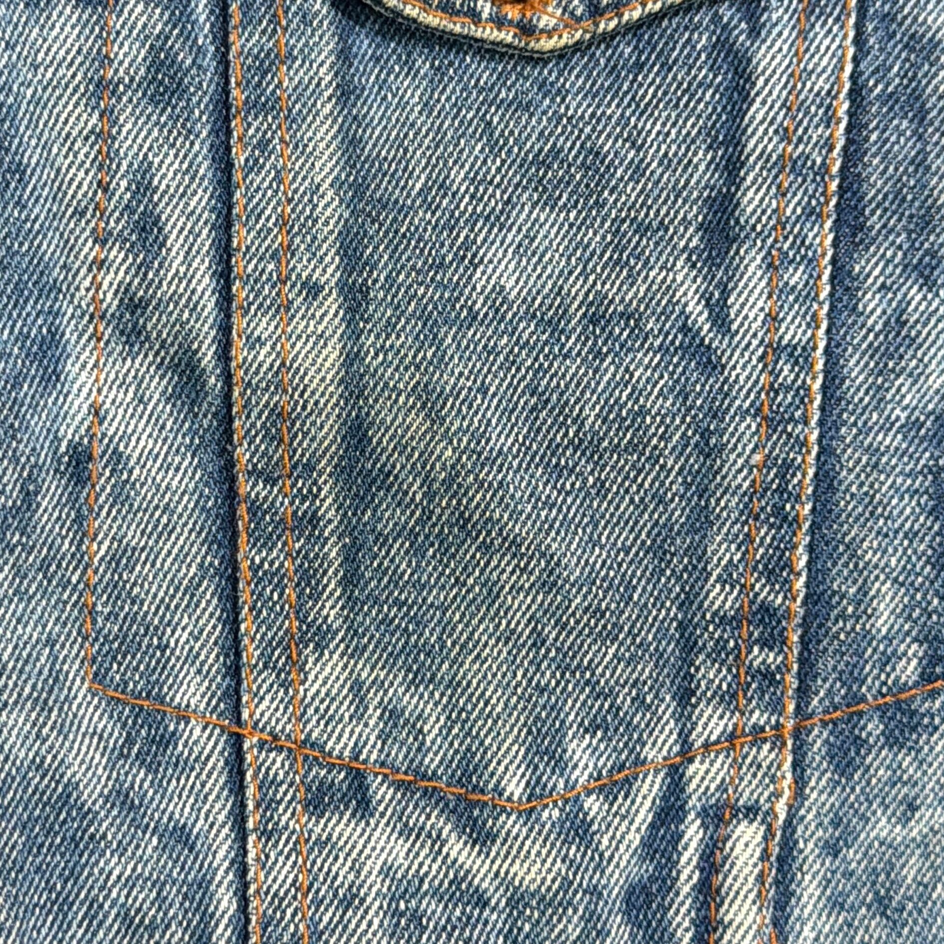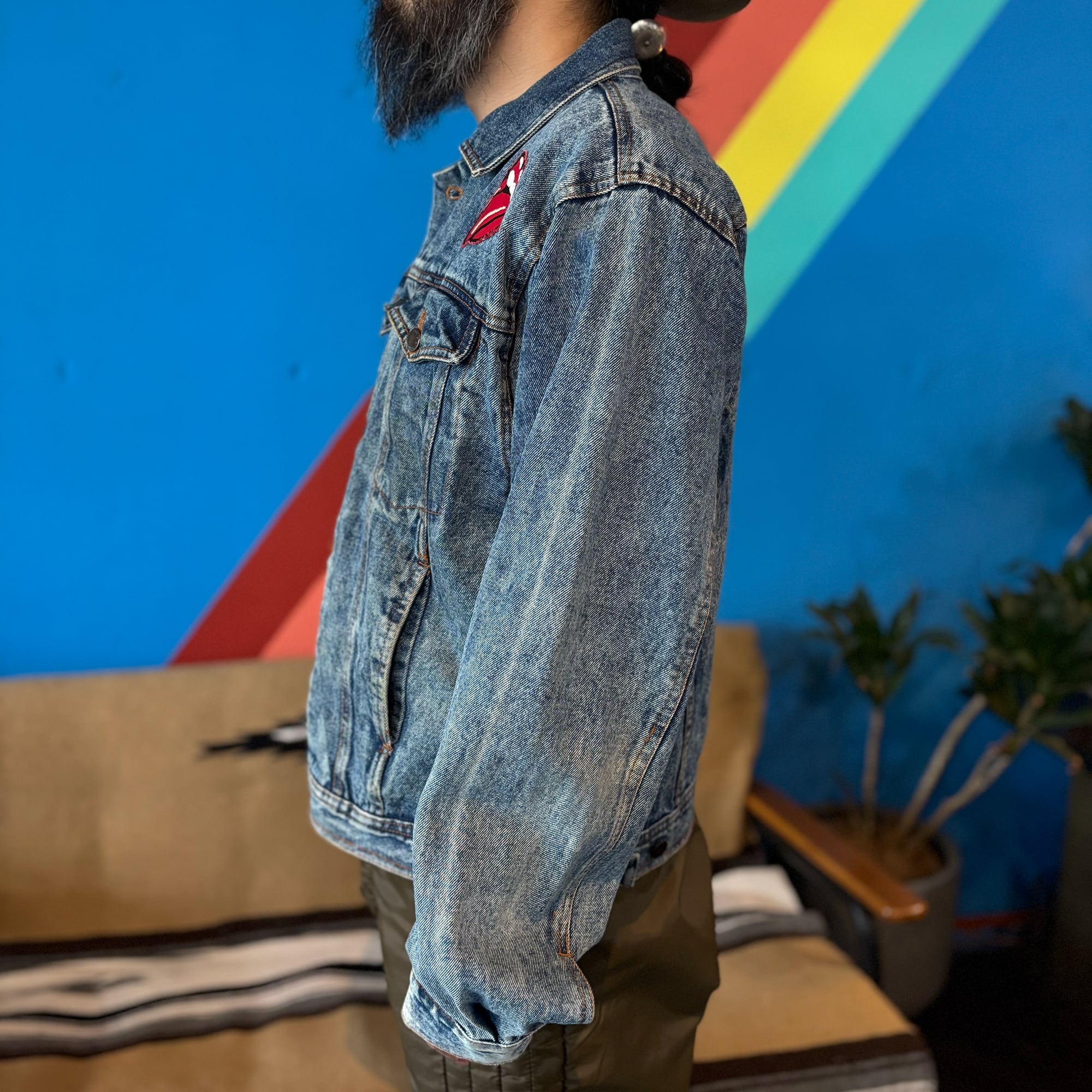 程よく色落ちしたブルーデニムに、赤のストーンズワッペンが映える一着。フロントに配置されたワッペンは後付けの可能性がありますが、全体としてヴィンテージらしい雰囲気に仕上がっています。シルエットはややコンパクトなボックス型で、90年代らしいバランス感のある一着です。