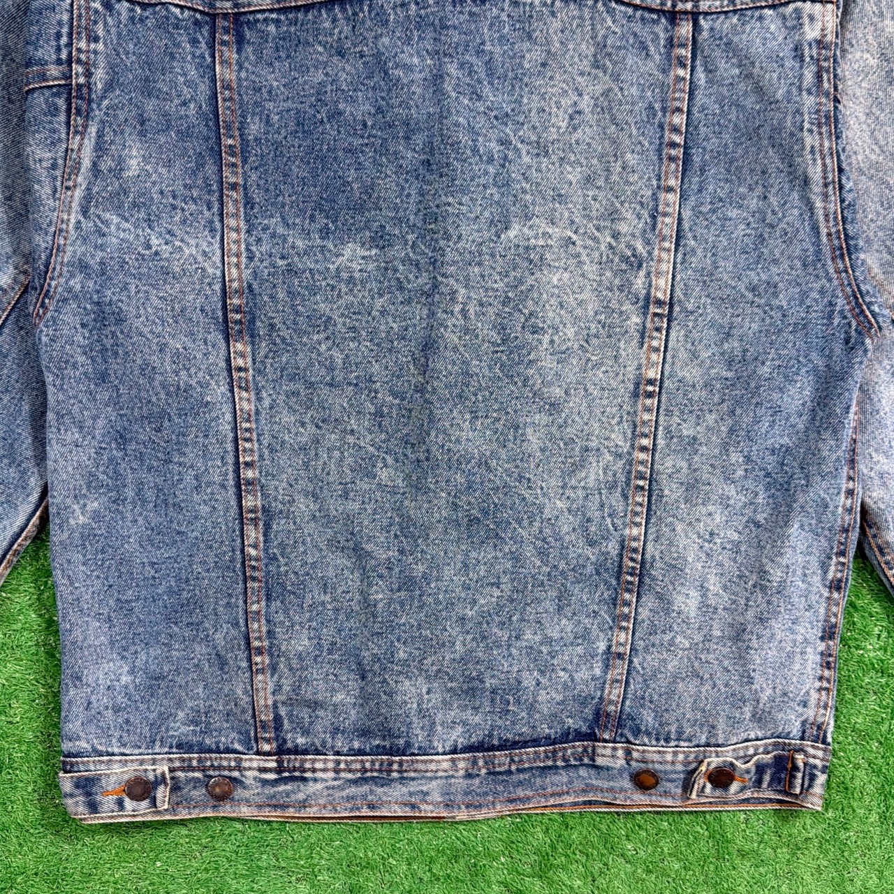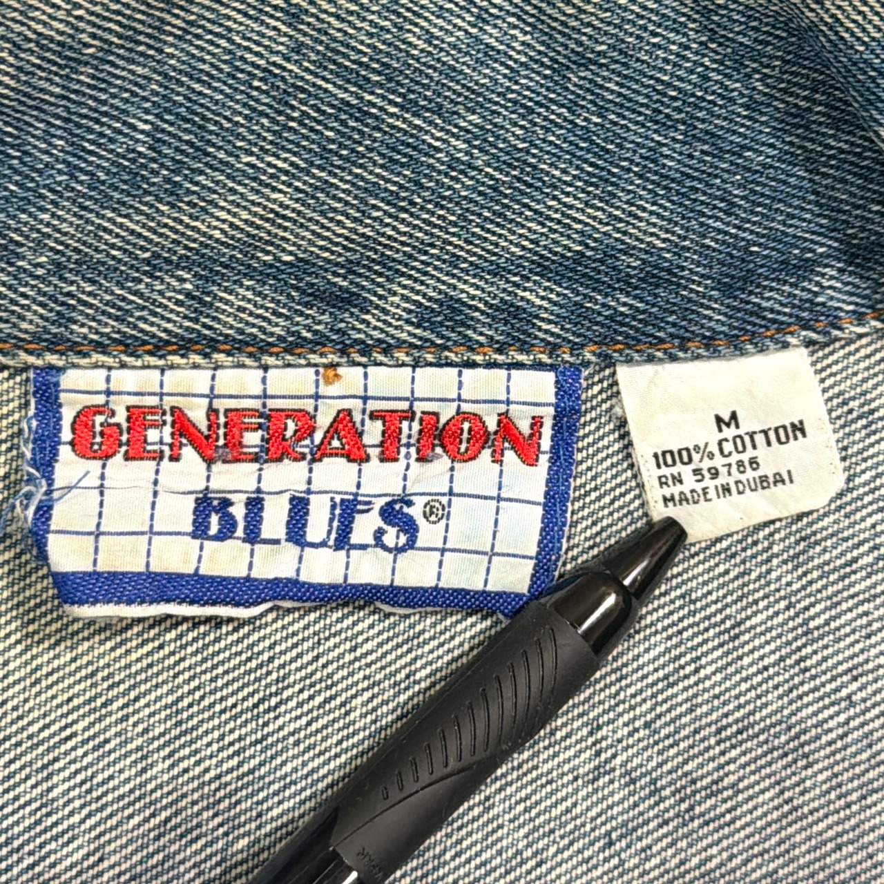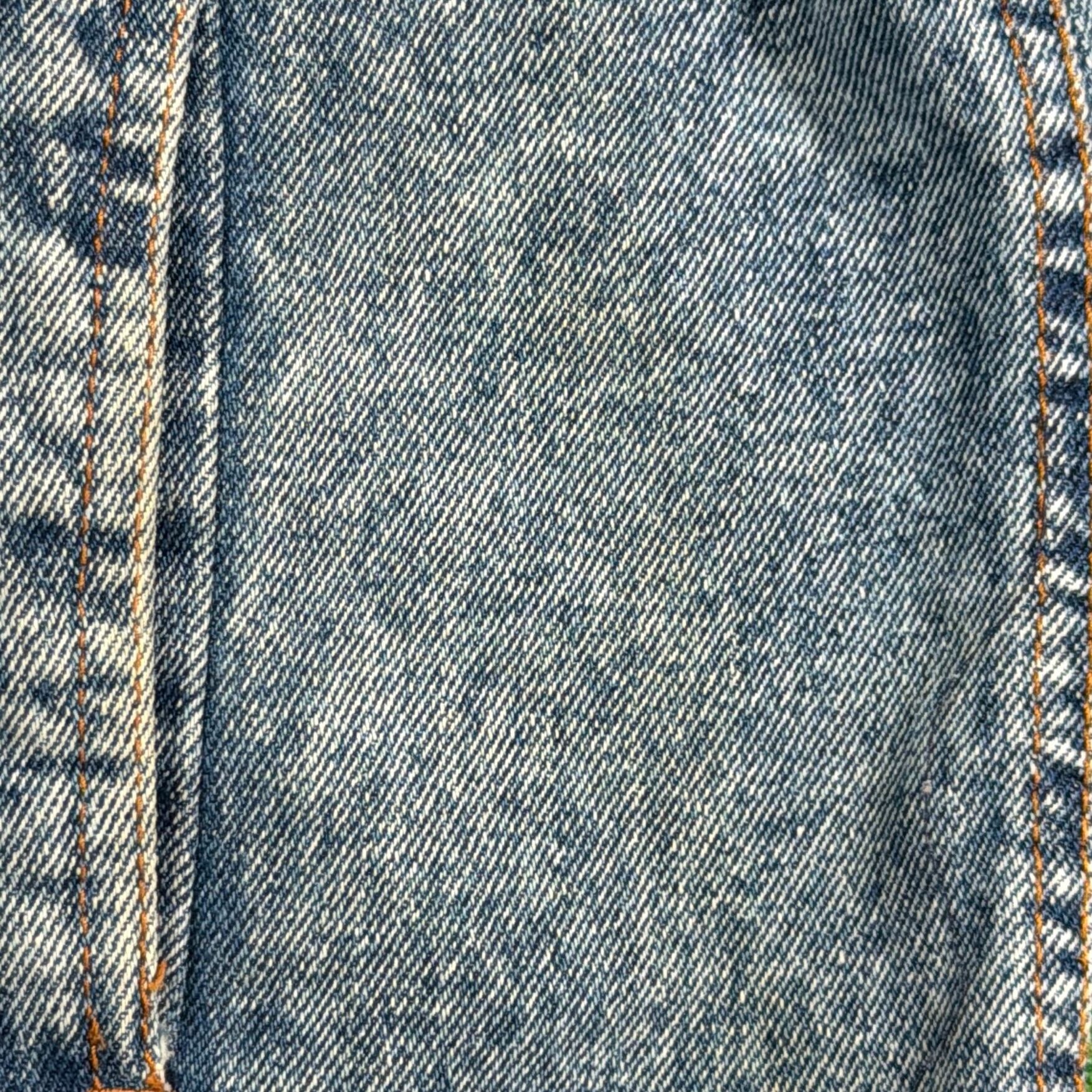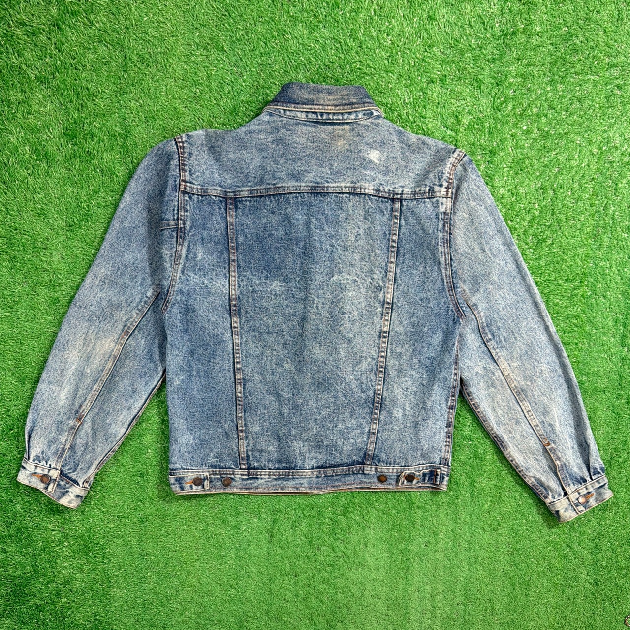 程よく色落ちしたブルーデニムに、赤のストーンズワッペンが映える一着。フロントに配置されたワッペンは後付けの可能性がありますが、全体としてヴィンテージらしい雰囲気に仕上がっています。シルエットはややコンパクトなボックス型で、90年代らしいバランス感のある一着です。