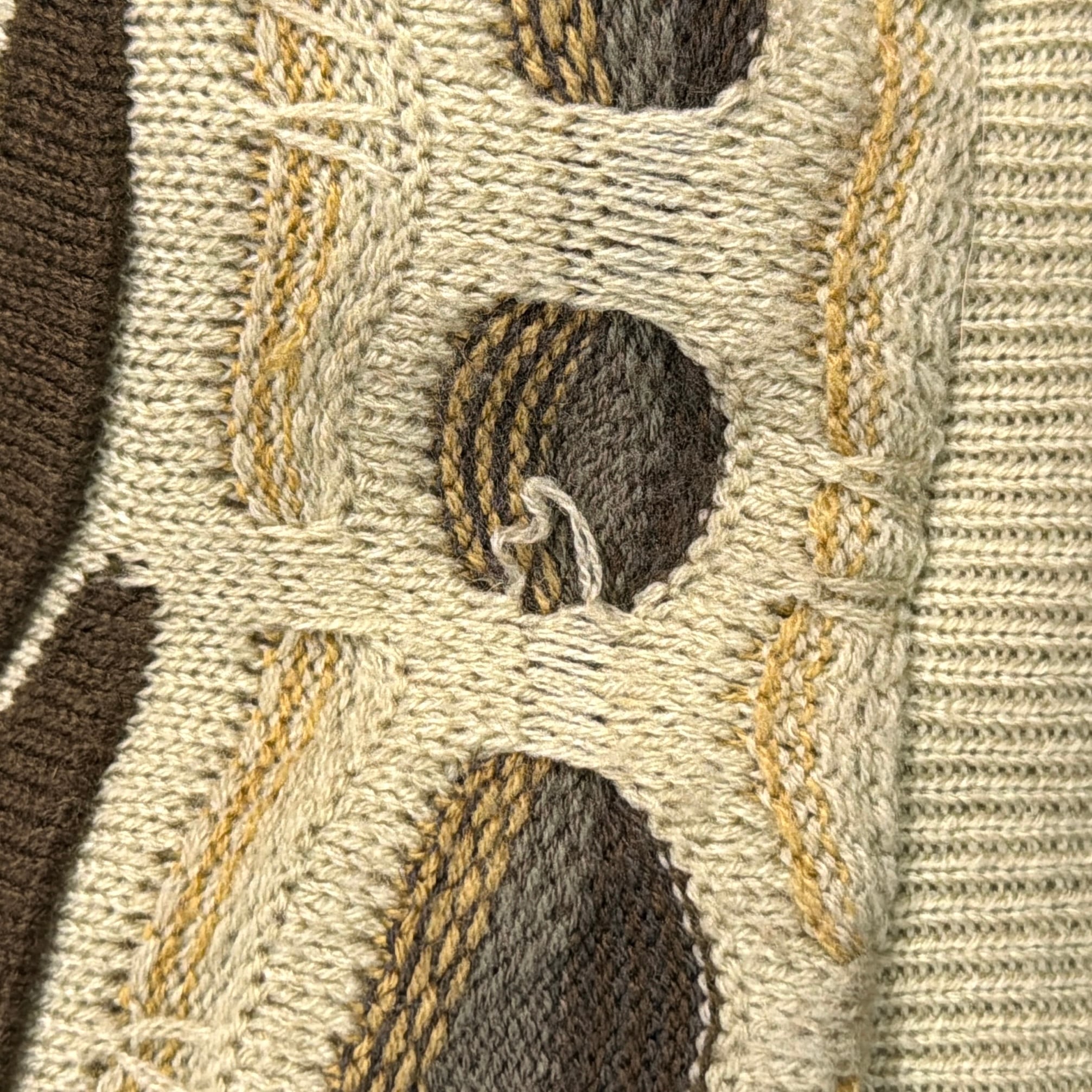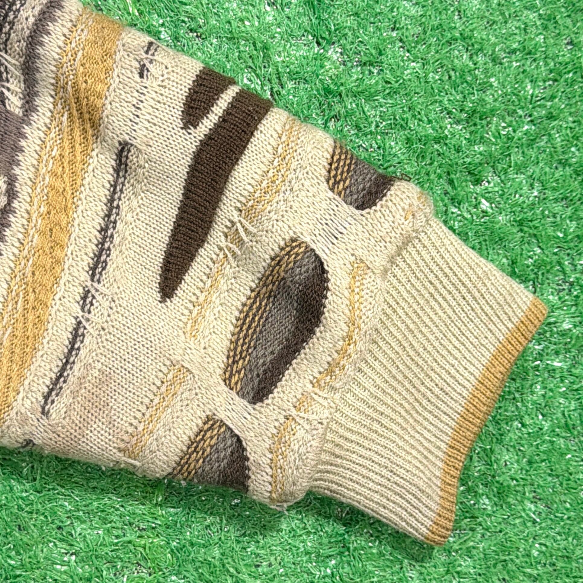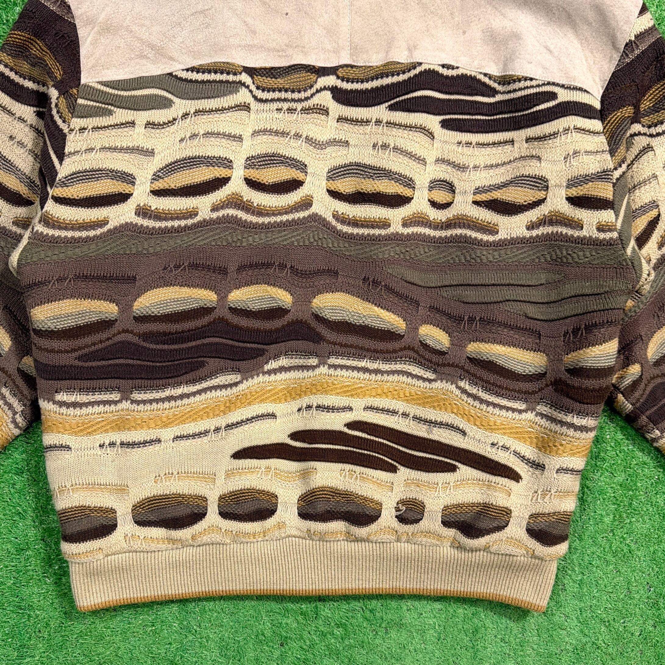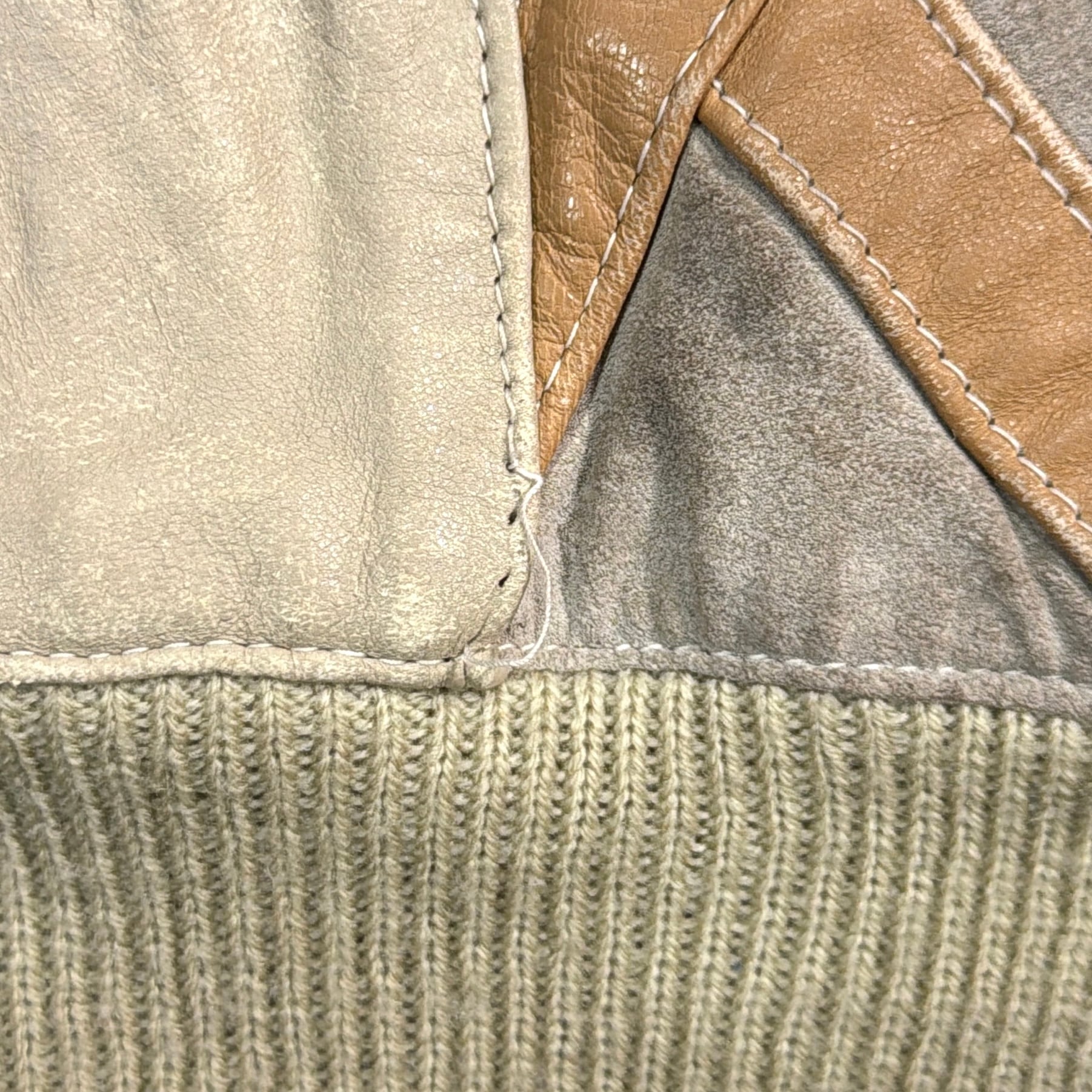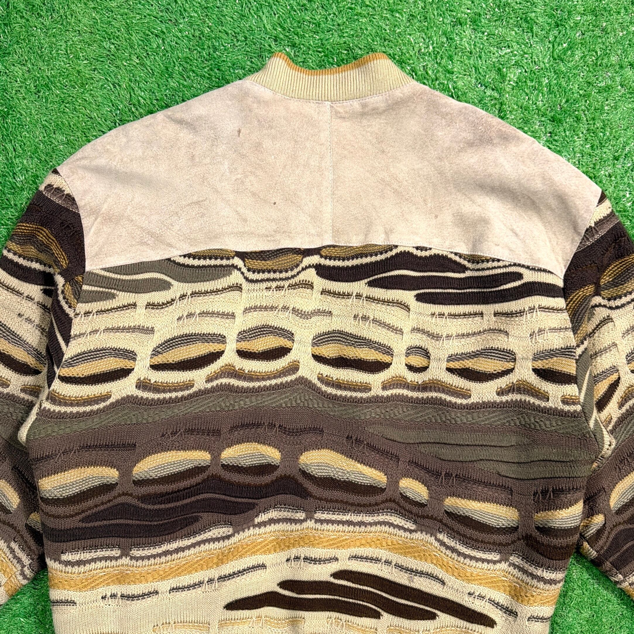 袖と背面に立体編み(3Dニット)を使用し、フロントにはレザーを組み合わせた個性的なデザイン。ベージュやブラウンを基調とした落ち着いた配色ながらも、立体感ある編み模様が存在感を放ちます。