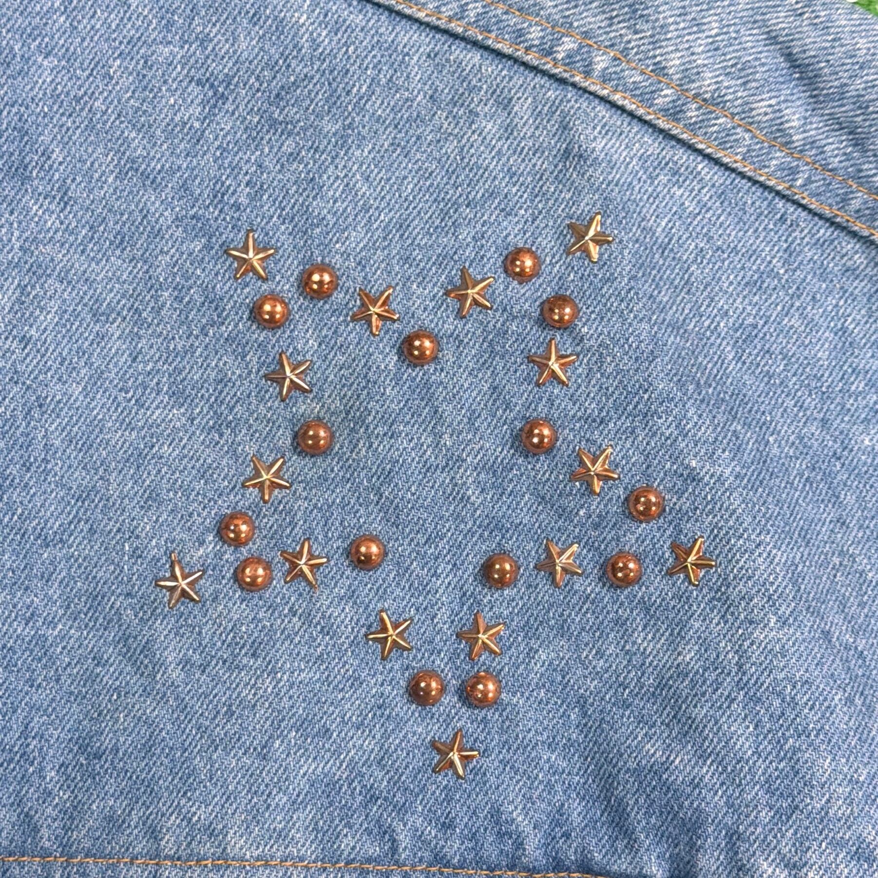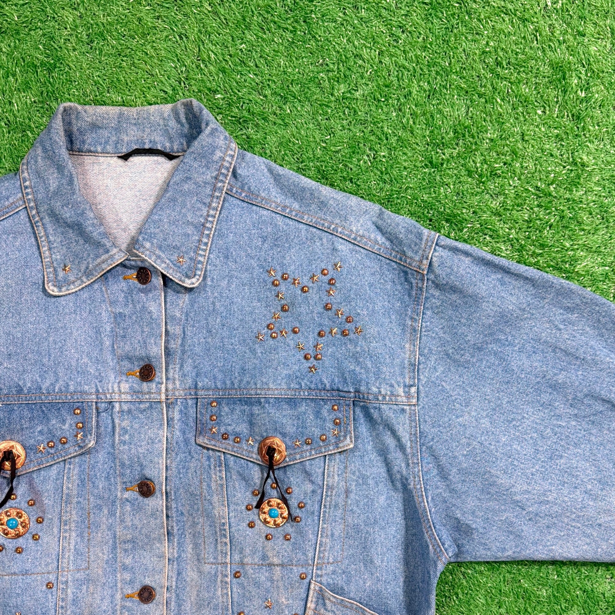 胸元に施されたコンチョボタンとスタースタッズが印象的な一着。クラシックなデニムの風合いに、ウエスタンやネイティブのムードを取り入れた個性的なデザインです。