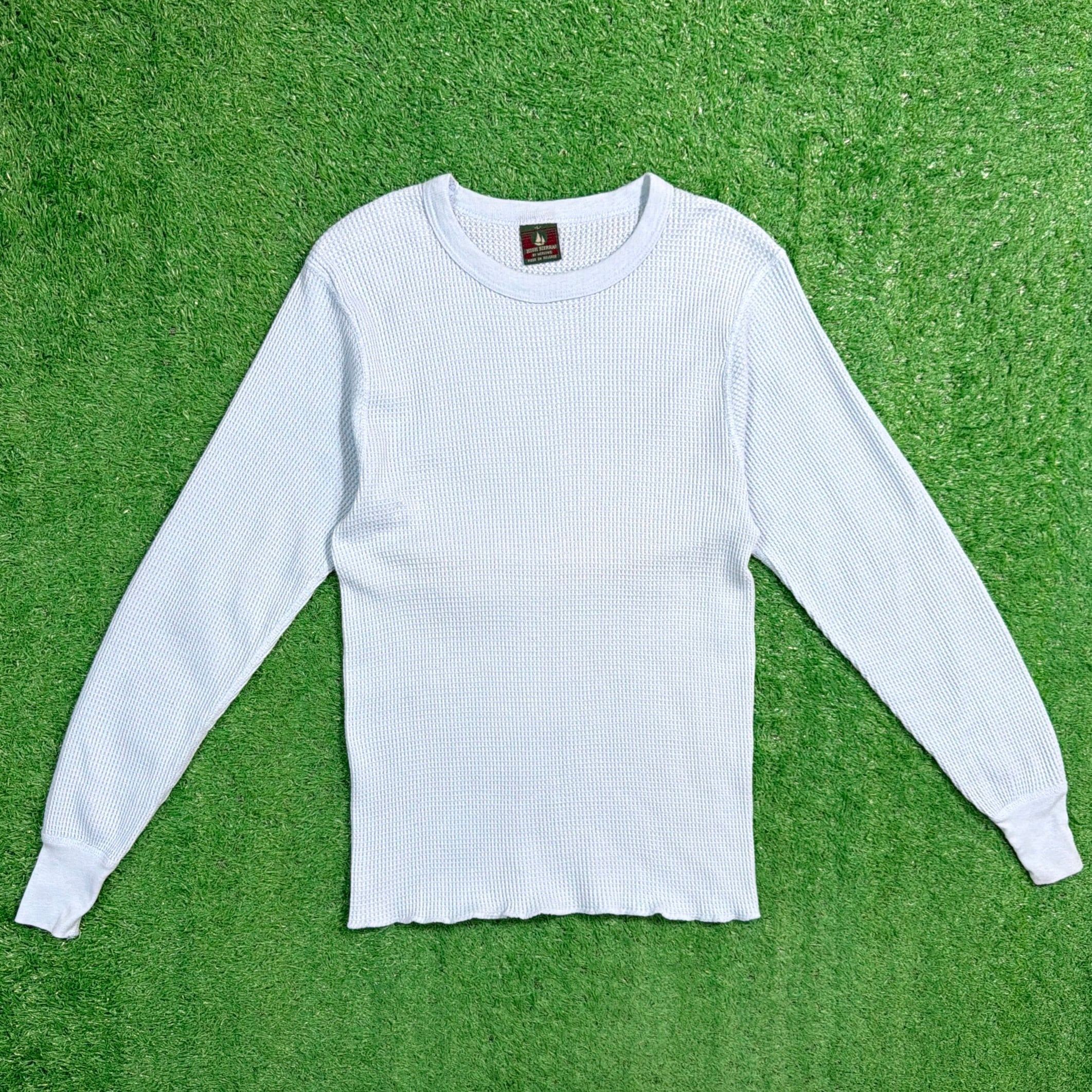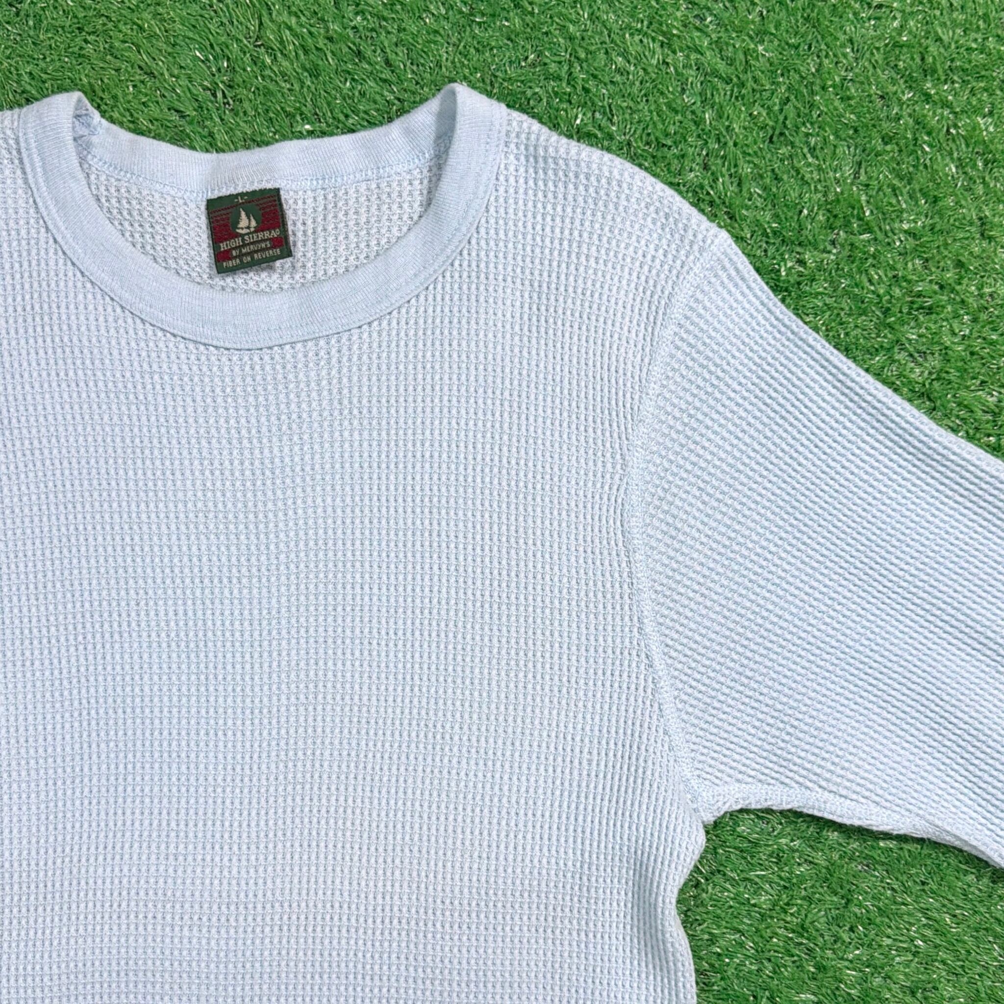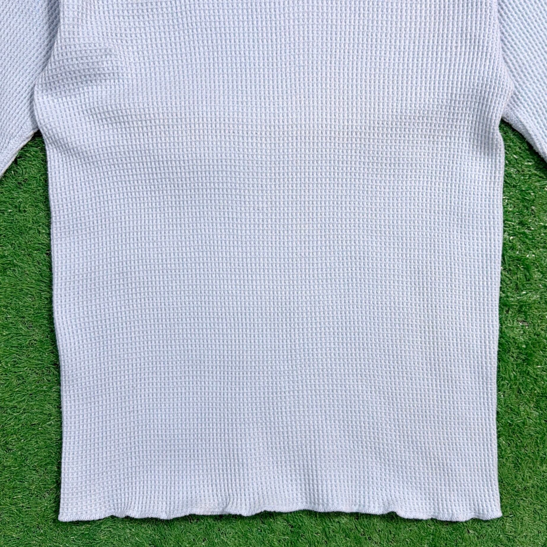 ワッフル編み特有の凹凸感があり、程よい伸縮性と柔らかな着心地が魅力。袖口のリブも長めで、古着らしいディテールがしっかり残っています。ライトブルーの優しいカラーが女性らしく、レイヤードスタイルにも使いやすい1枚です。薄手でインナーにもぴったりな生地感。