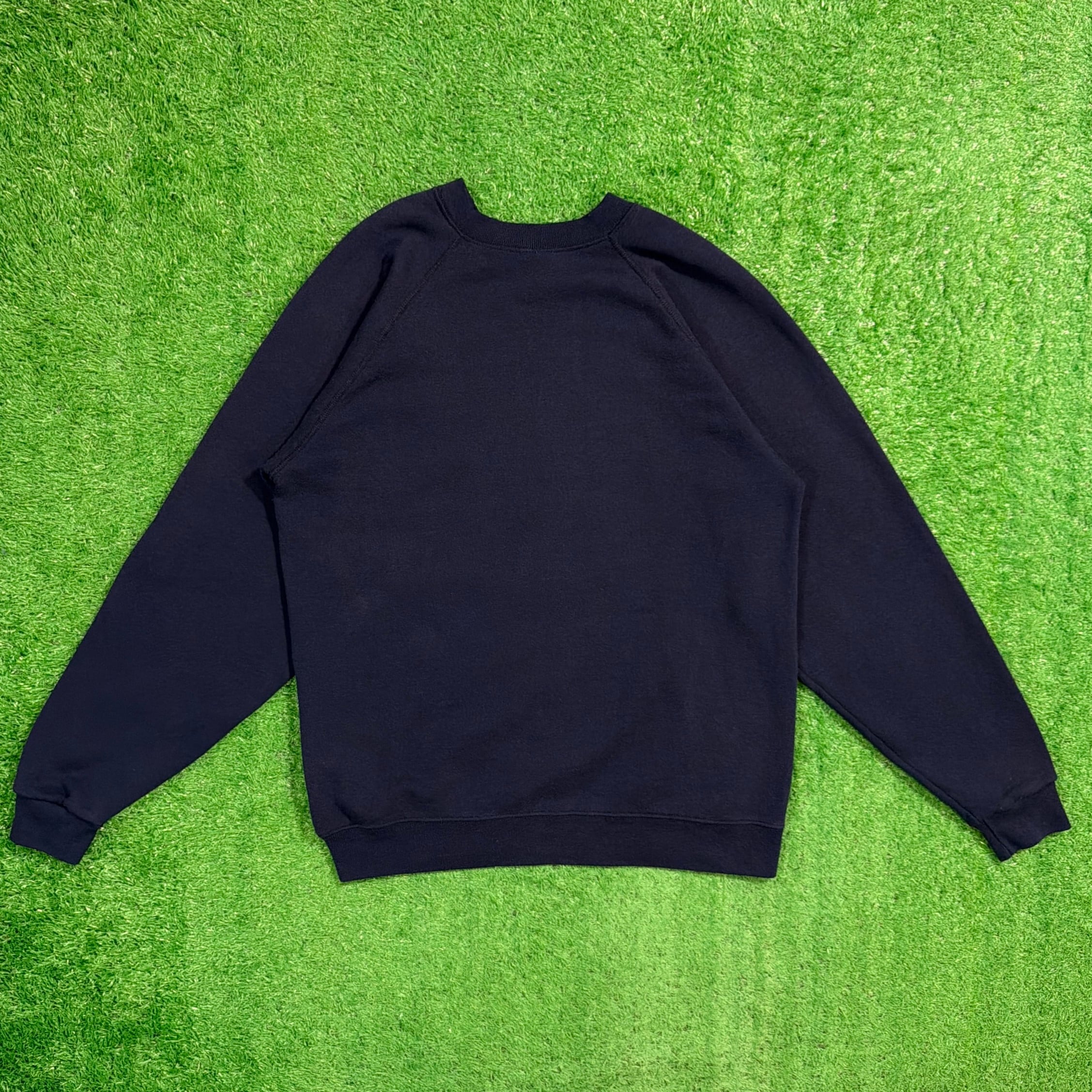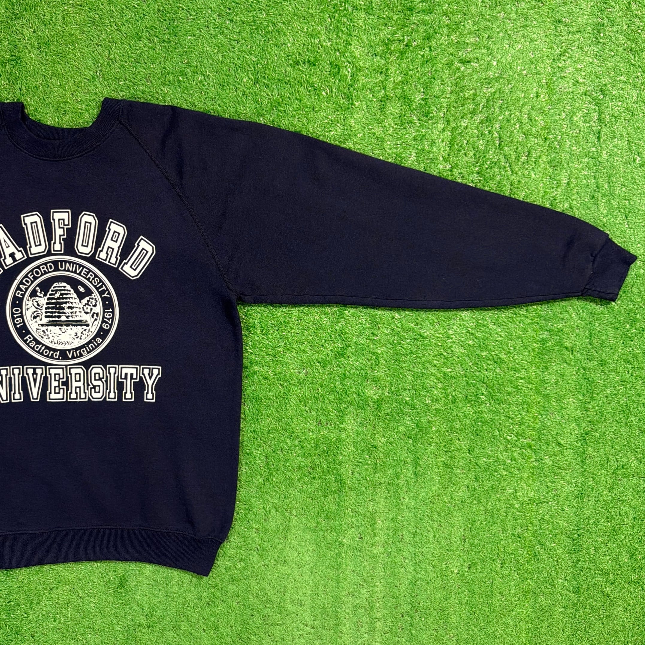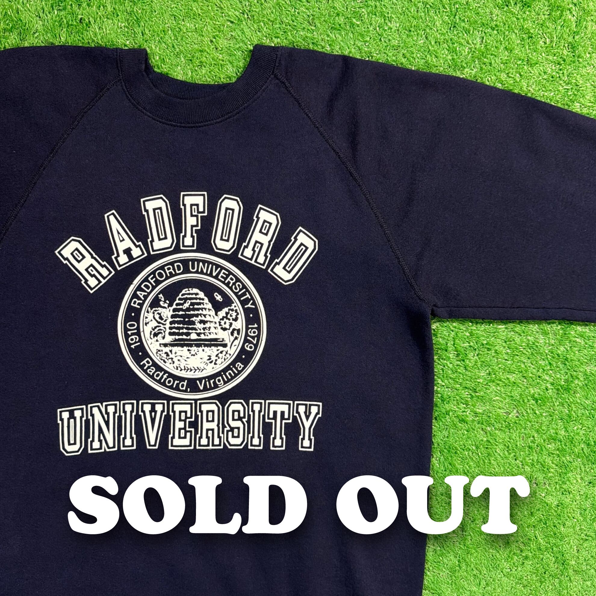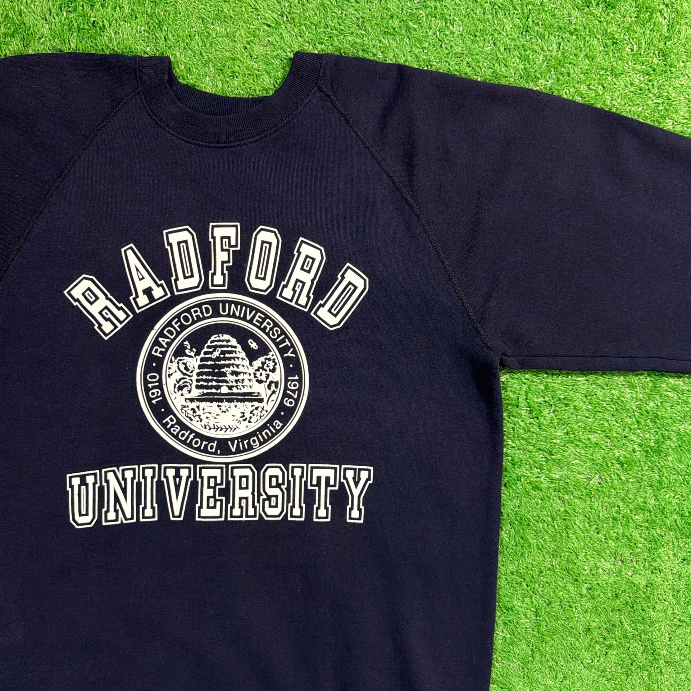 1990年代のアメリカ製、バージニア州のRADFORD UNIVERSITY(ラドフォード大学)のカレッジスウェットです。ネイビーボディにアイボリーのカレッジロゴが映える、王道のアメカジらしい一枚。ラグランスリーブ仕様で肩まわりが動かしやすく、ゆったりとした着心地が魅力です。