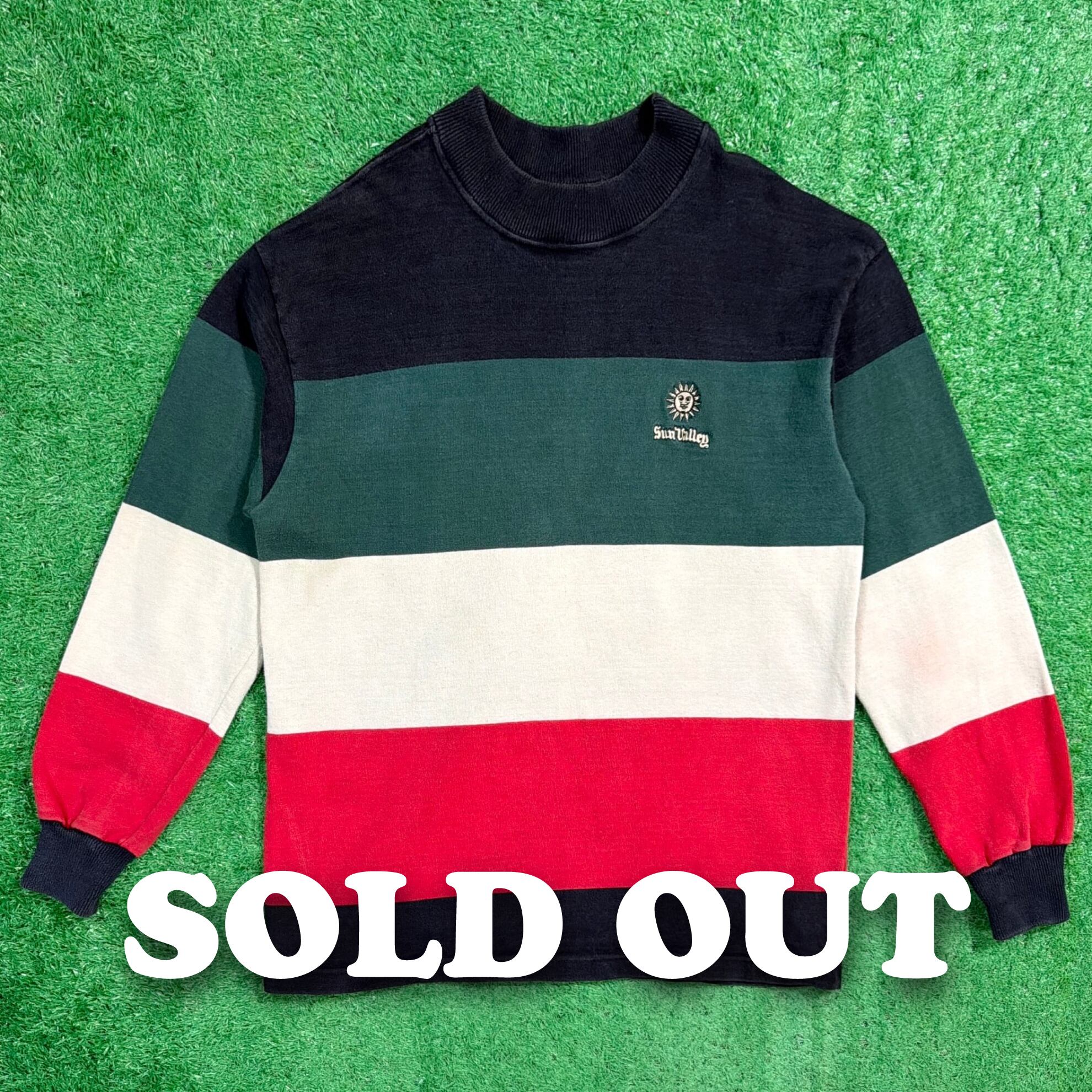 太めボーダー切り替えが存在感抜群。胸元には“Sun Valley”の太陽モチーフ刺繍が入り、90sらしい温かみのある雰囲気が魅力的です。