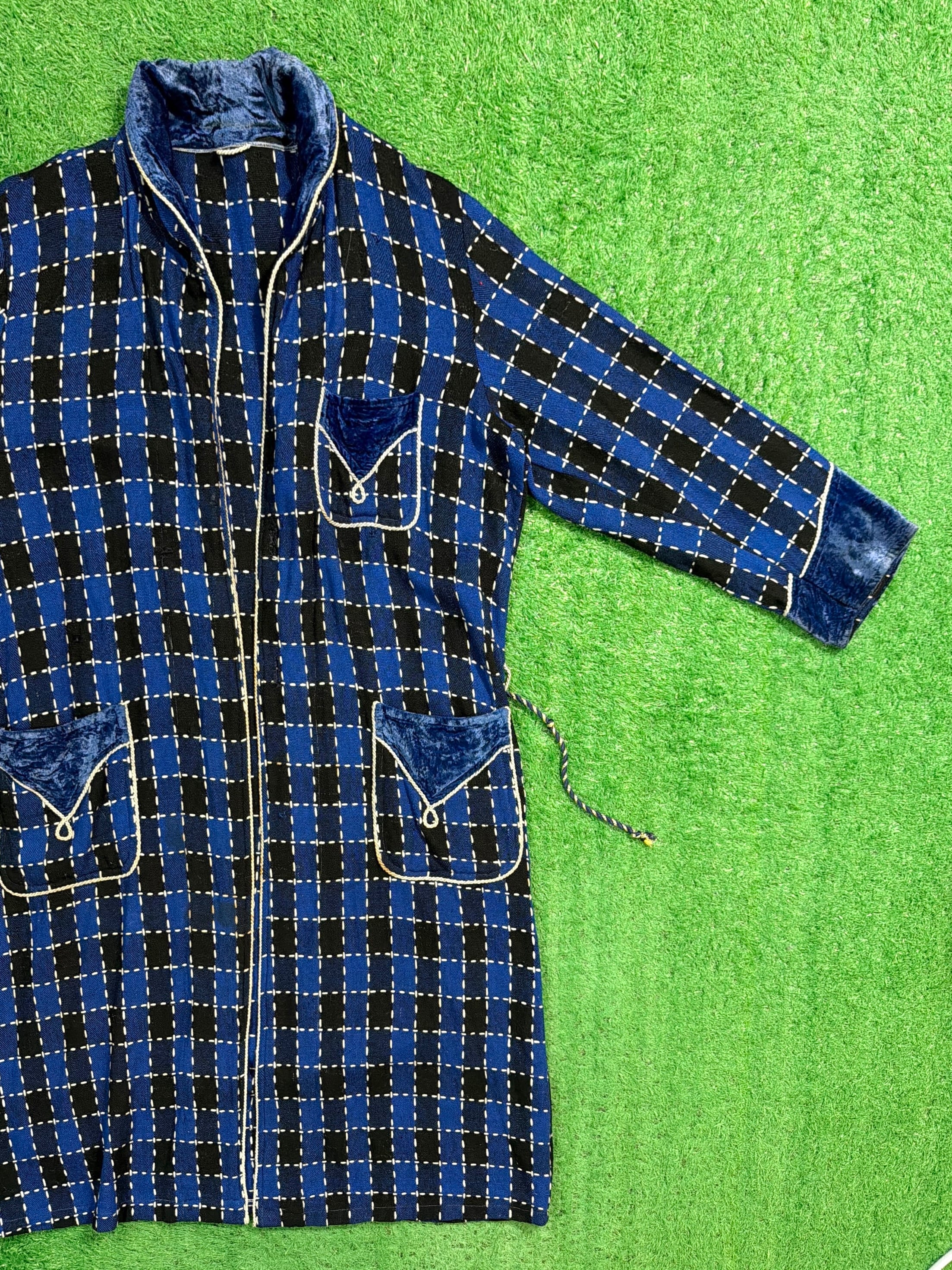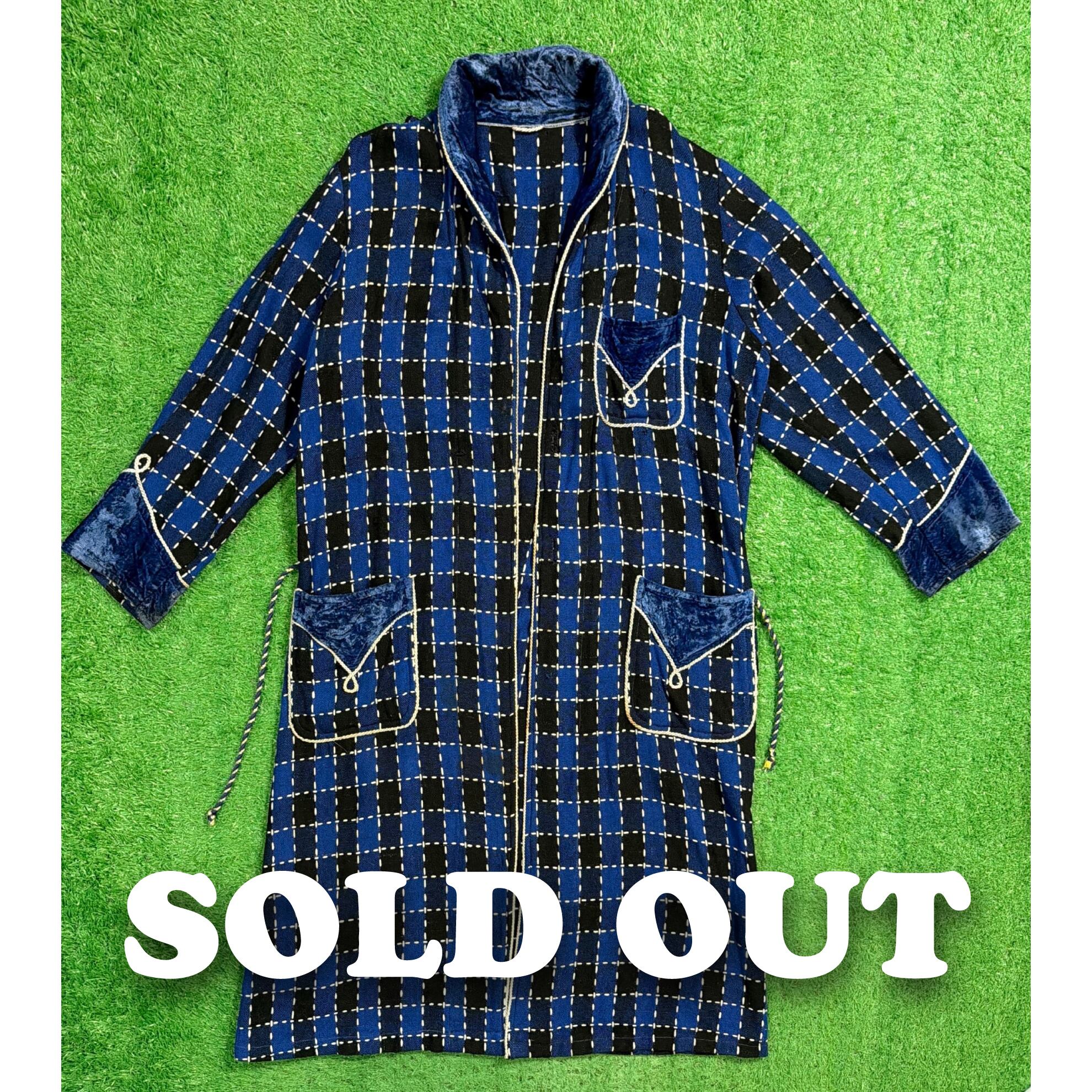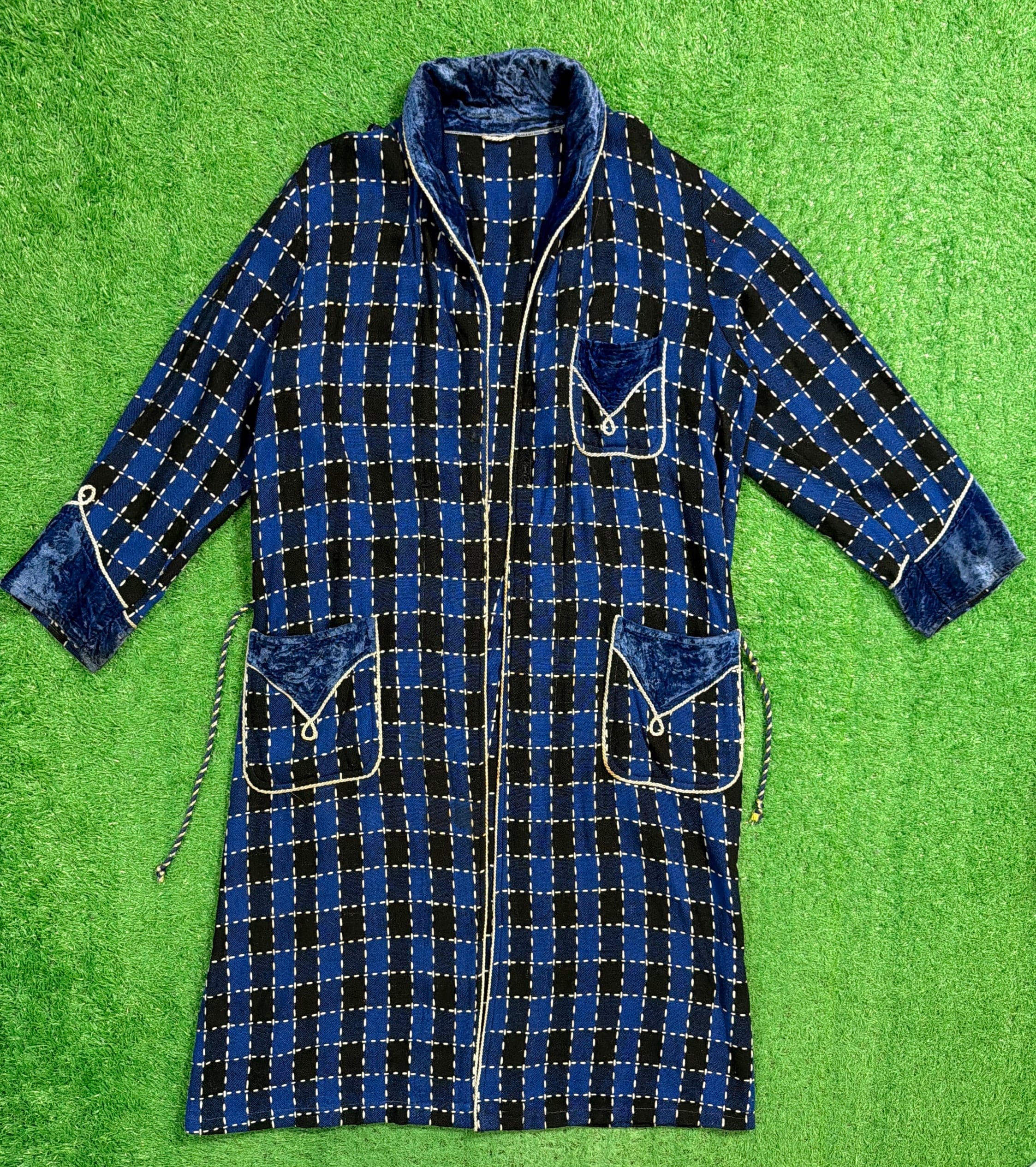 襟元と袖口、そしてポケット部分にはベロア調の素材が切り替えで使われており、落ち着いたブルー系のカラーながら存在感たっぷりの一着になっています。ガウンらしいリラックス感と、デザイン性のあるルックスが魅力です。