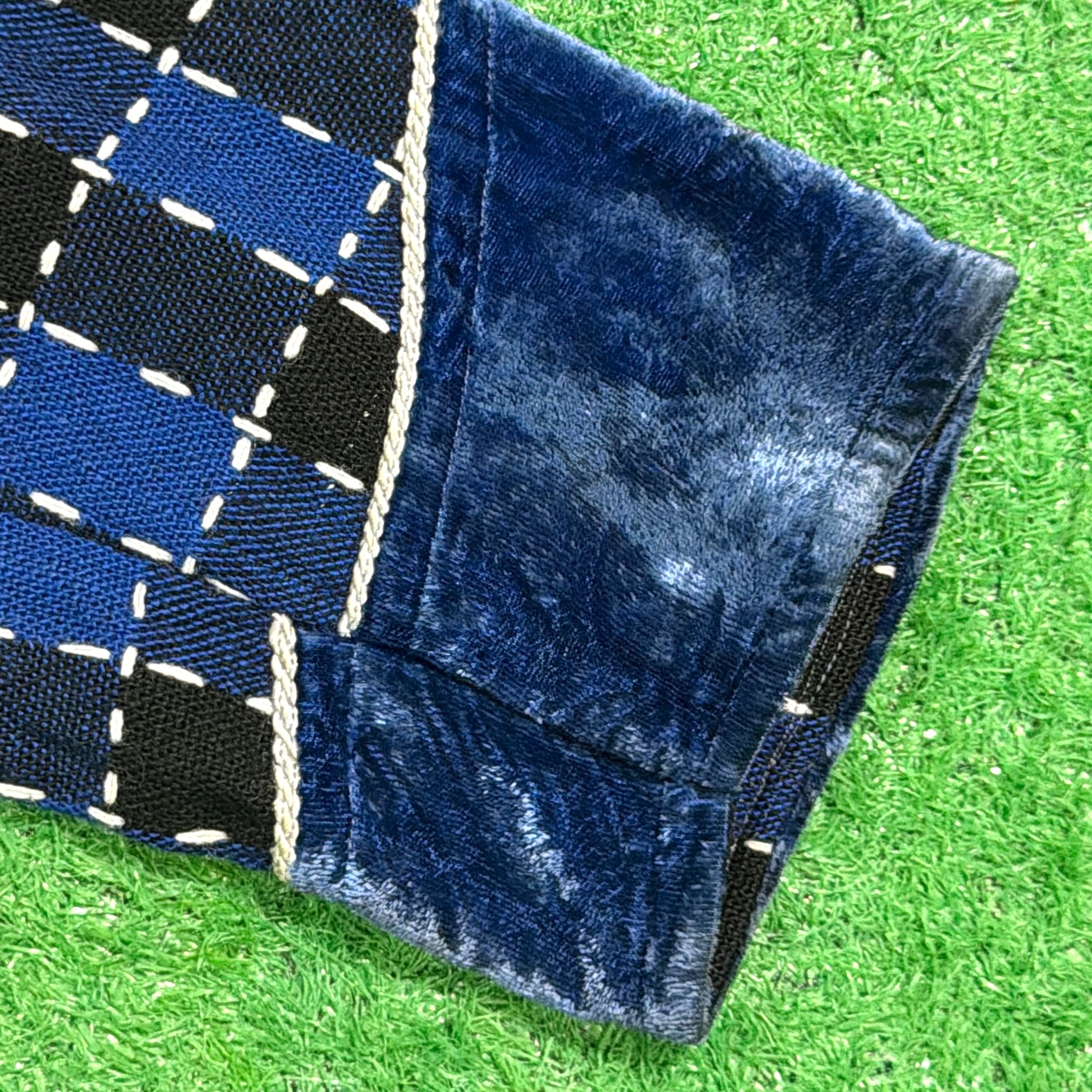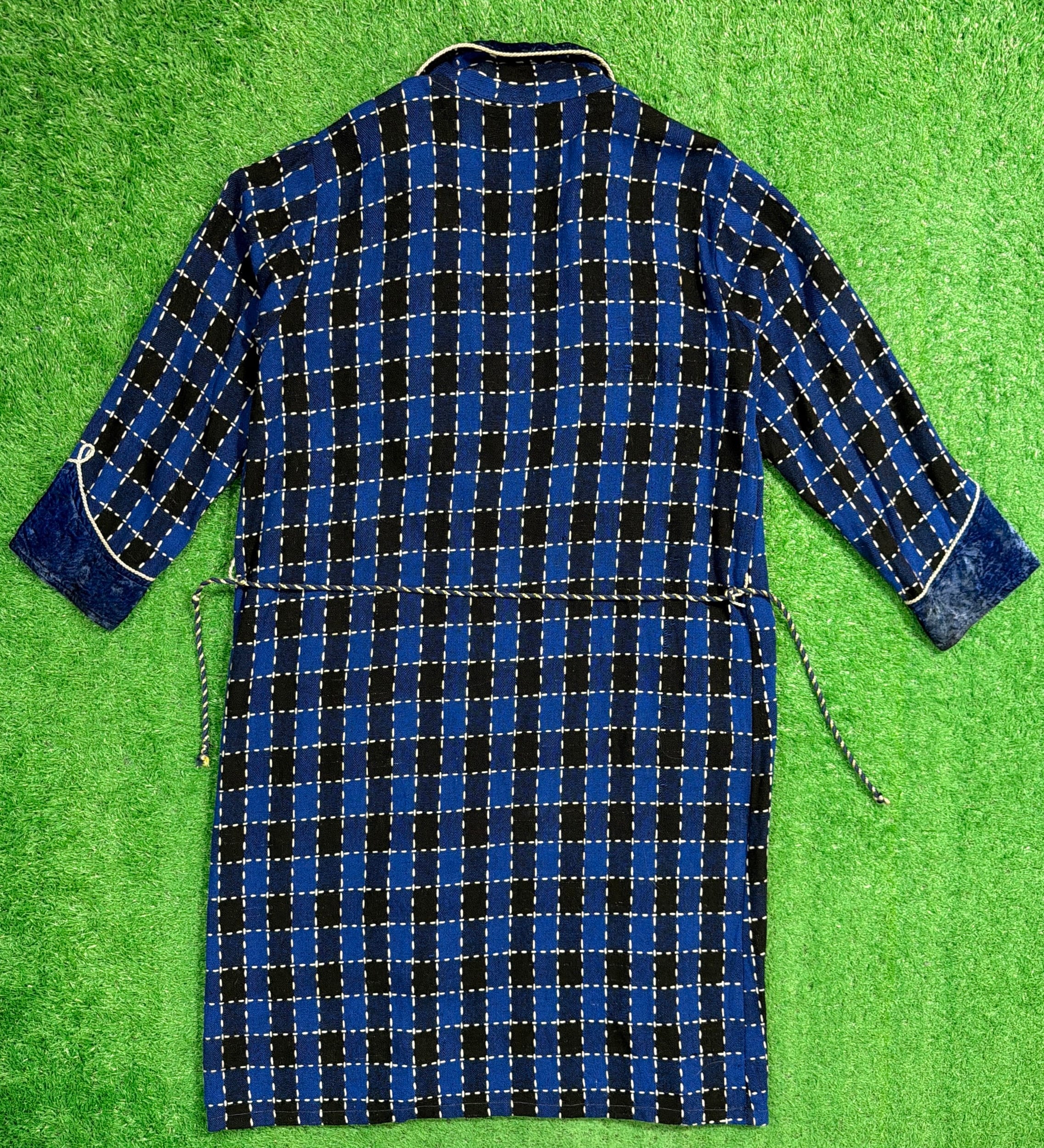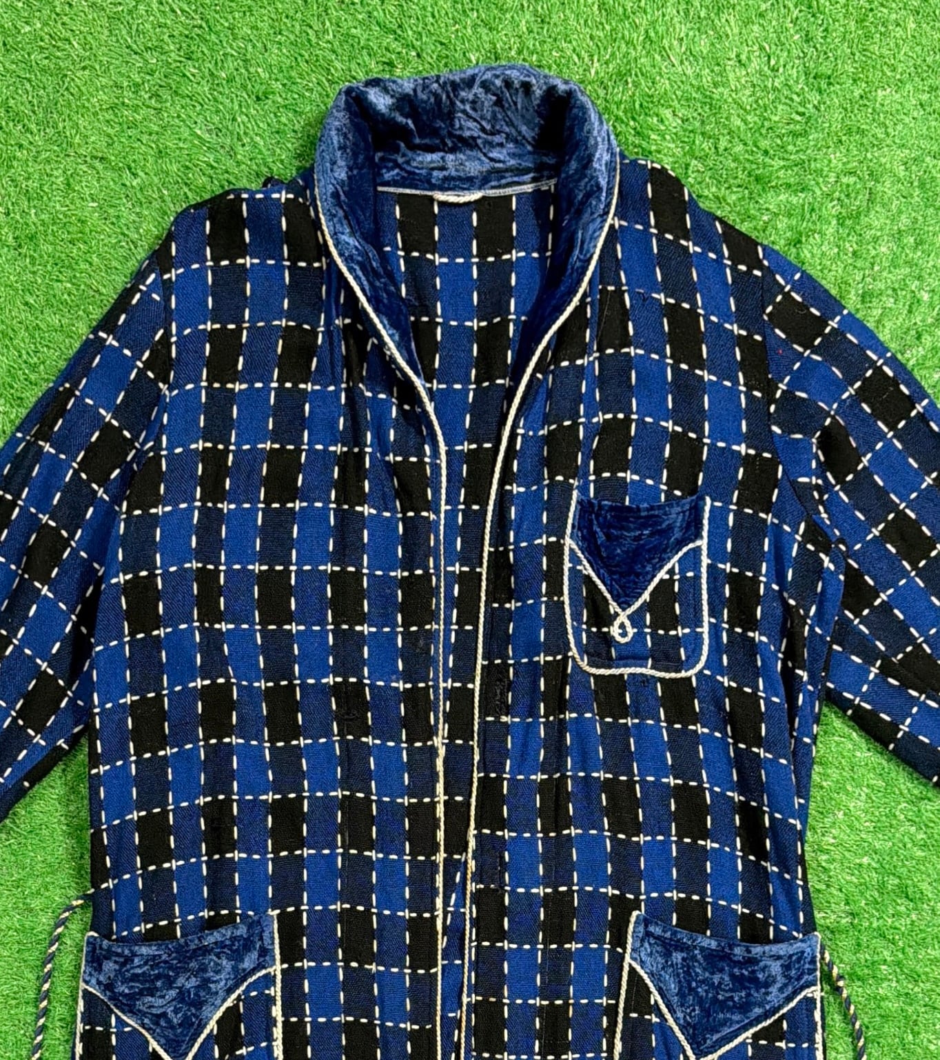 襟元と袖口、そしてポケット部分にはベロア調の素材が切り替えで使われており、落ち着いたブルー系のカラーながら存在感たっぷりの一着になっています。ガウンらしいリラックス感と、デザイン性のあるルックスが魅力です。
