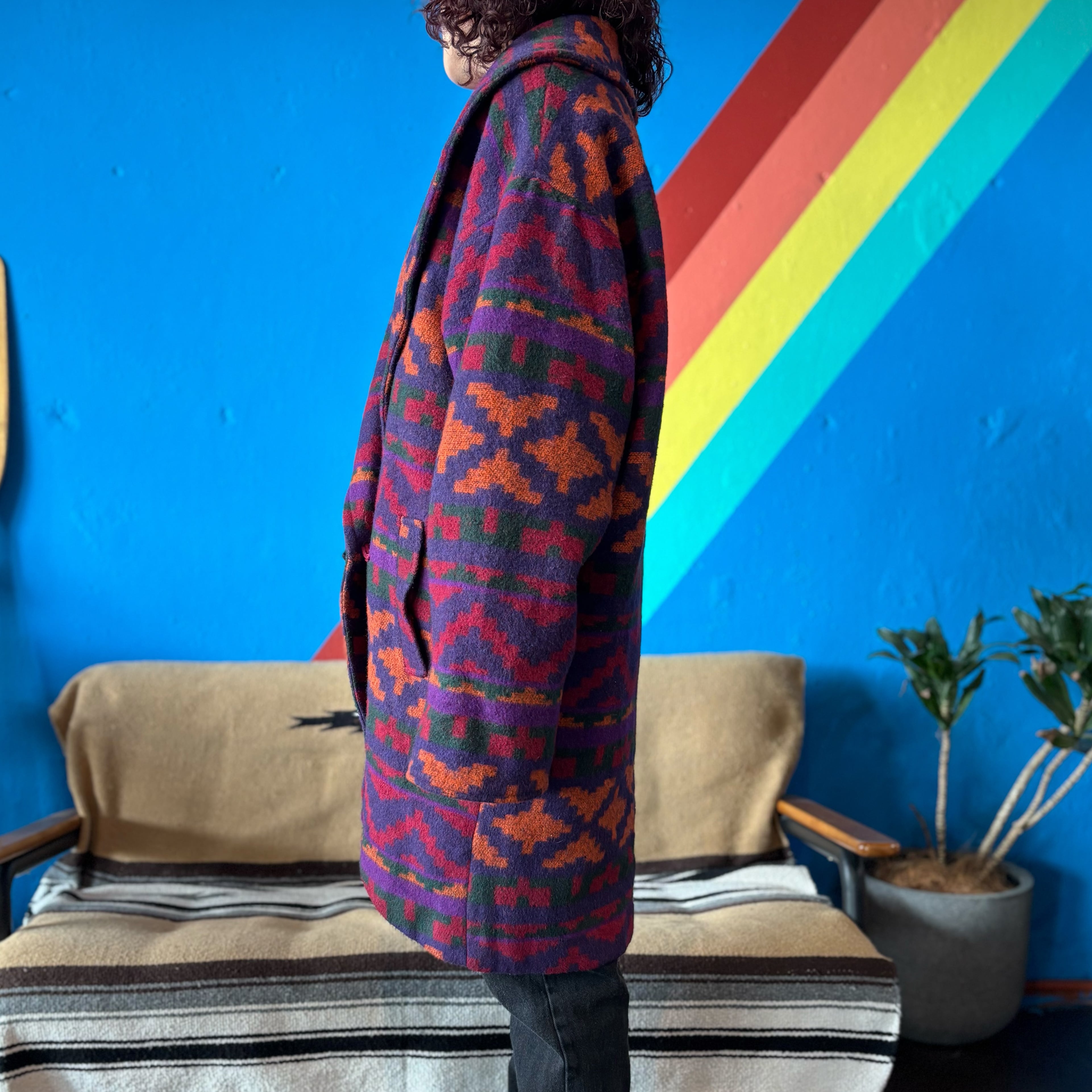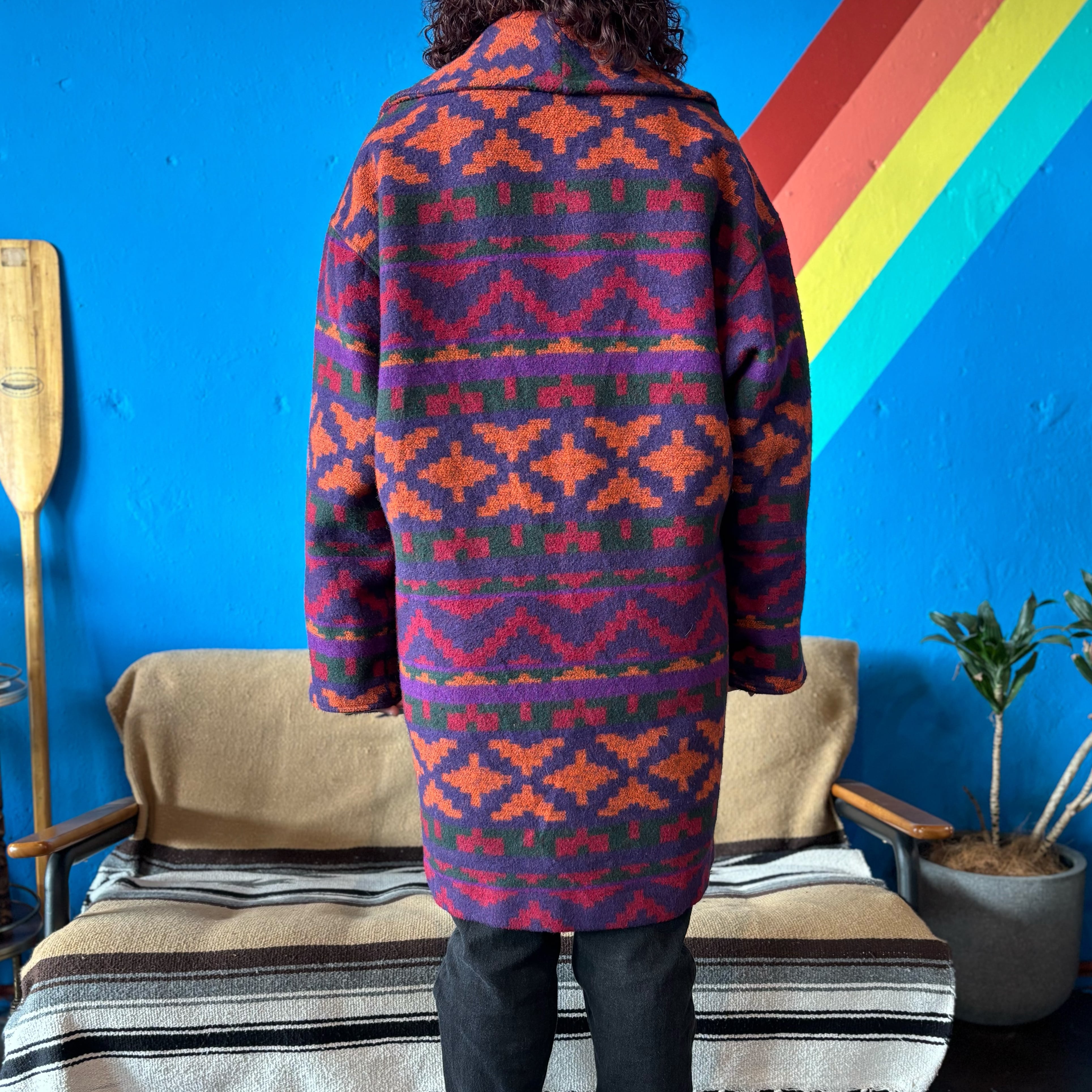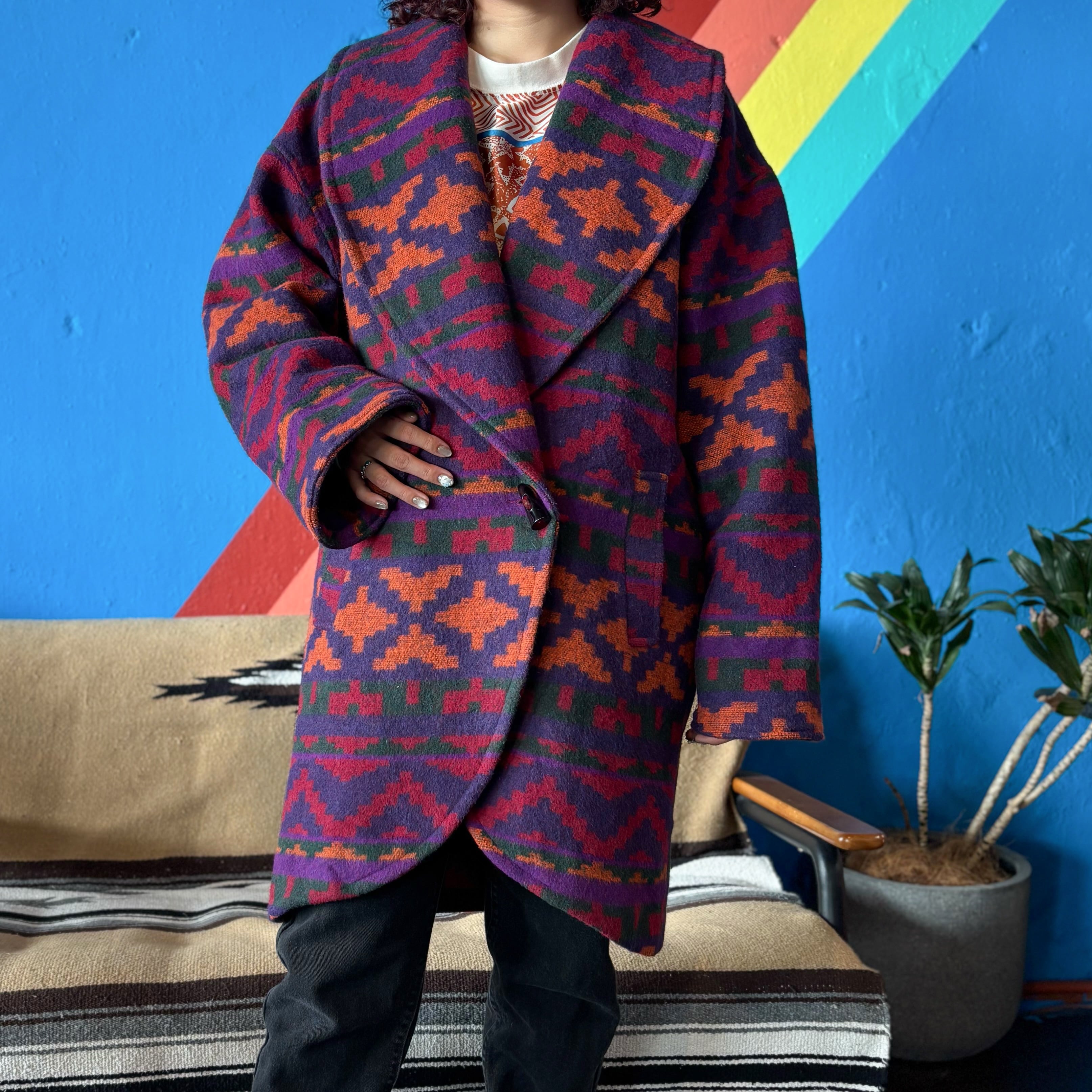1990年代のアメリカ製、ネイティブ柄のショールカラーコートです。