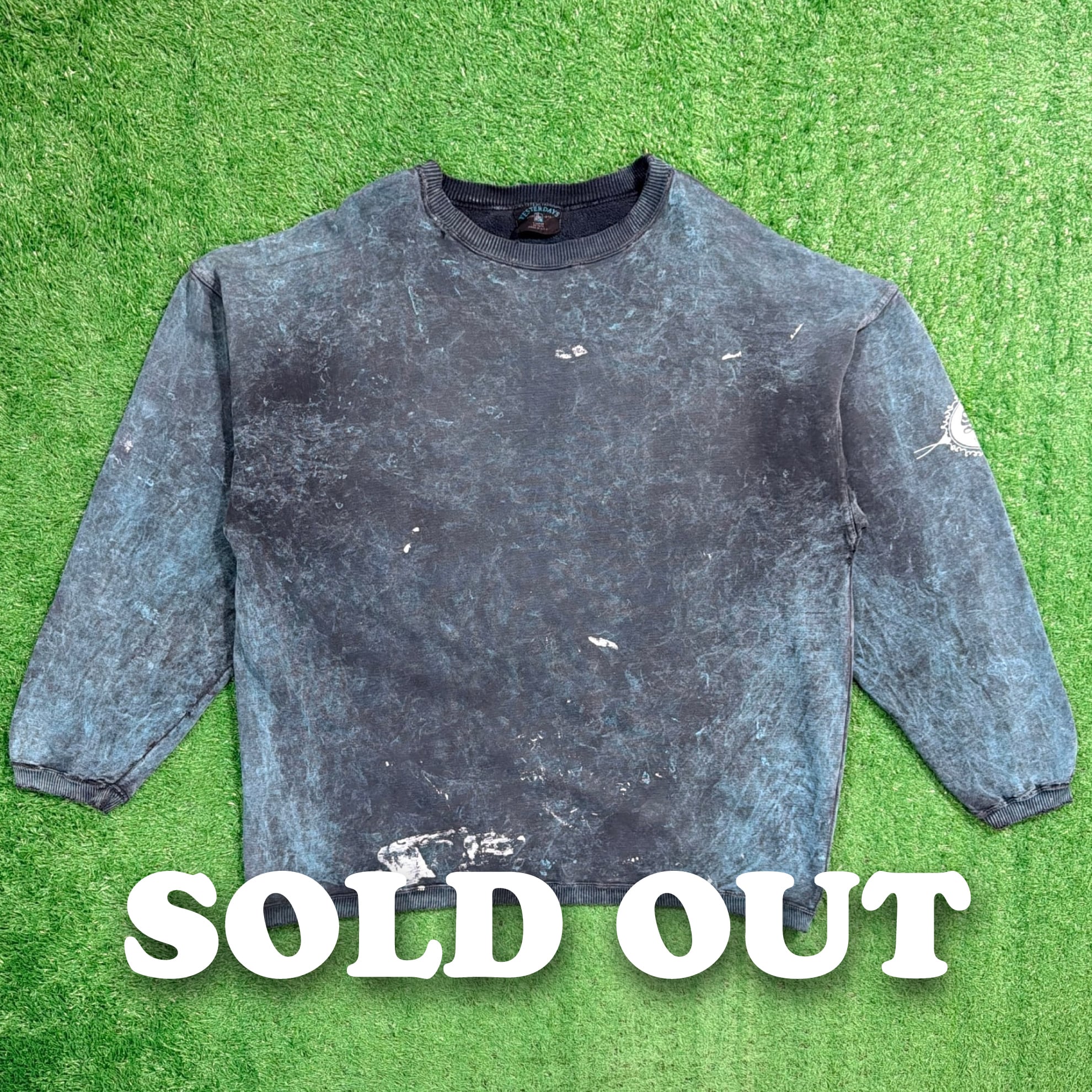 1990年代のアメリカ製、SRS(So. Redondo Surf Company)のムラ染めスウェットシャツです。全体に広がる独特なムラ染め(タイダイ風の後染め加工)が雰囲気抜群で、袖や裾に入ったダメージも古着らしい味として楽しめる一枚。