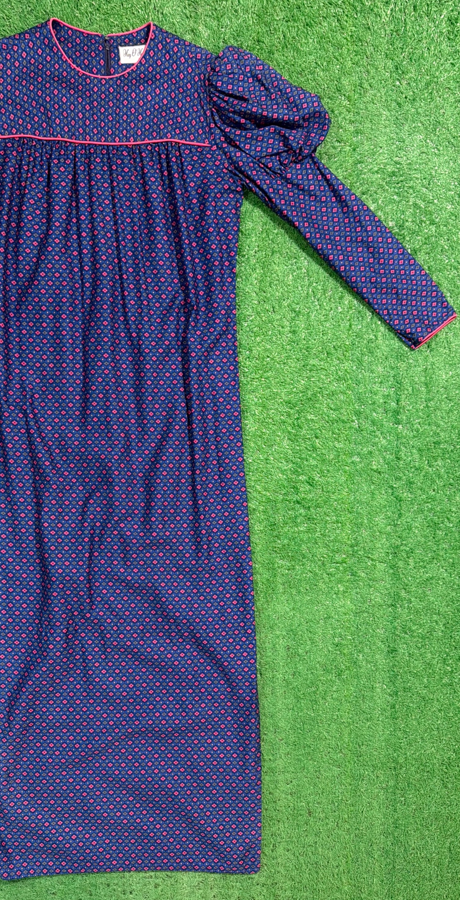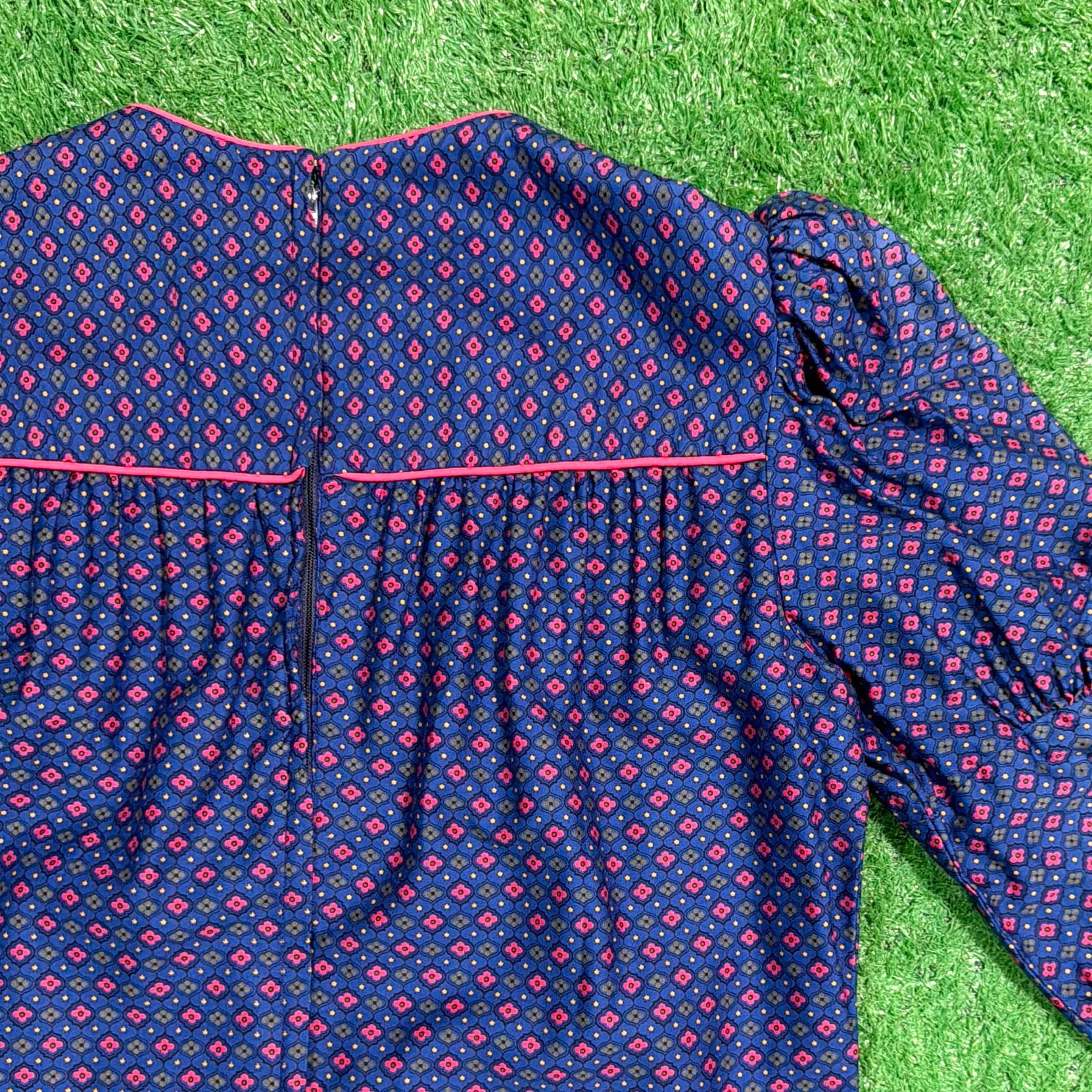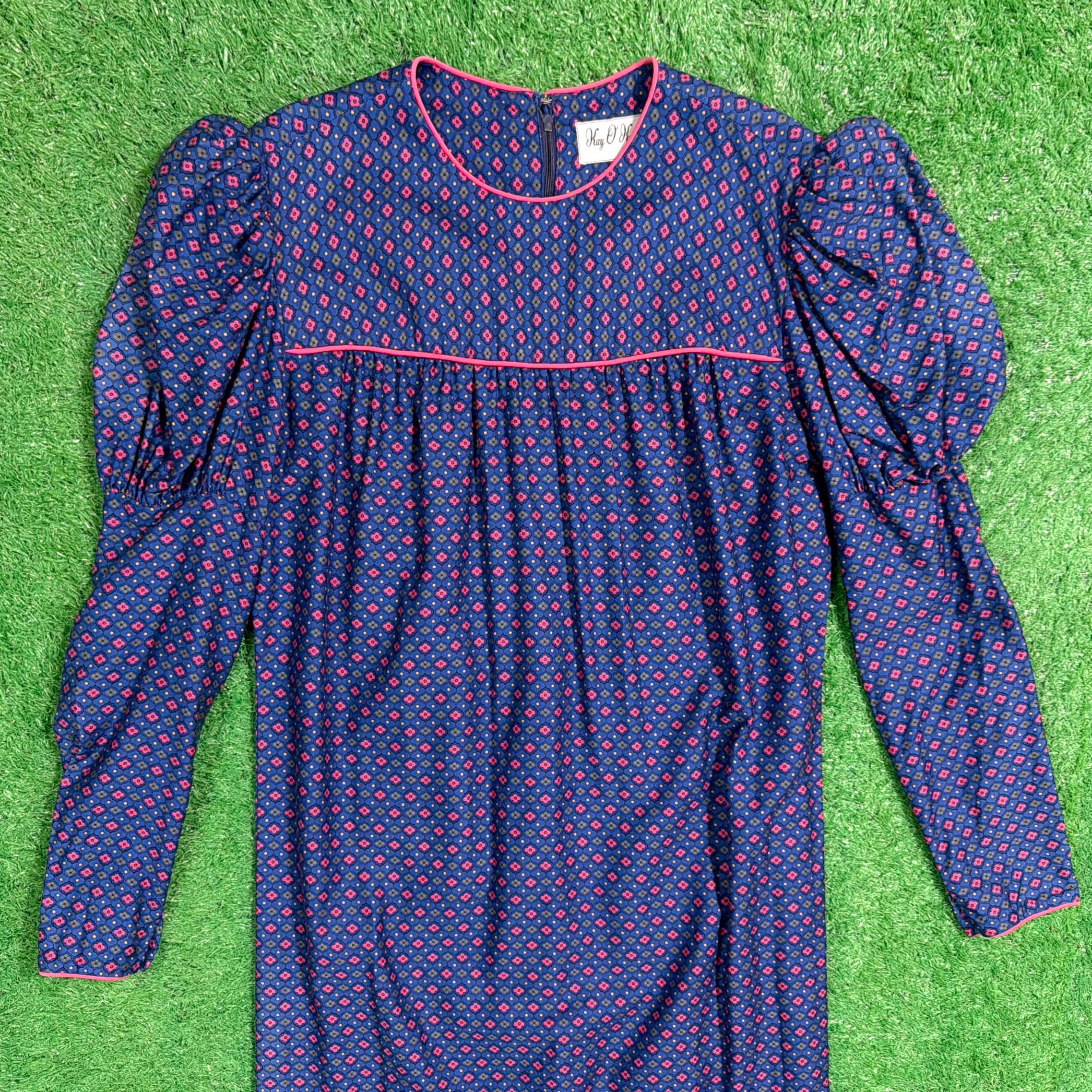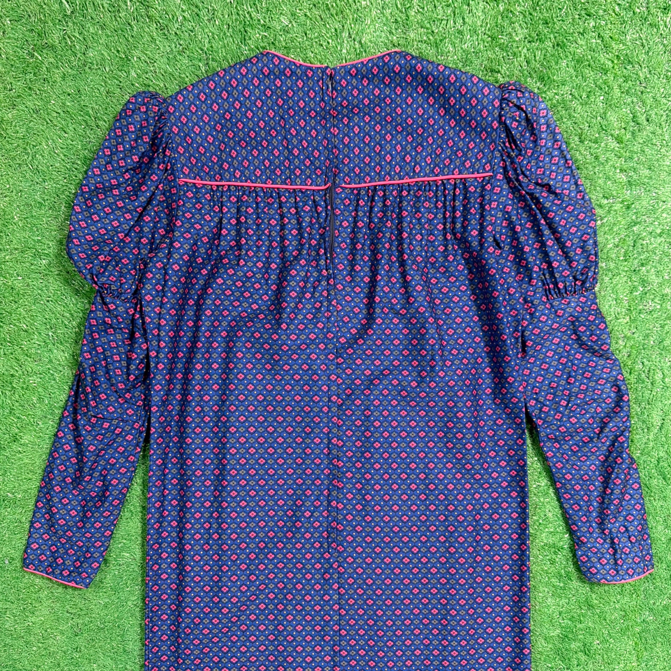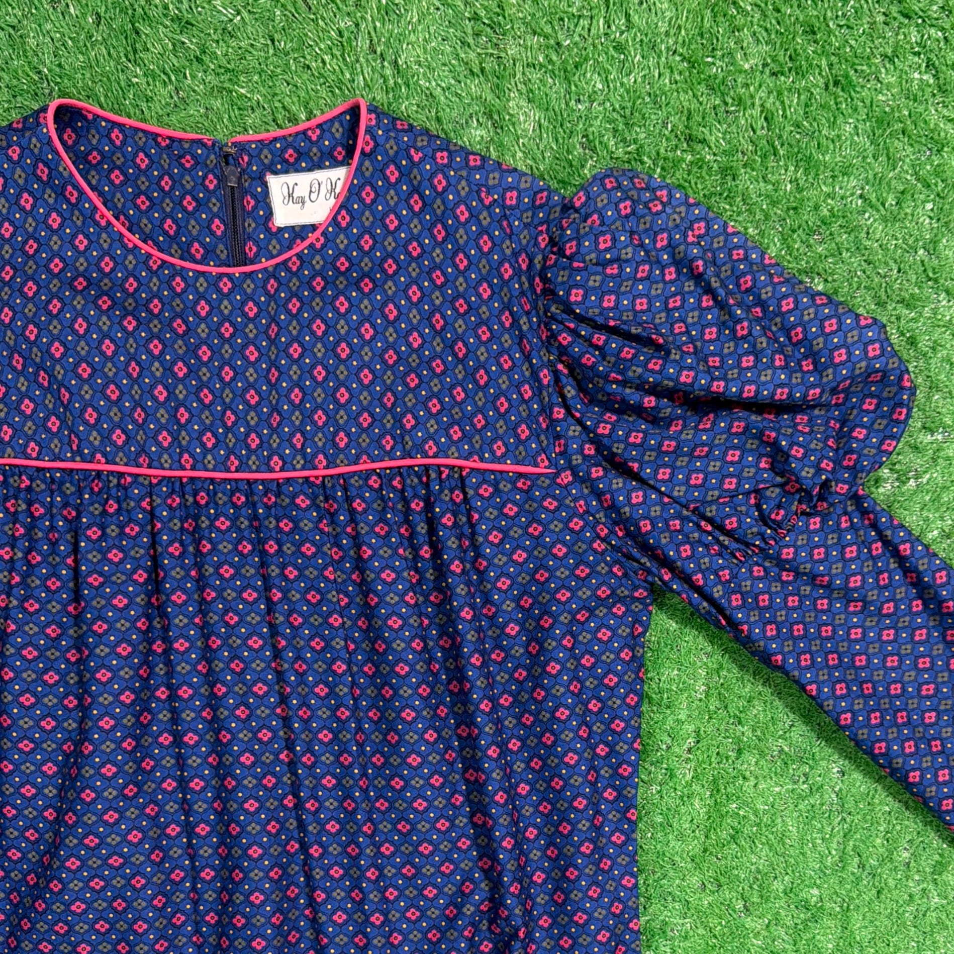 ネイビーを基調に、小花風パターンが散りばめられた可愛らしいデザイン。肩にはボリュームのあるパフスリーブが入り、ほんのりクラシックなシルエットが印象的です。