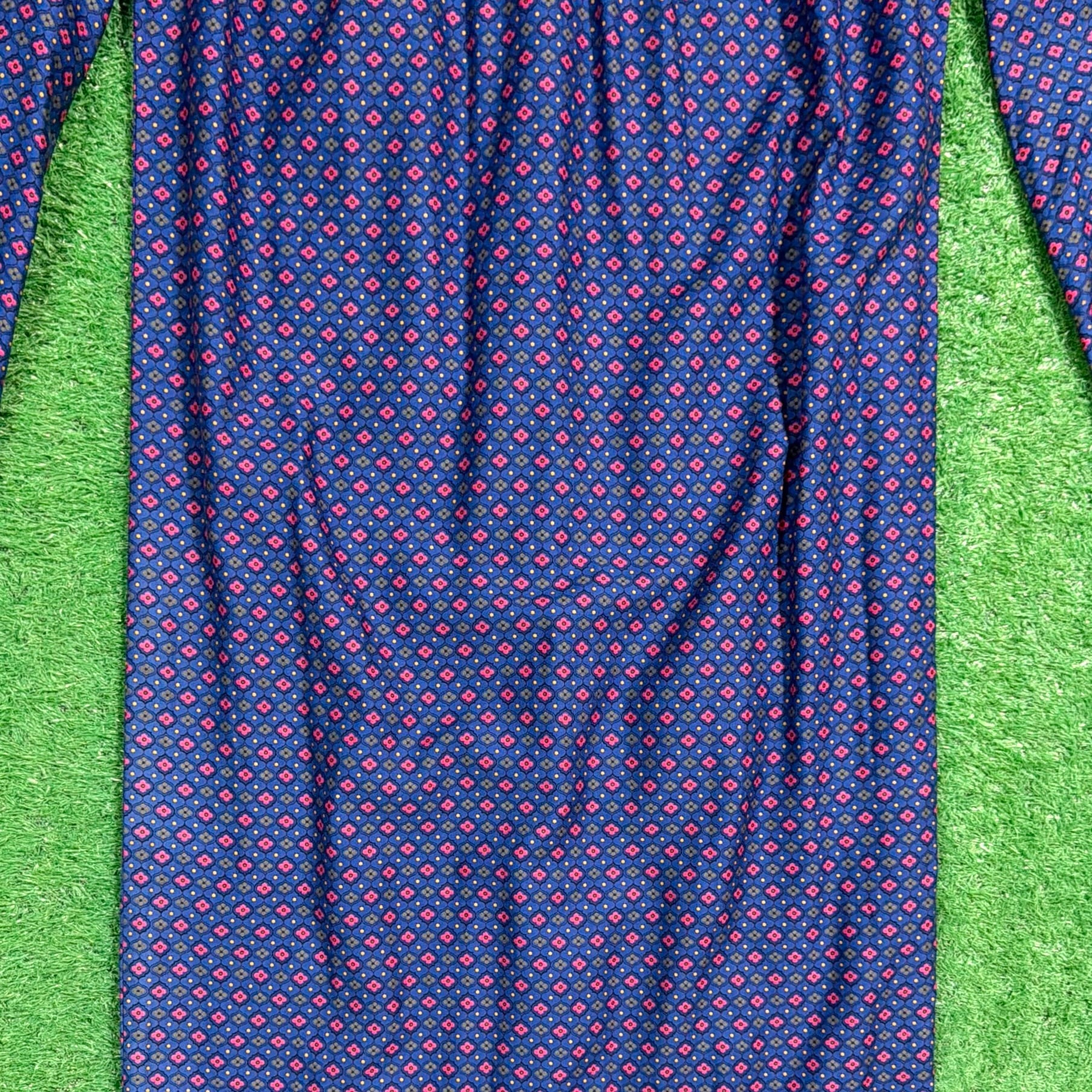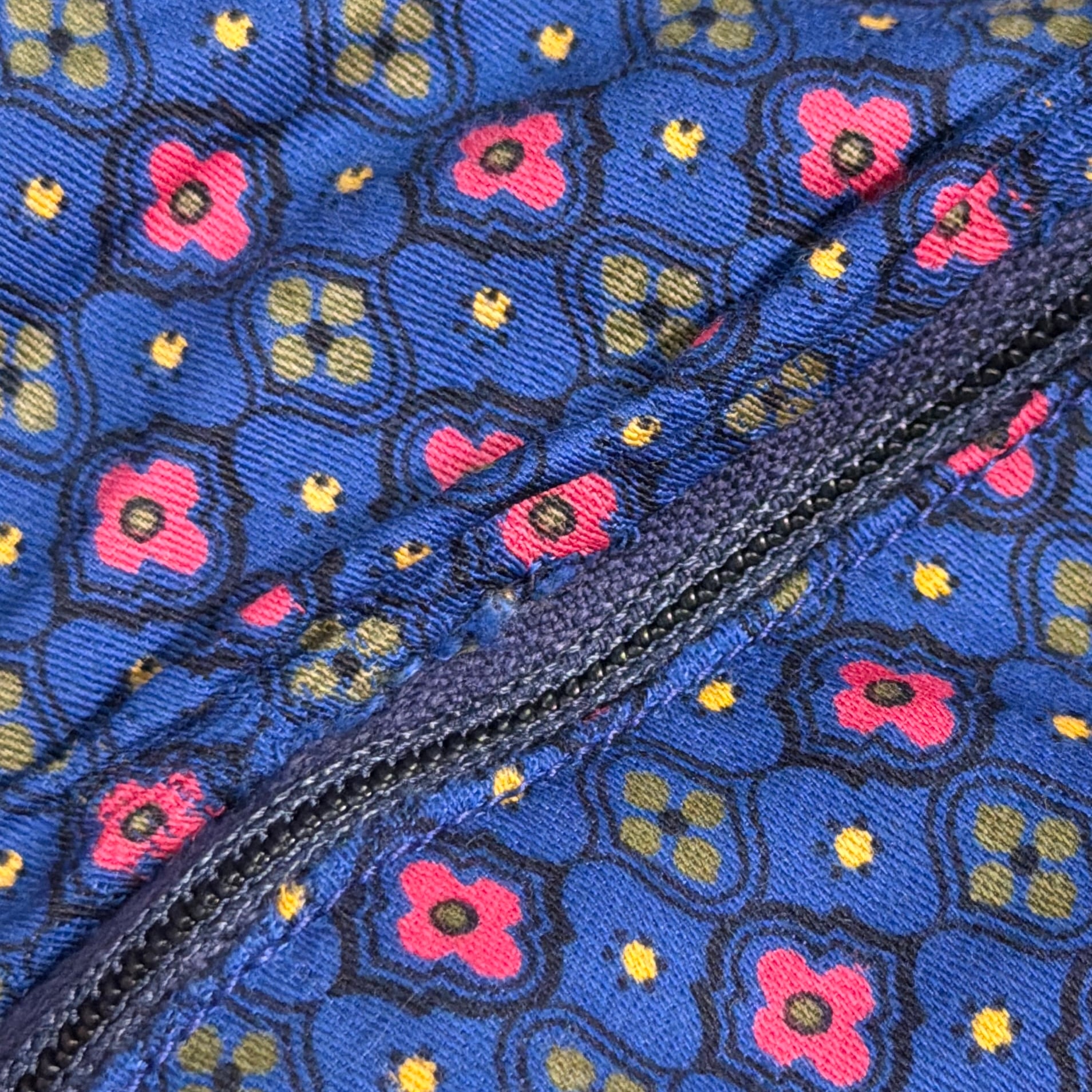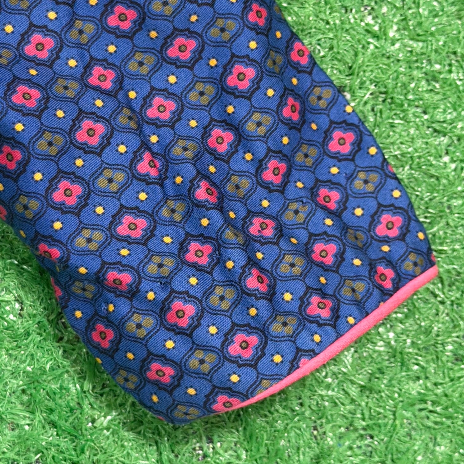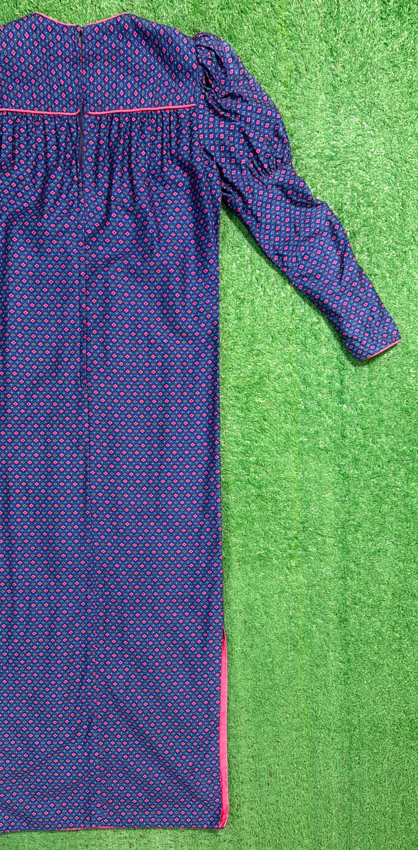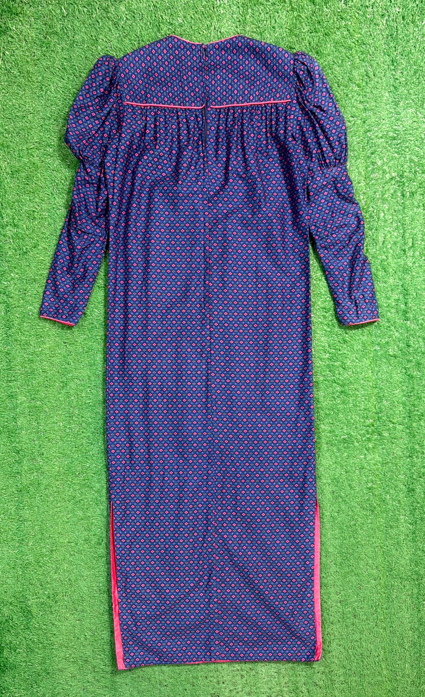 ネイビーを基調に、小花風パターンが散りばめられた可愛らしいデザイン。肩にはボリュームのあるパフスリーブが入り、ほんのりクラシックなシルエットが印象的です。