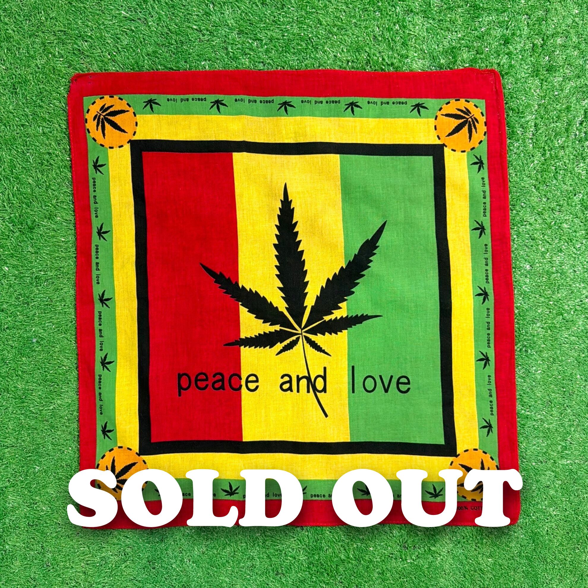 レゲエカルチャーを象徴するラスタカラー(レッド・イエロー・グリーン)が目を引くバンダナです。中央には麻の葉モチーフが大きく描かれ、「peace and love」の文字がデザインされた1枚。四隅にも同じモチーフが入っており、レゲエやストリート好きにはたまらない雰囲気のアイテムです。