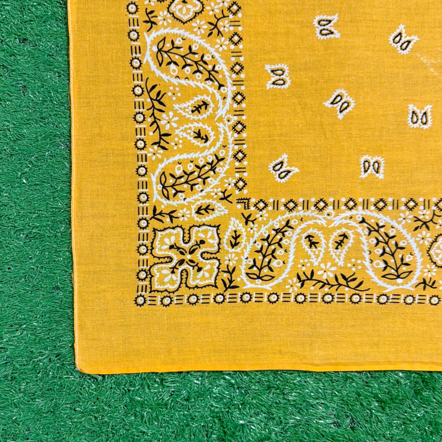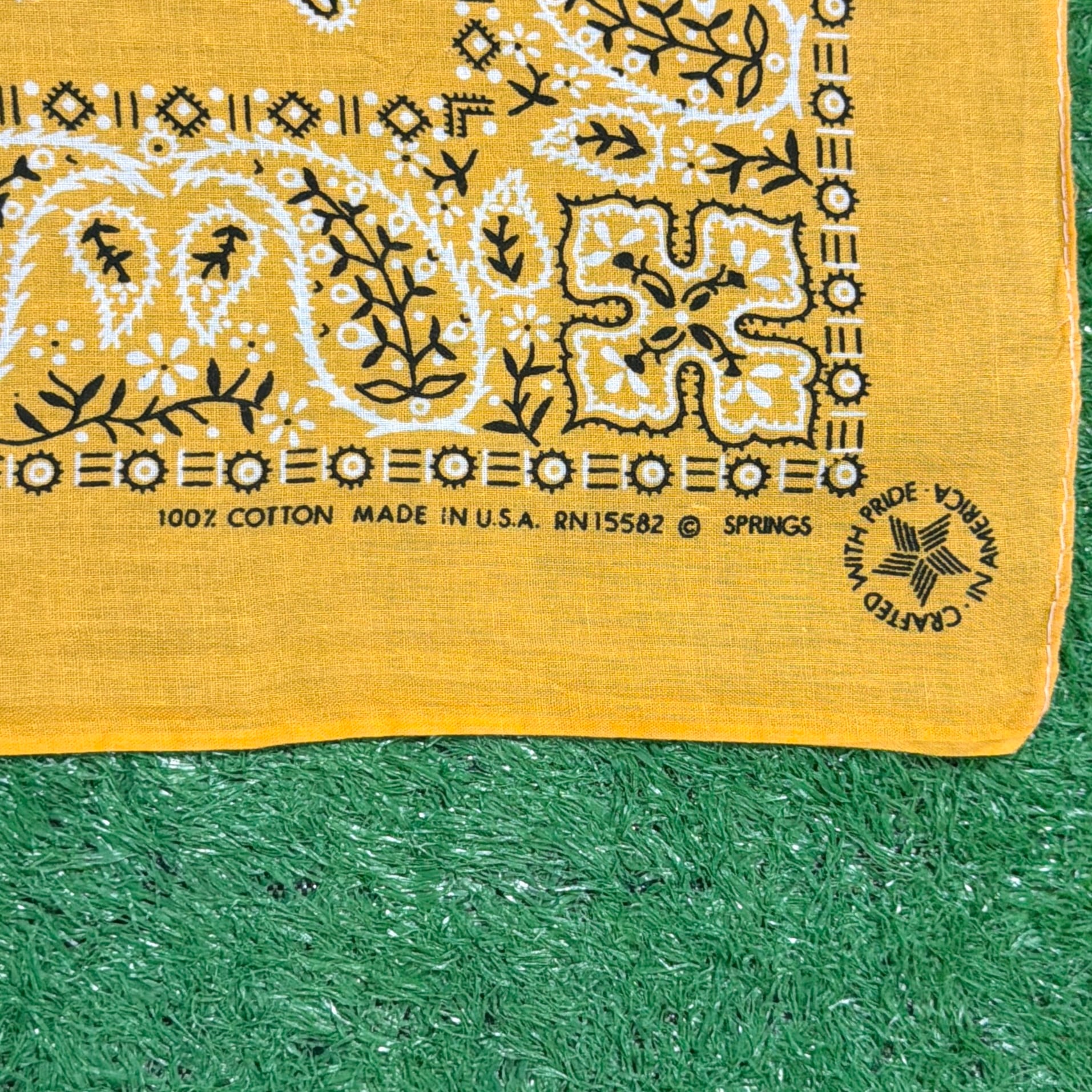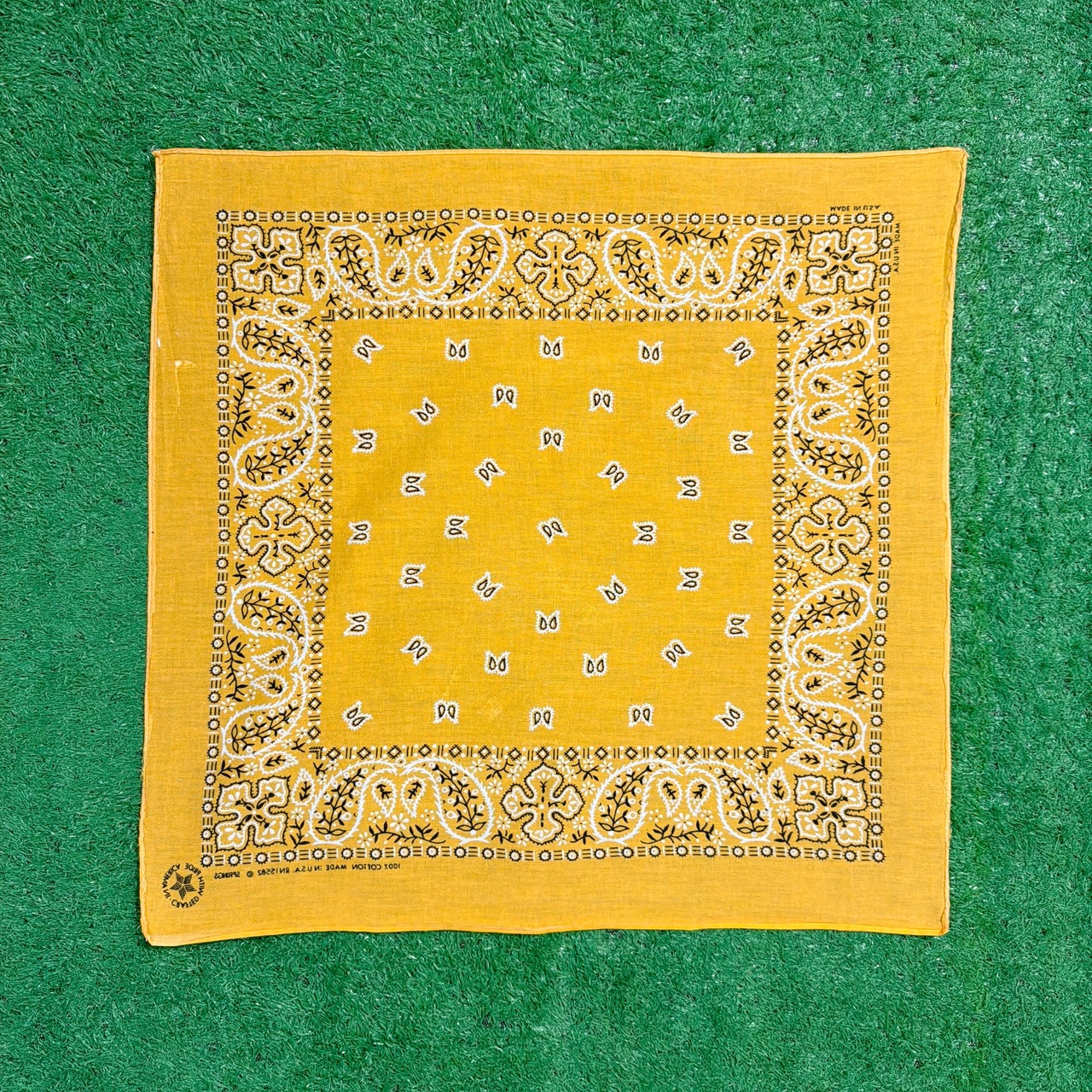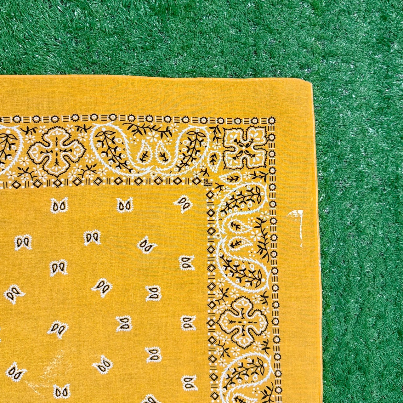1980年代のアメリカ製、鮮やかなイエローカラーが目を引くペイズリー柄バンダナです。