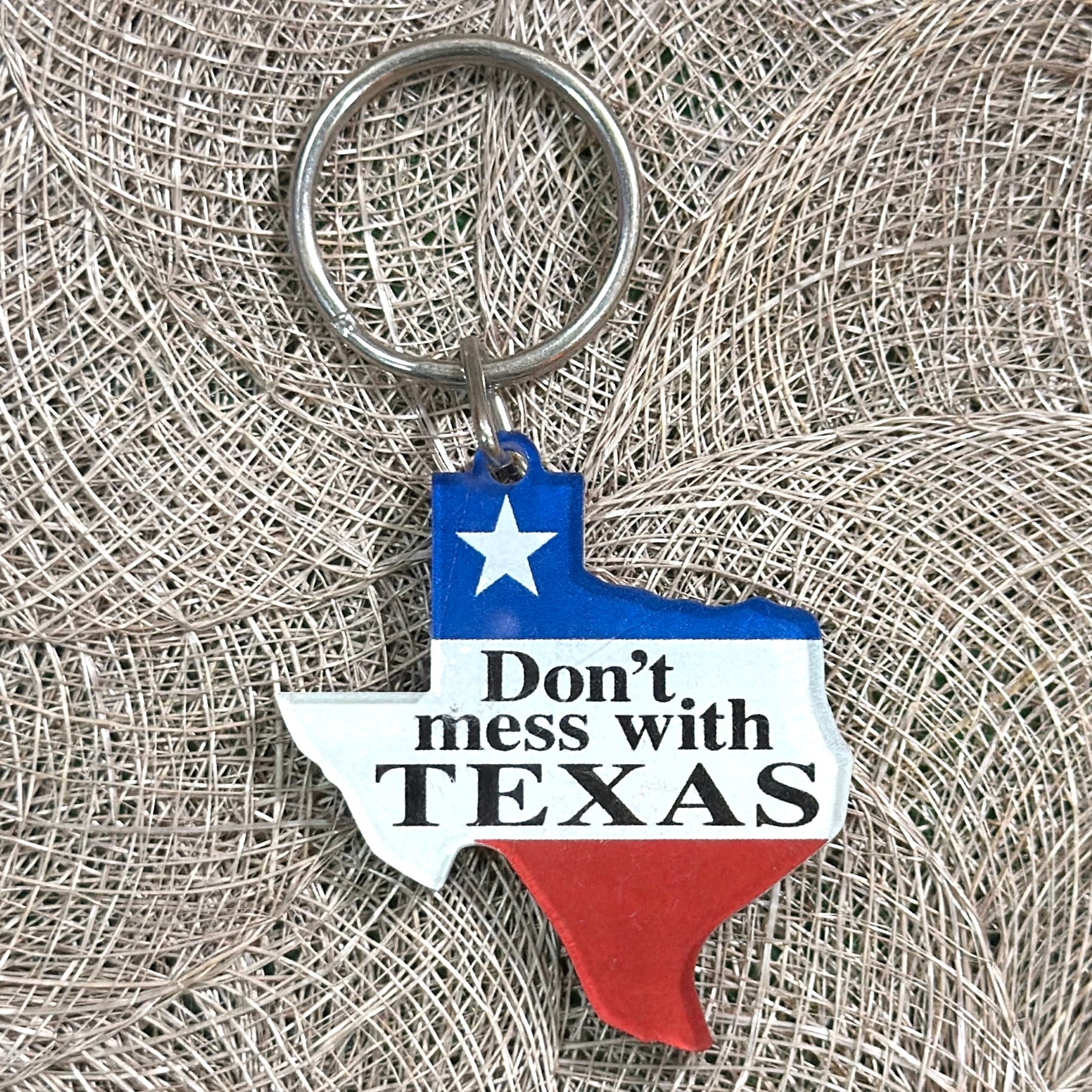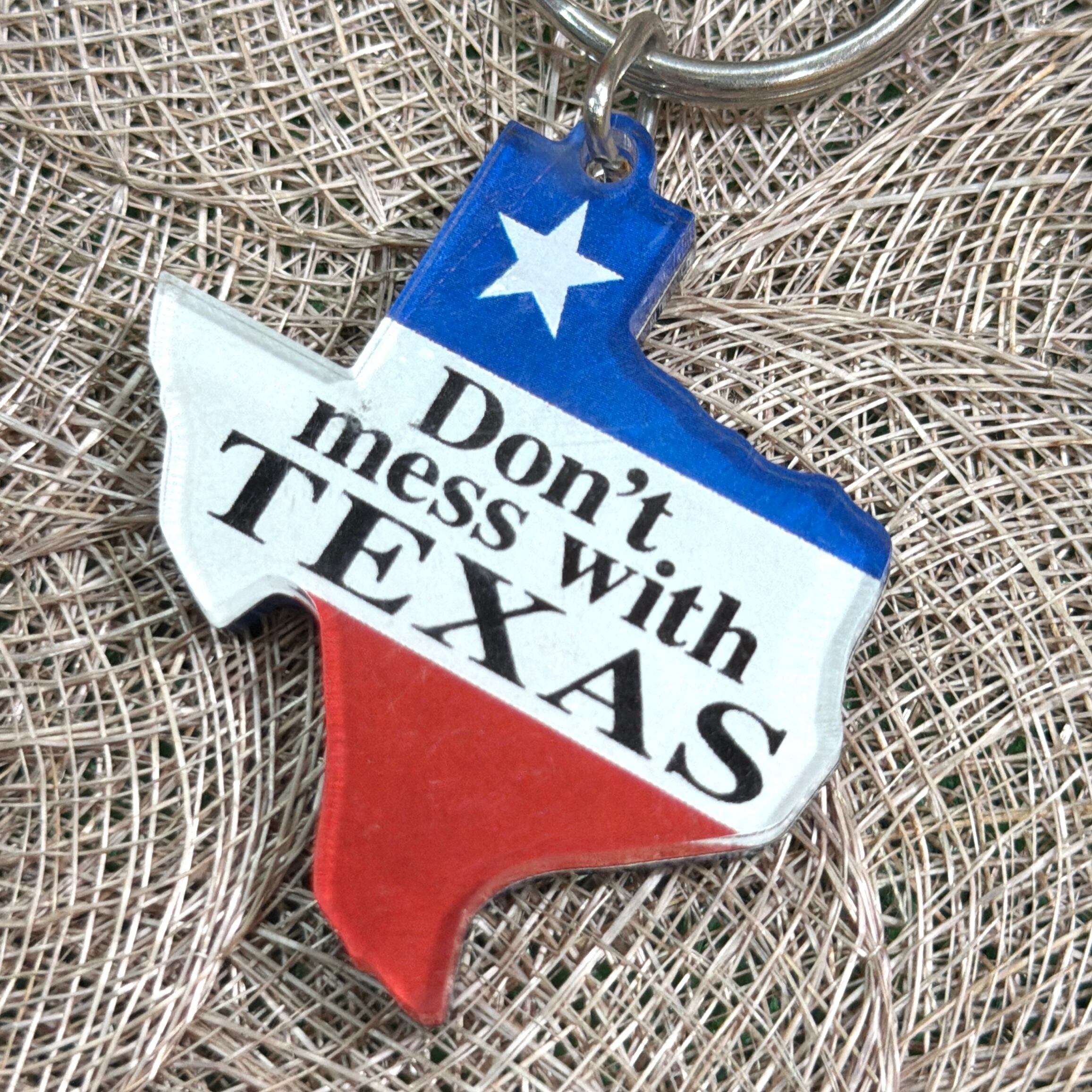 州旗カラーのレッド・ホワイト・ブルーに、テキサスの有名スローガン “Don’t mess with TEXAS” の文字入り。この言葉は1980年代の「ポイ捨て防止キャンペーン」をきっかけに広まり、現在では“テキサス魂”を象徴するフレーズとして親しまれています。