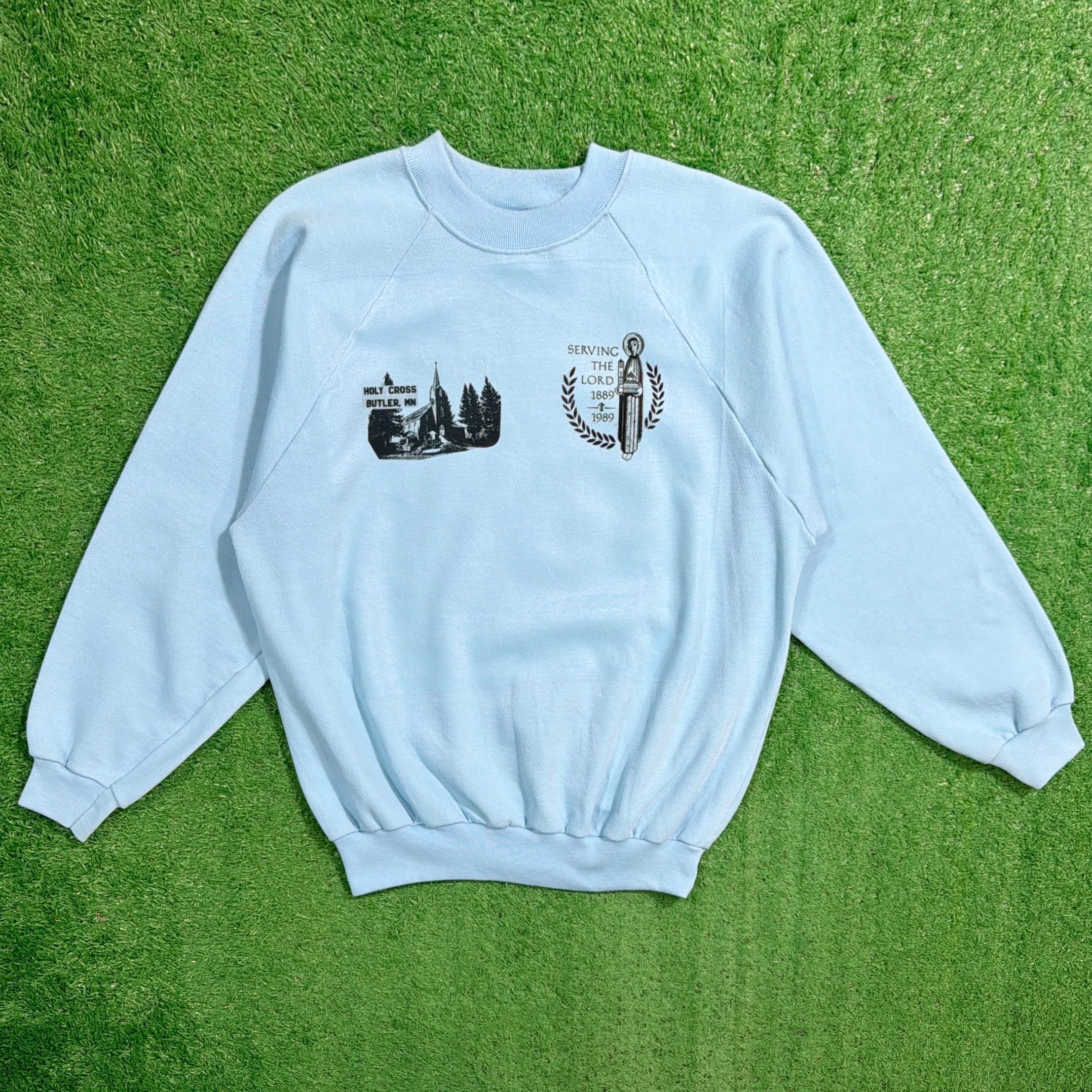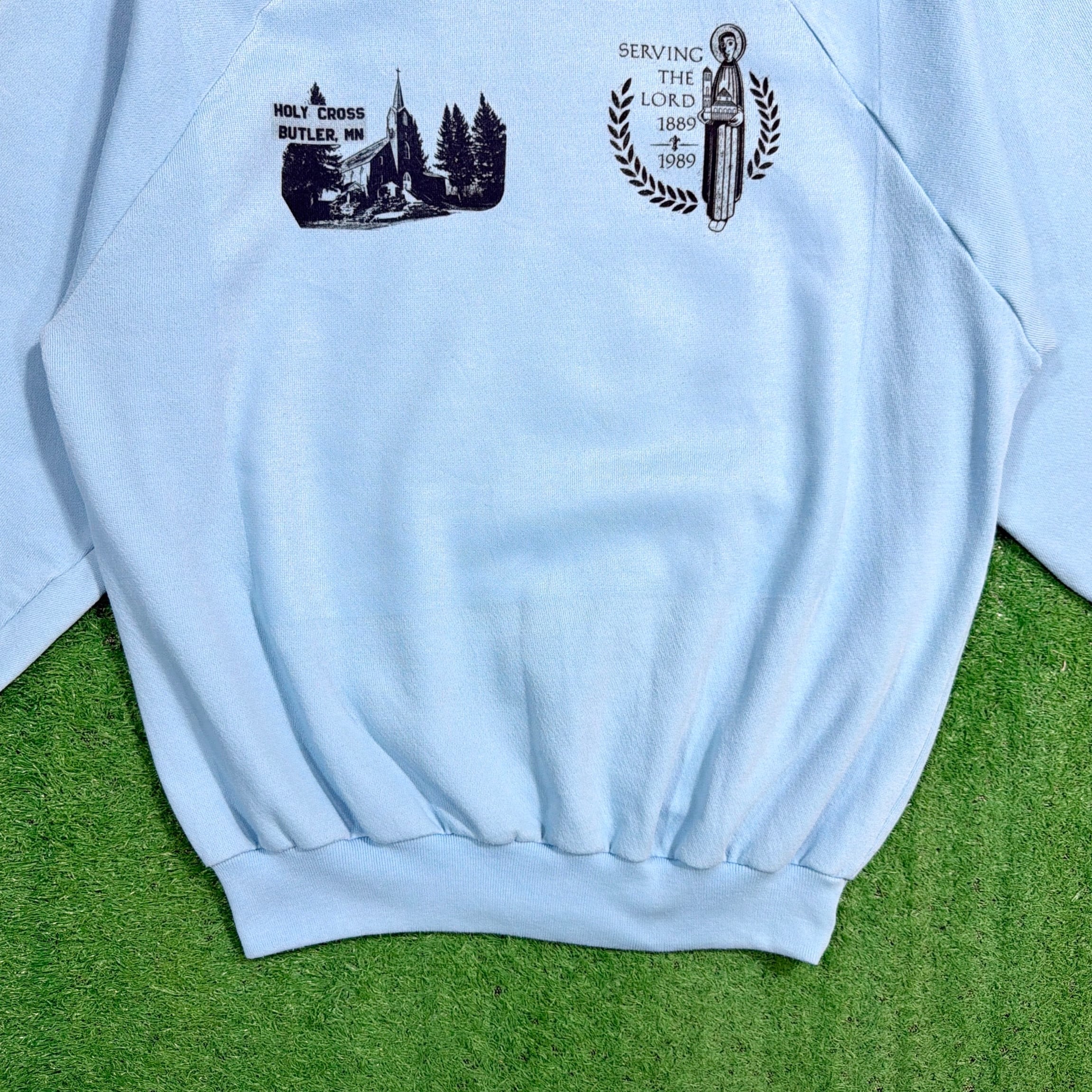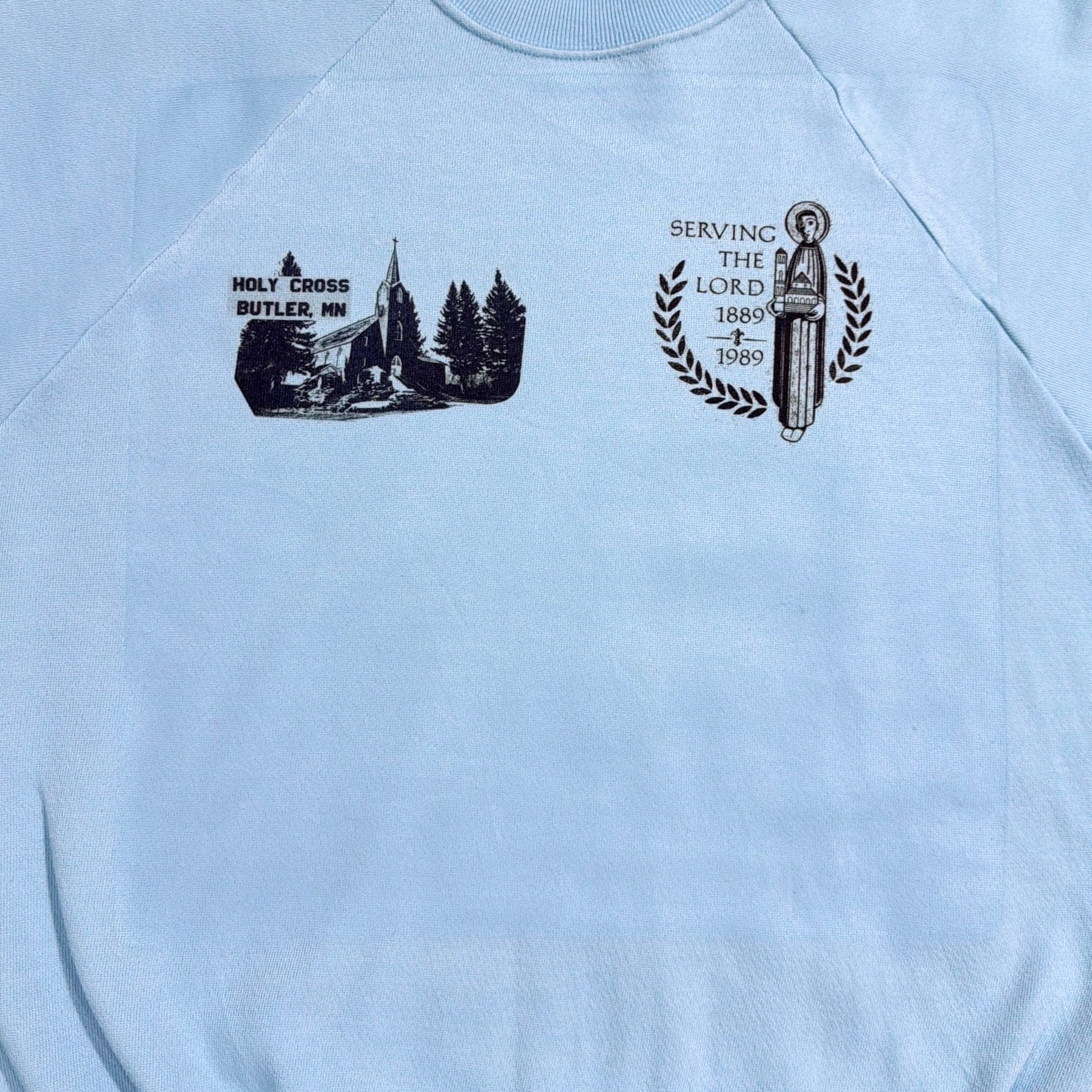 フロントには ミネソタ州バトラー(BUTLER, MN)にある “Holy Cross Catholic Church(ホーリークロス教会)” のイラスト と、“SERVING THE LORD 1889–1989” の記念ロゴ がプリントされています。創立100周年(1889〜1989)を記念して作られた、イベント系アニバーサリースウェットの一枚です。